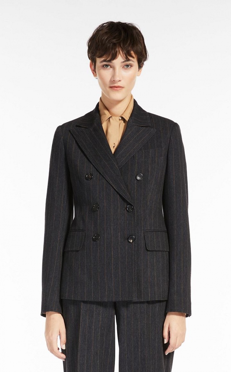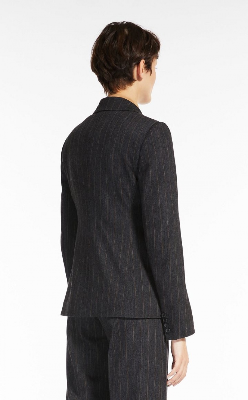 Double-breasted fitted blazer made of soft stretch cotton and wool jersey with a pinstriped denim effect texture. Featuring a peak lapel collar, long set-in sleeves, breast pocket and front welt pockets with flap. Semi-lined style in monogram fabric, finished with sartorial pick stitch. Button fastening. Length: 65 cm.
