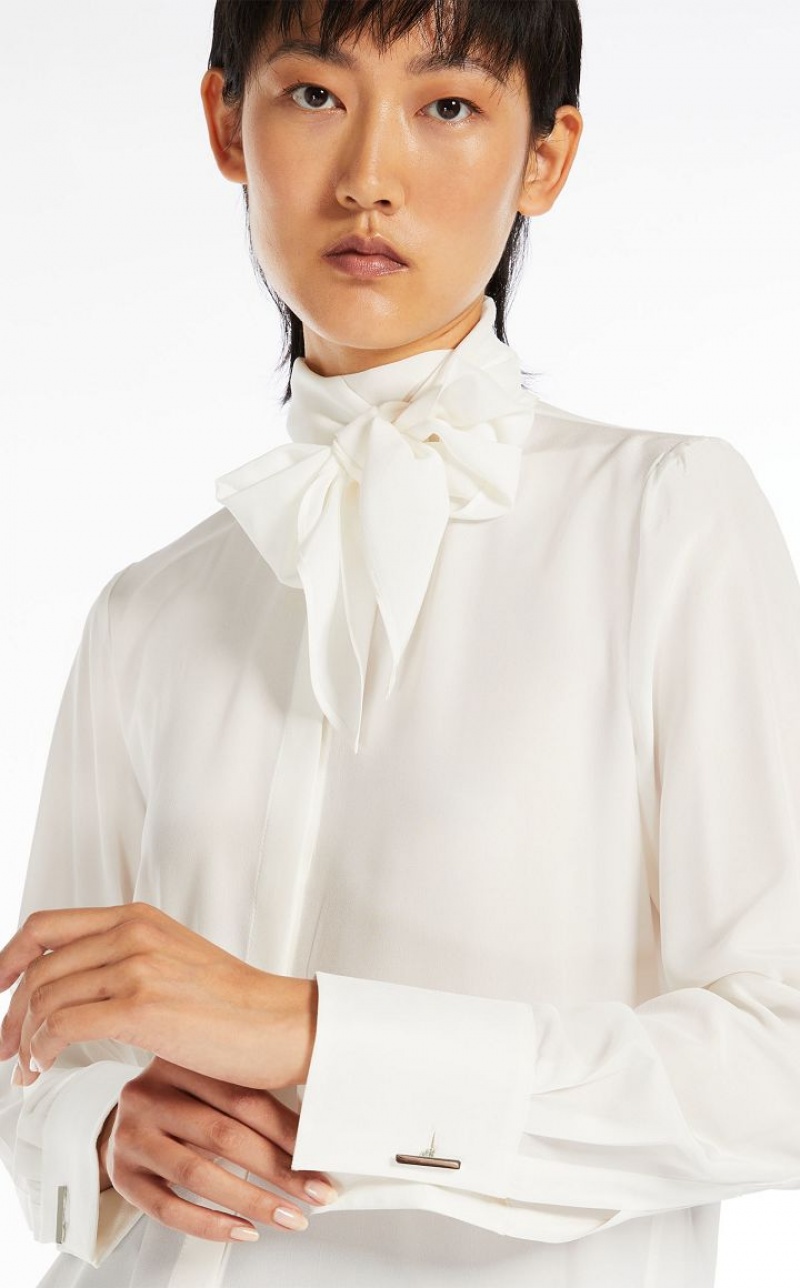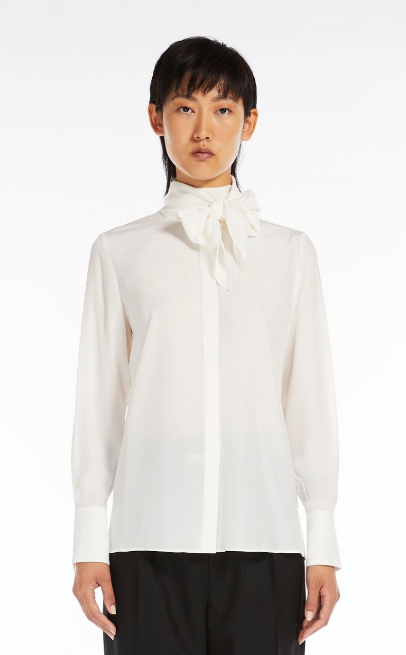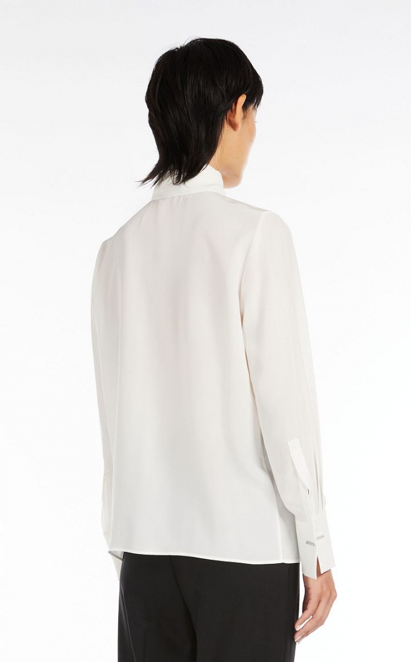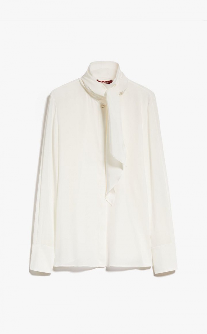 Shirt in fine pure silk crêpe de Chine, featuring a foulard collar to tie in a bow and long sleeves with wide French cuffs. Concealed button front fastening. Length: 64 cm.