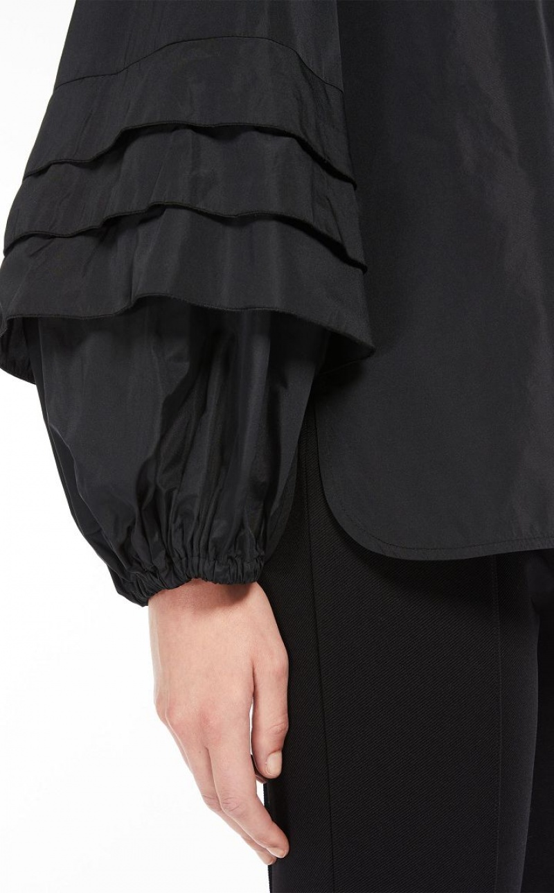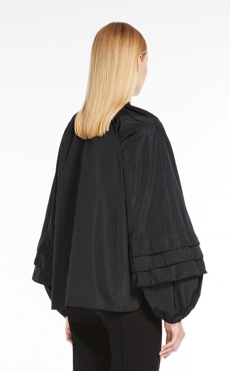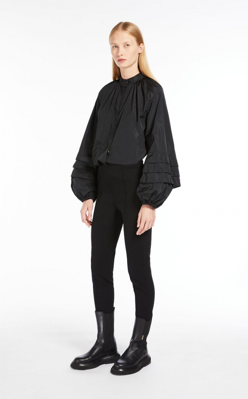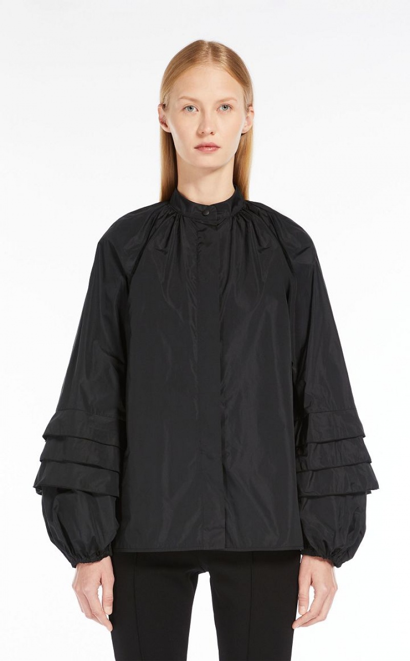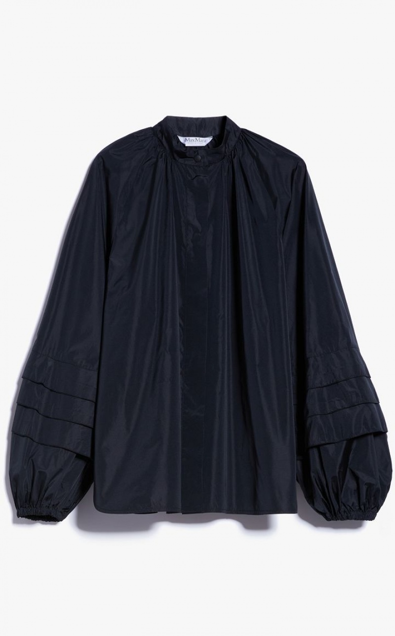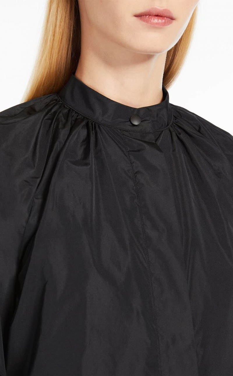 Feminine shirt in exquisite silk-blend taffeta, featuring large puff sleeves with pleated motif on the hem and elasticated cuffs. Relaxed fit with a mandarin collar, gathered motif on the yoke and rounded hem with side slits. Concealed snap-button fastening. Length: 66 cm.