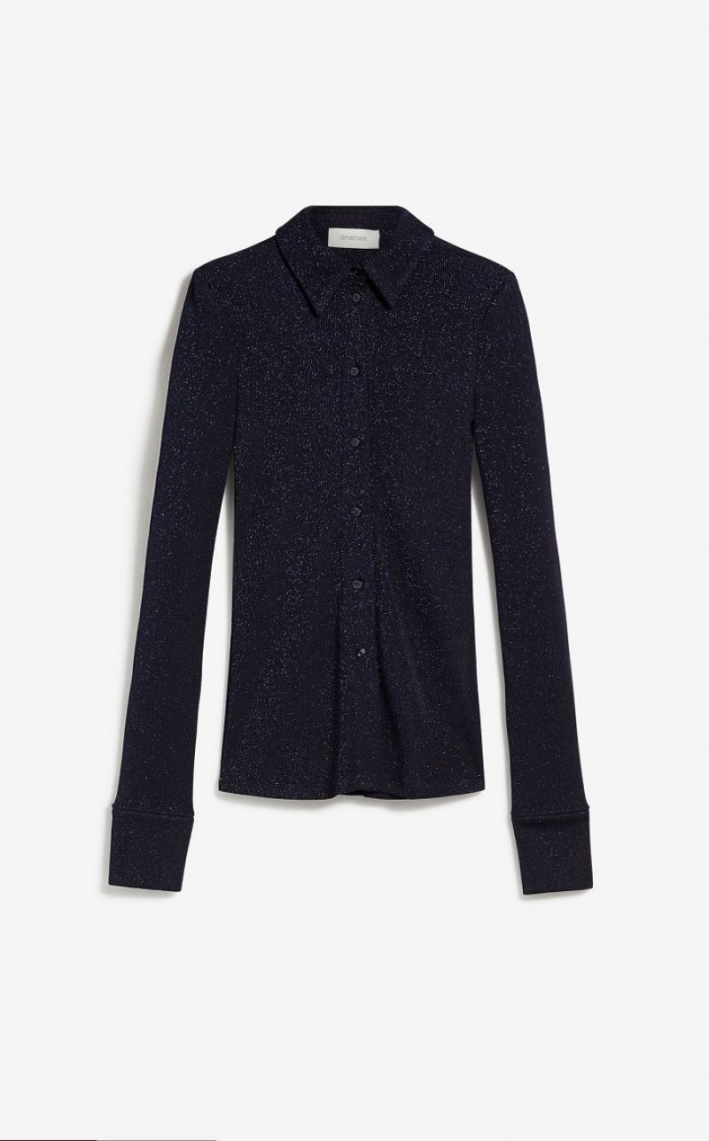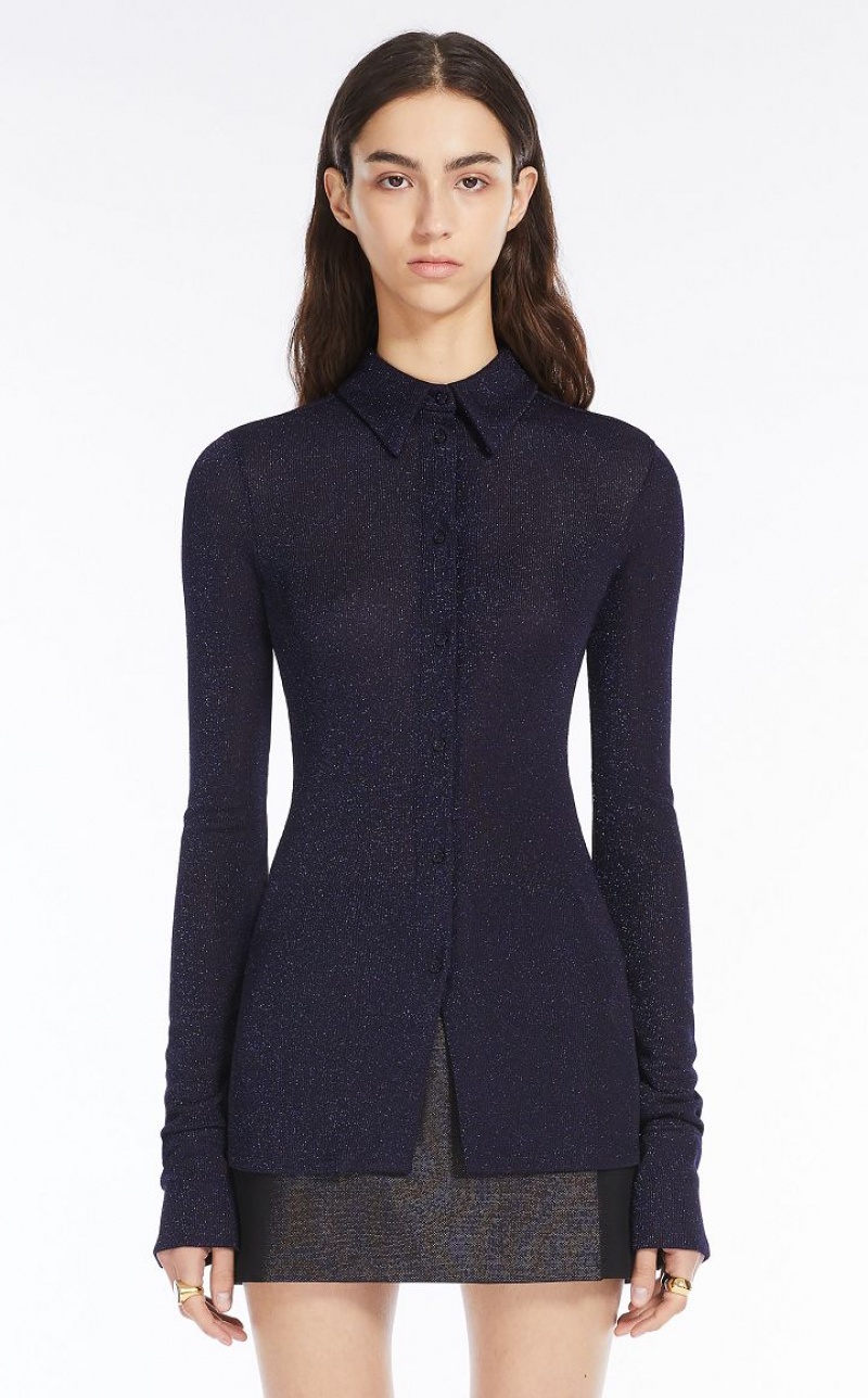 Rib-knit jersey shirt with a lurex yarn running through it for a sparkling effect. Flattering, figure-hugging feminine fit. Long sleeves, wide cuffs and visible front buttoning.