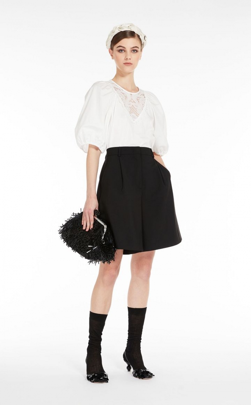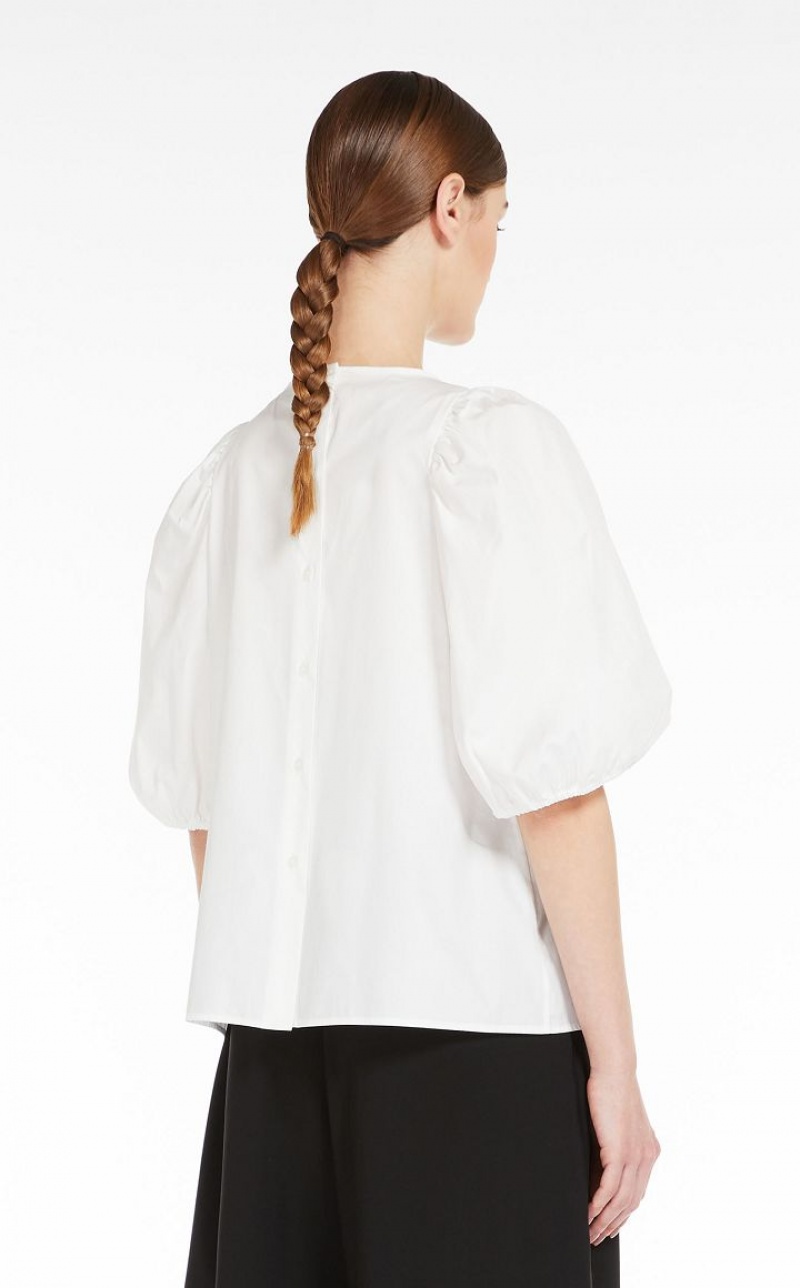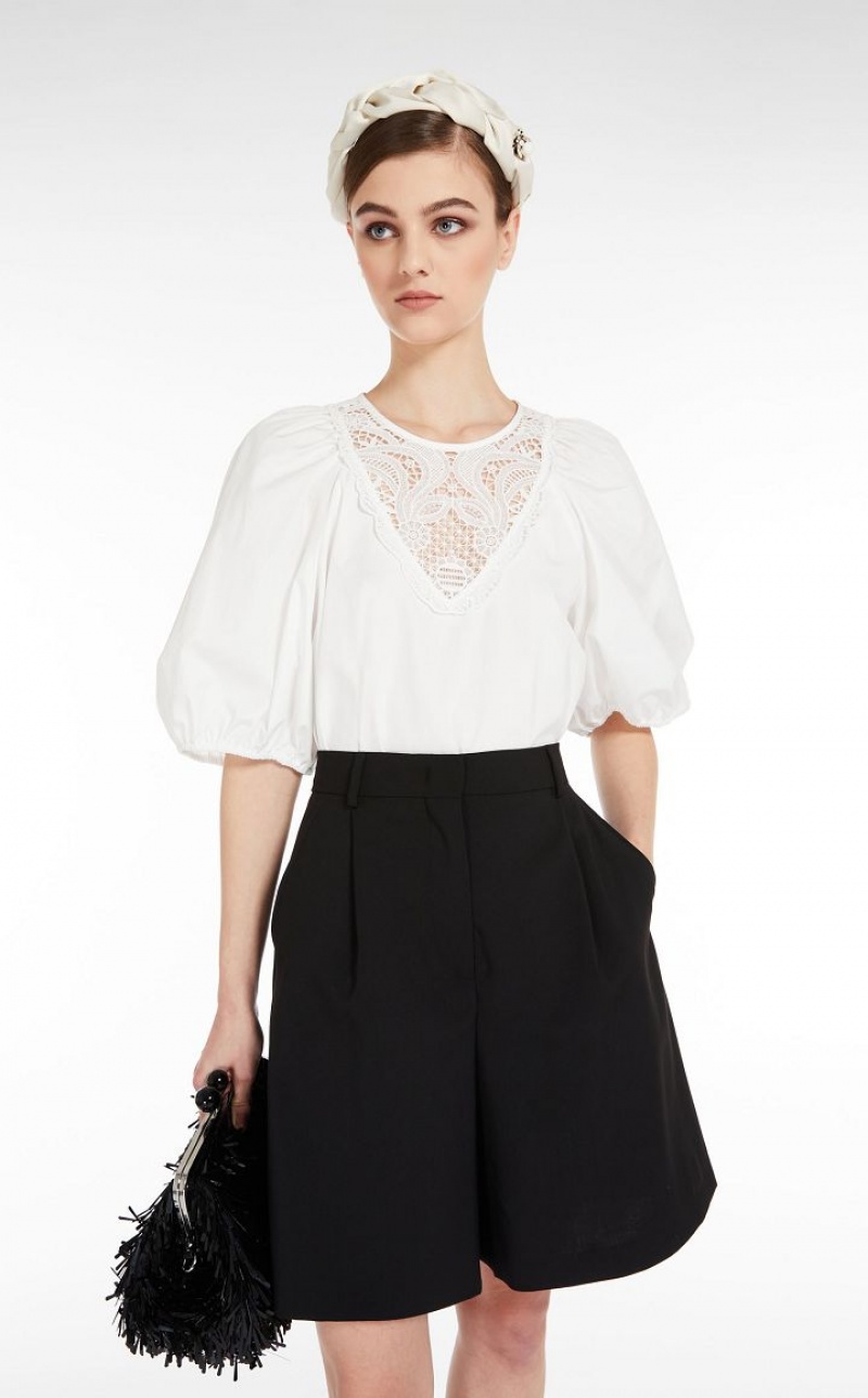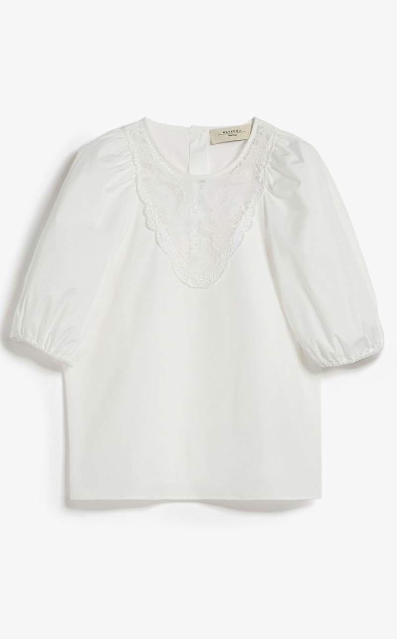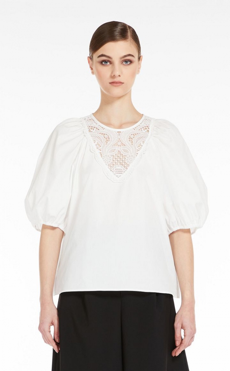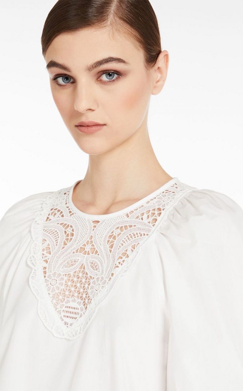 Blouse in pure cotton poplin embellished with delicate macrame embroidery sewn to the front. This style features a round neck, short puffed sleeves and gathering at the hem. Rear fastening with mother-of-pearl buttons. Length: 53 cm.