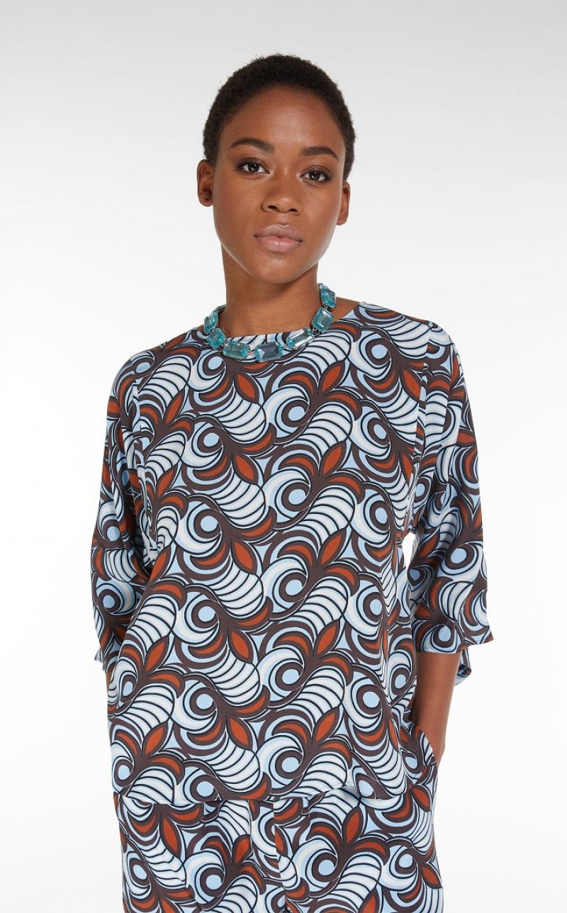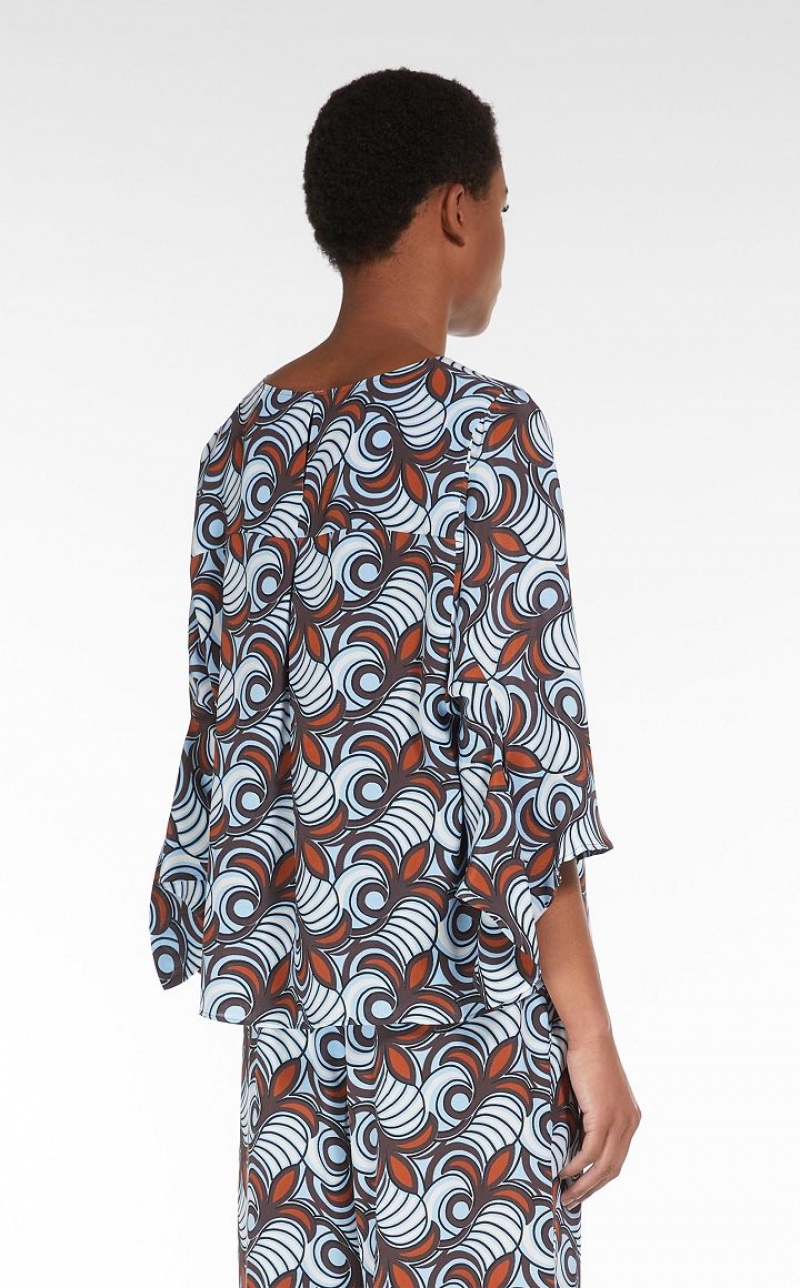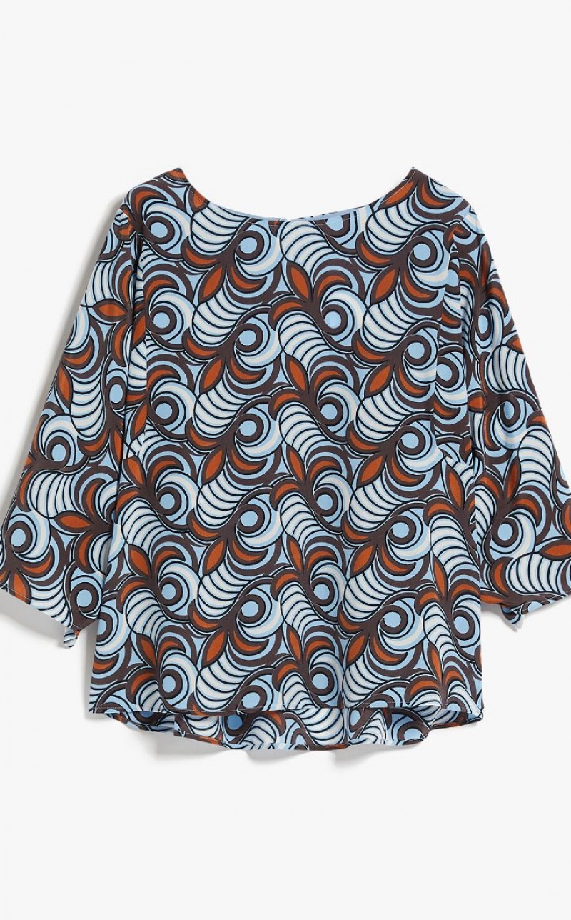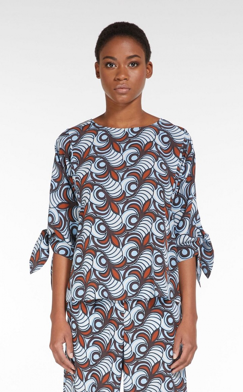 Round-neck blouse with a slightly flared line in luxe printed pure silk crepe de chine. This style has 3/4 sleeves with bow at the wrist. Teardrop fastening on the back with small button. Length: 58 cm.