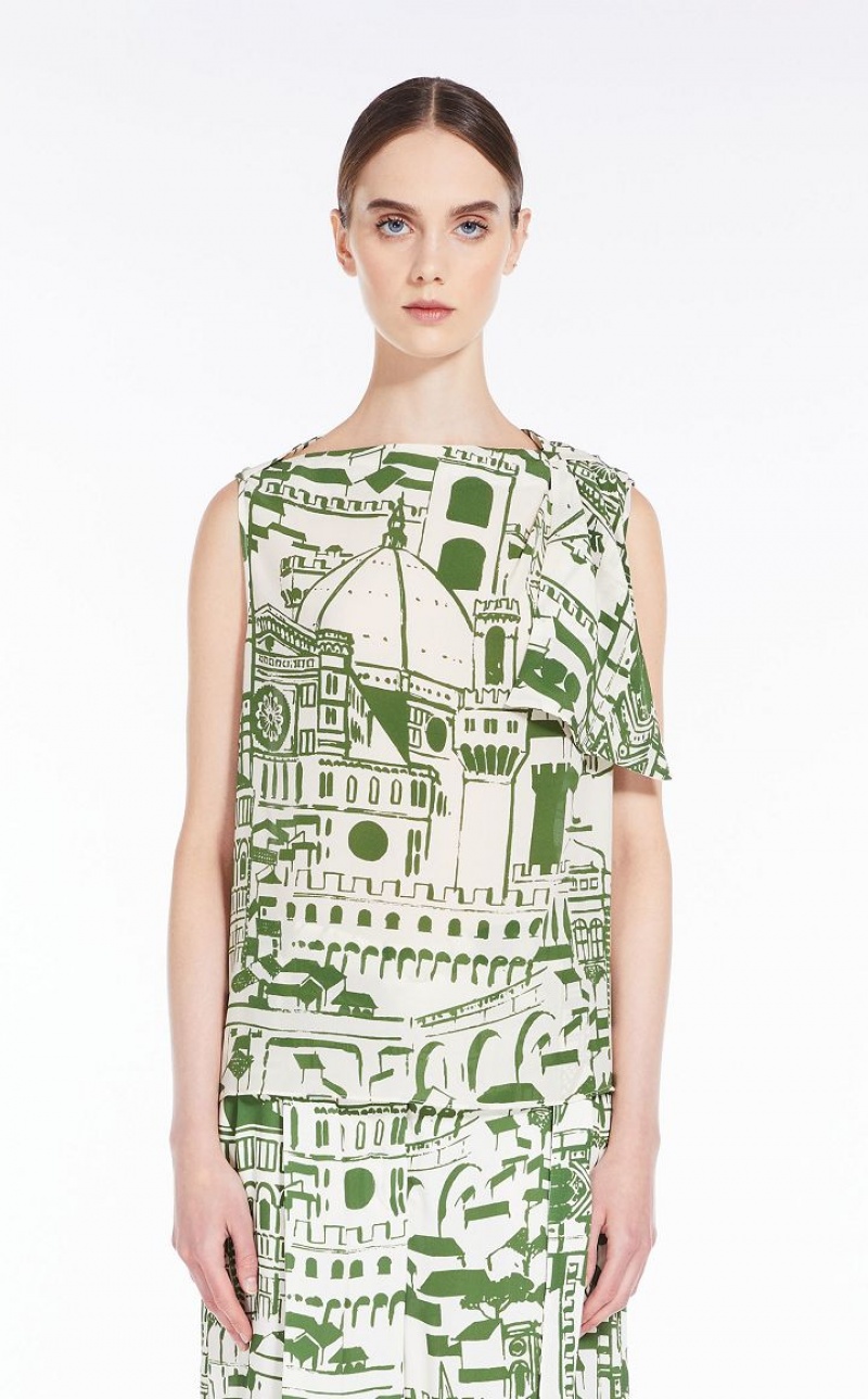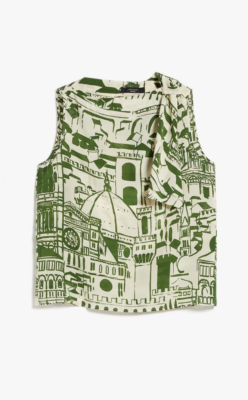 Sleeveless top on luxe pure silk crepe de chine, with all-over print motif. The fluid silhouette and minimal design are enriched by a knot motif with soft draping on the left shoulder.