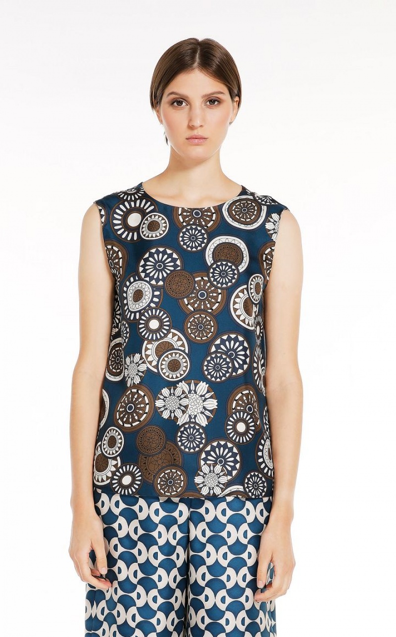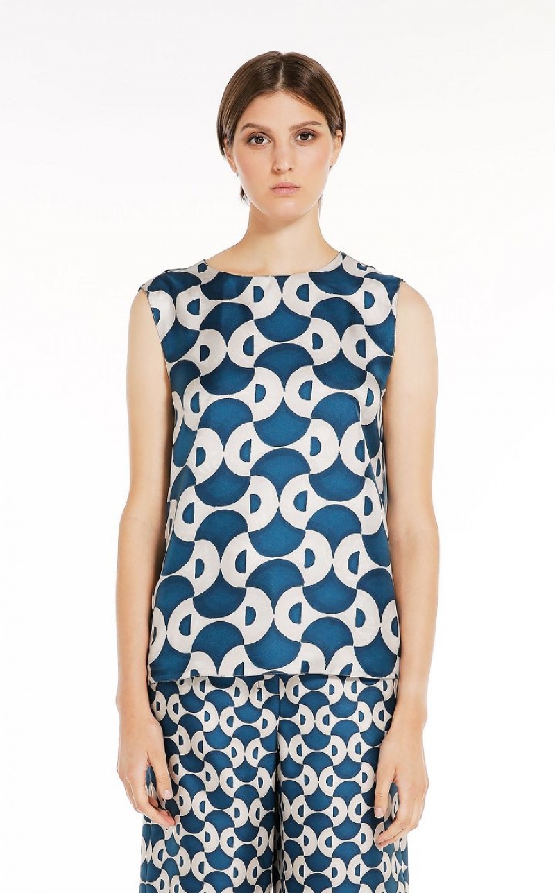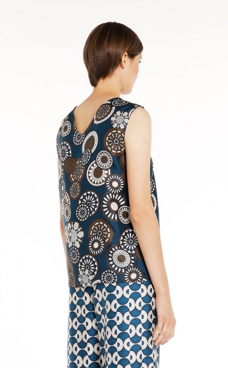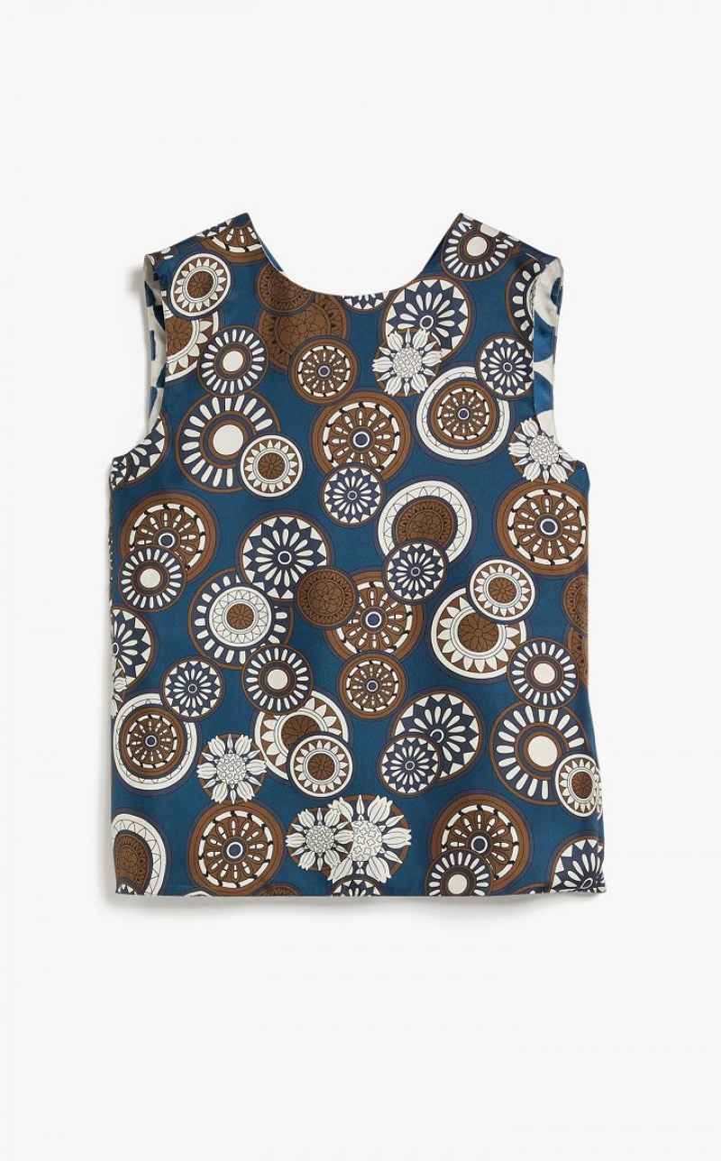 Reversible sleeveless top in fine printed pure silk twill fabric. The straight-fit model boasts a crew-neck front and small V-neck back, in addition to a small side slit-embellished hem. Length: 61 cm.