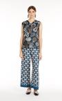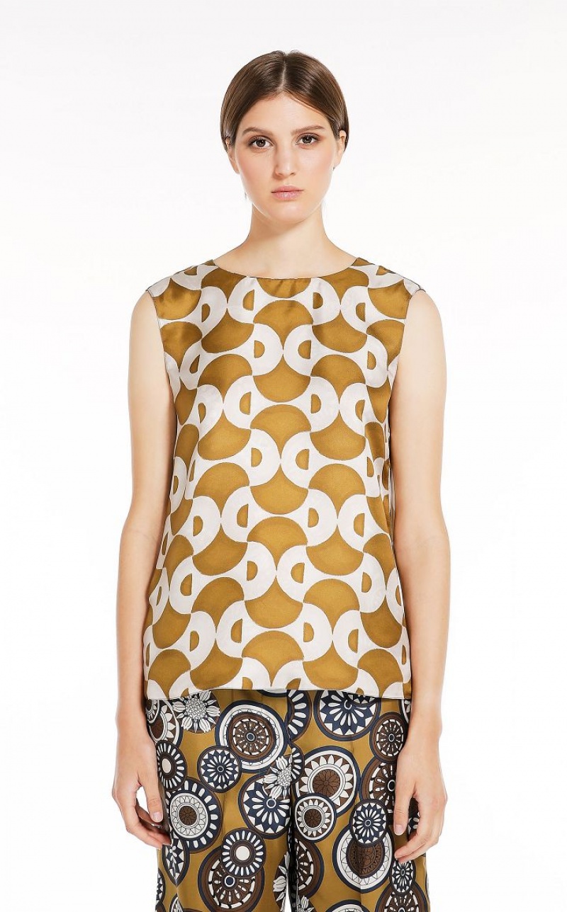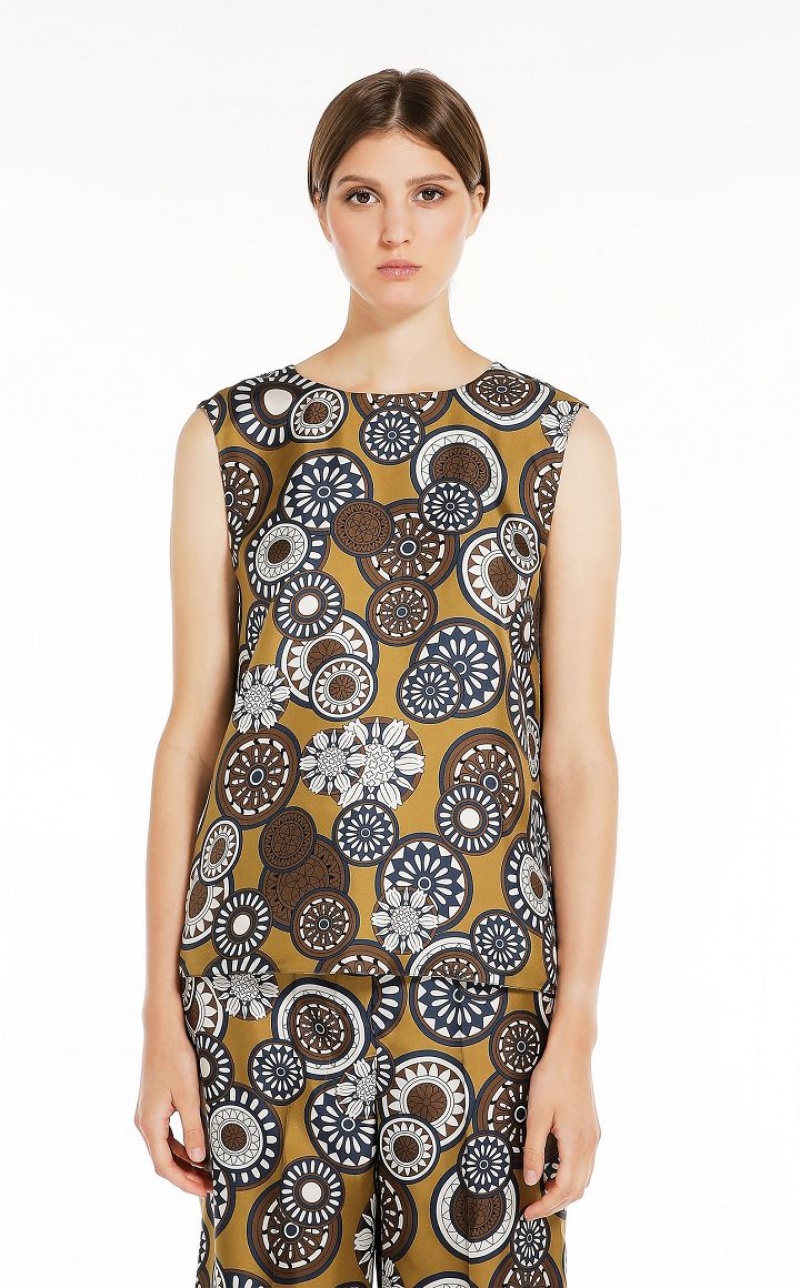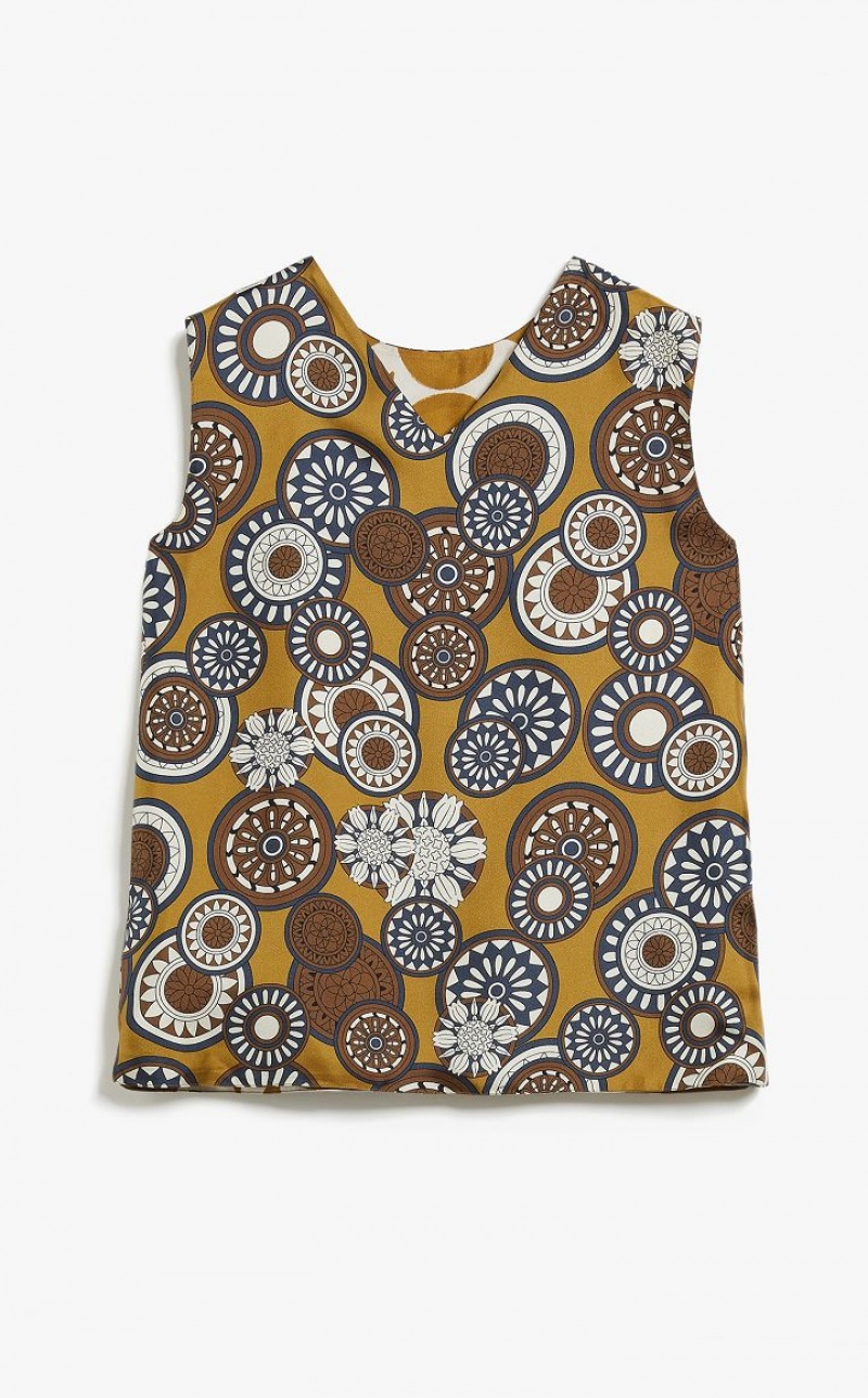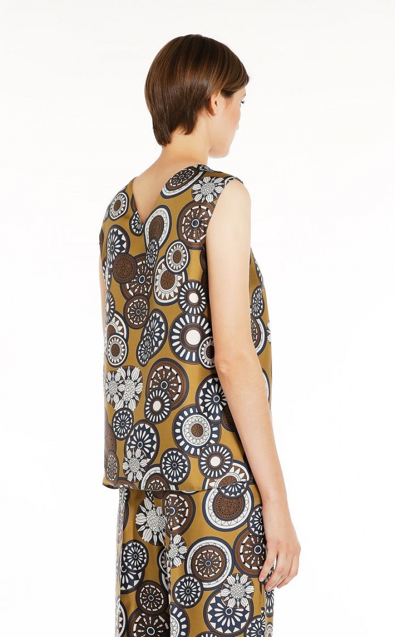Reversible sleeveless top in fine printed pure silk twill fabric. The straight-fit model boasts a crew-neck front and small V-neck back, in addition to a small side slit-embellished hem. Length: 61 cm.