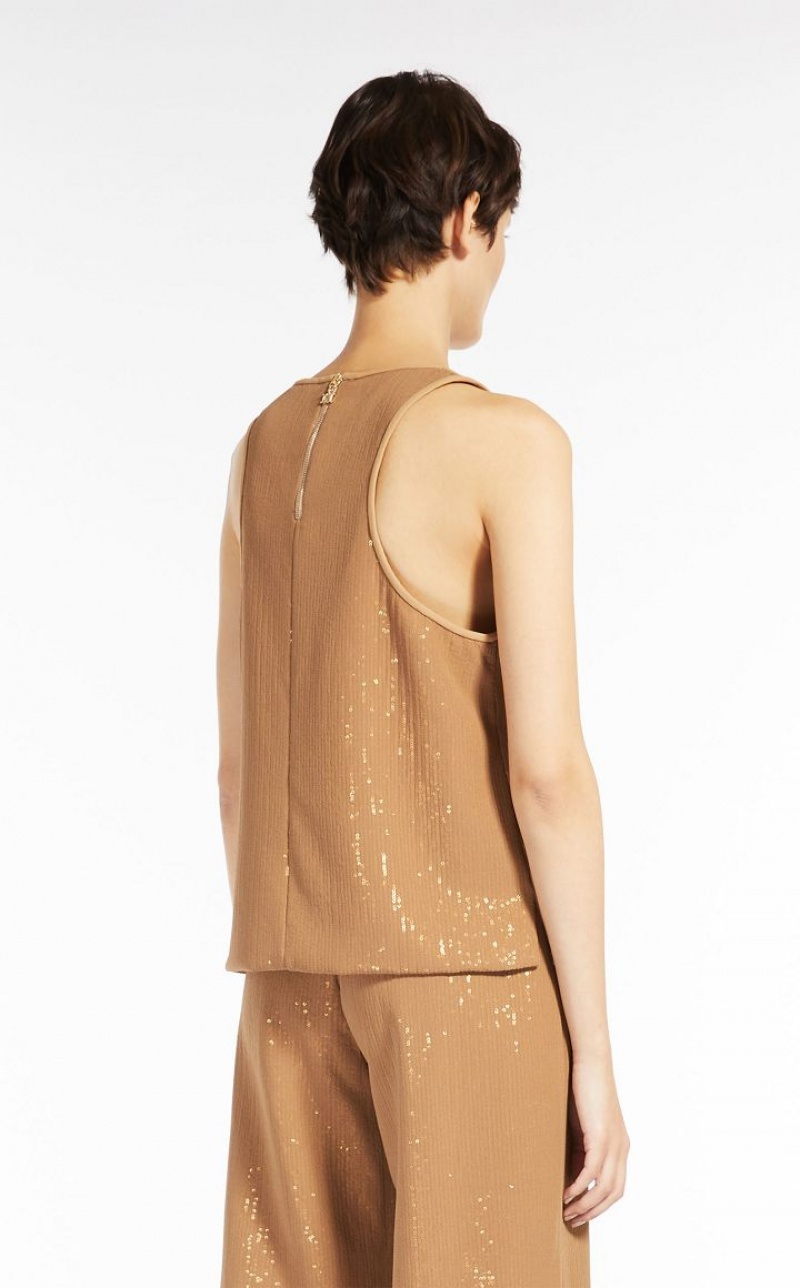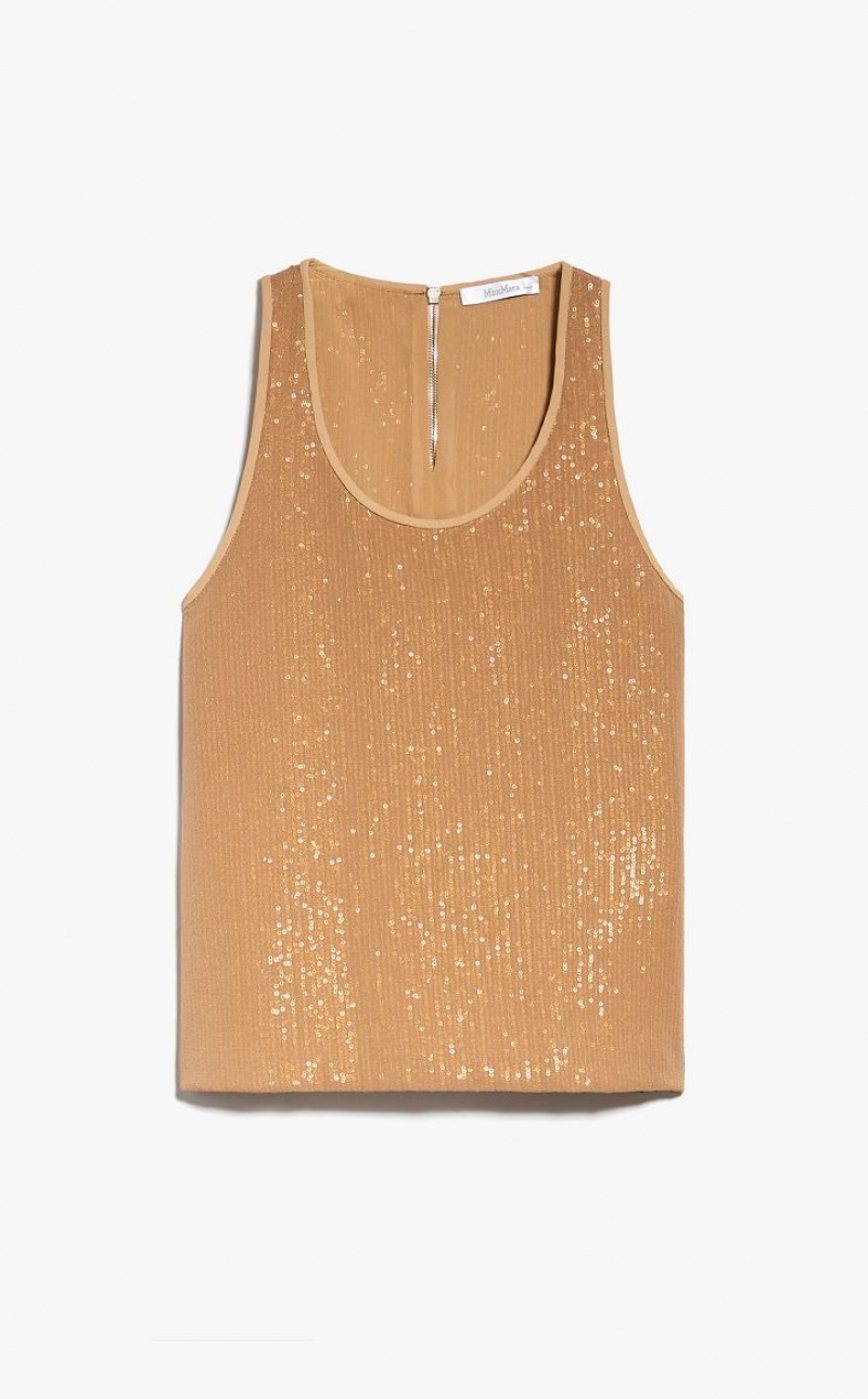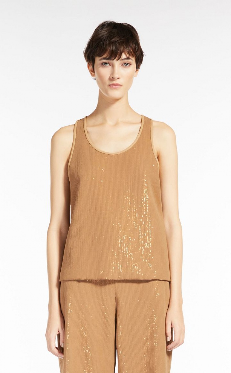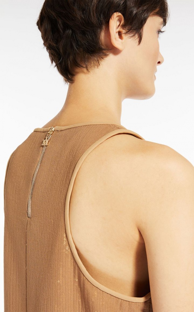 Fitted sleeveless top with all-over embroidered micro sequins, covered with an airy georgette veil that creates an elegant diaphanous effect. Style featuring wide round neckline and side vents on the hem. Zip fastening on the back and MaxMaraGram customised slider. Length: 62 cm.