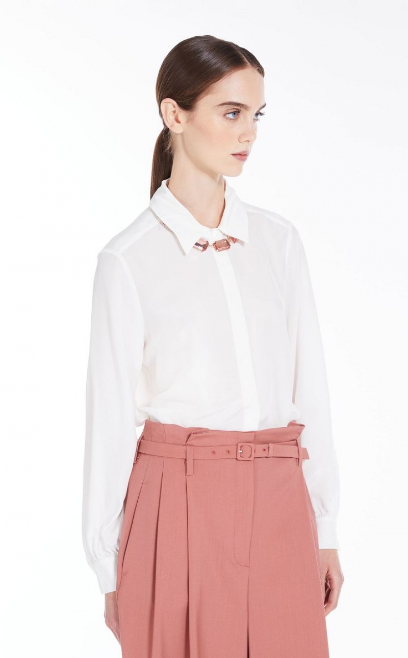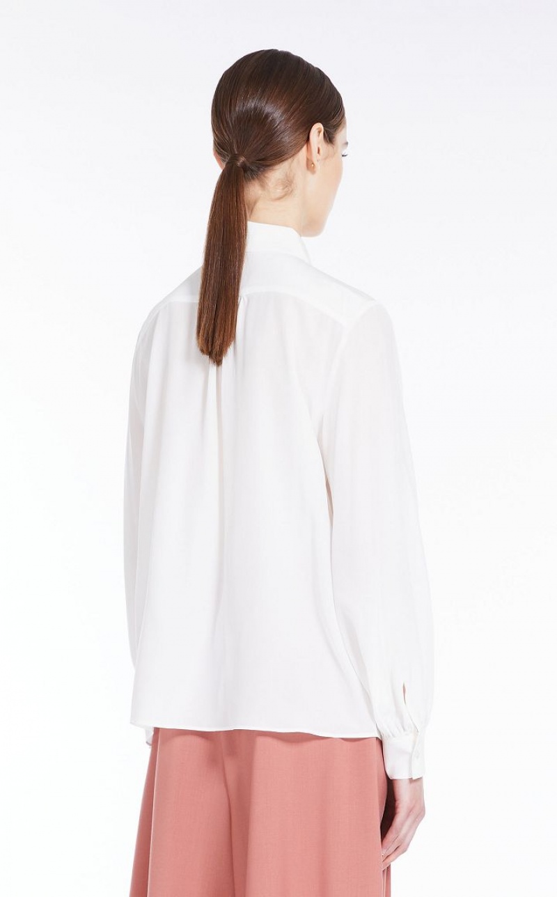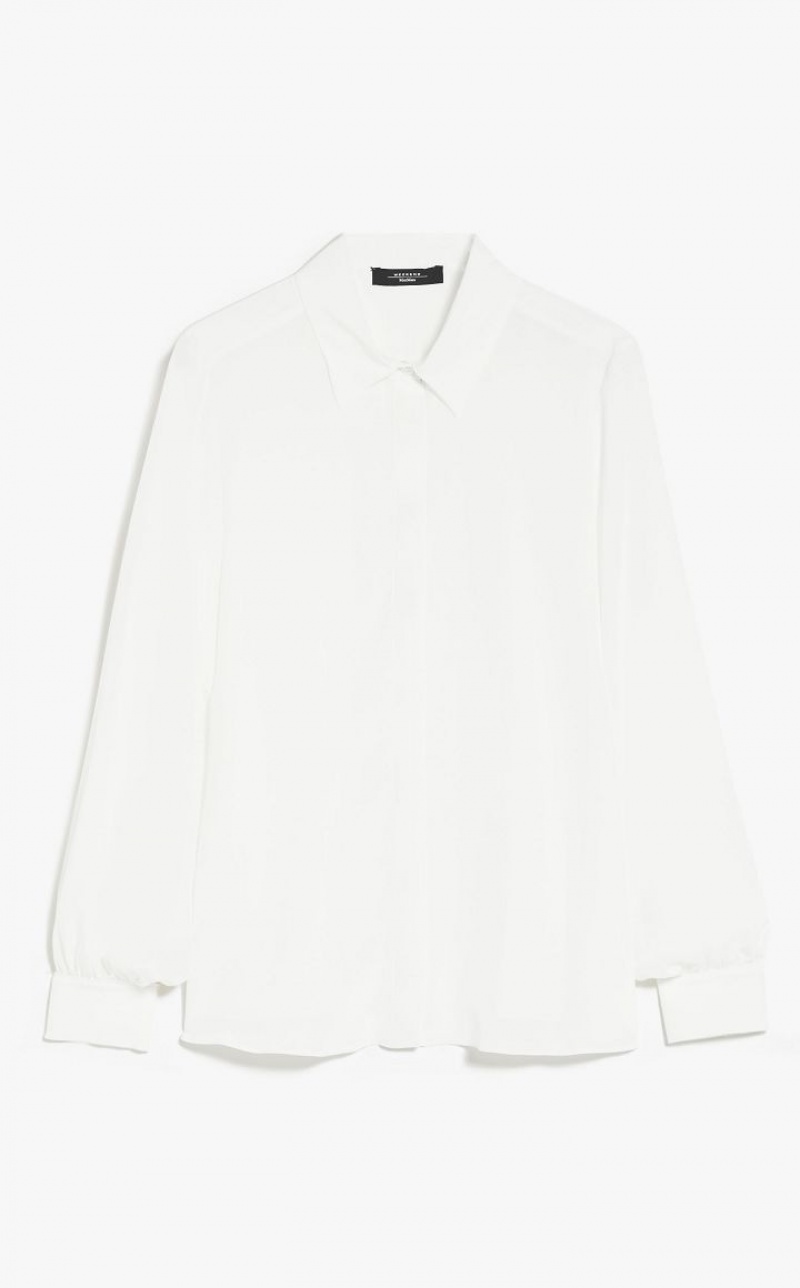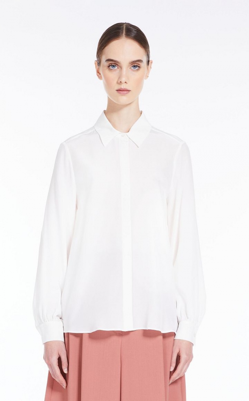 Shirt in luxe washed pure silk crepe de chine, with a straight cut and rounded hem. This style features a classic collar and long, slightly gathered sleeves with cuffs. Fastening with concealed mother-of-pearl buttons. Length: 65 cm.