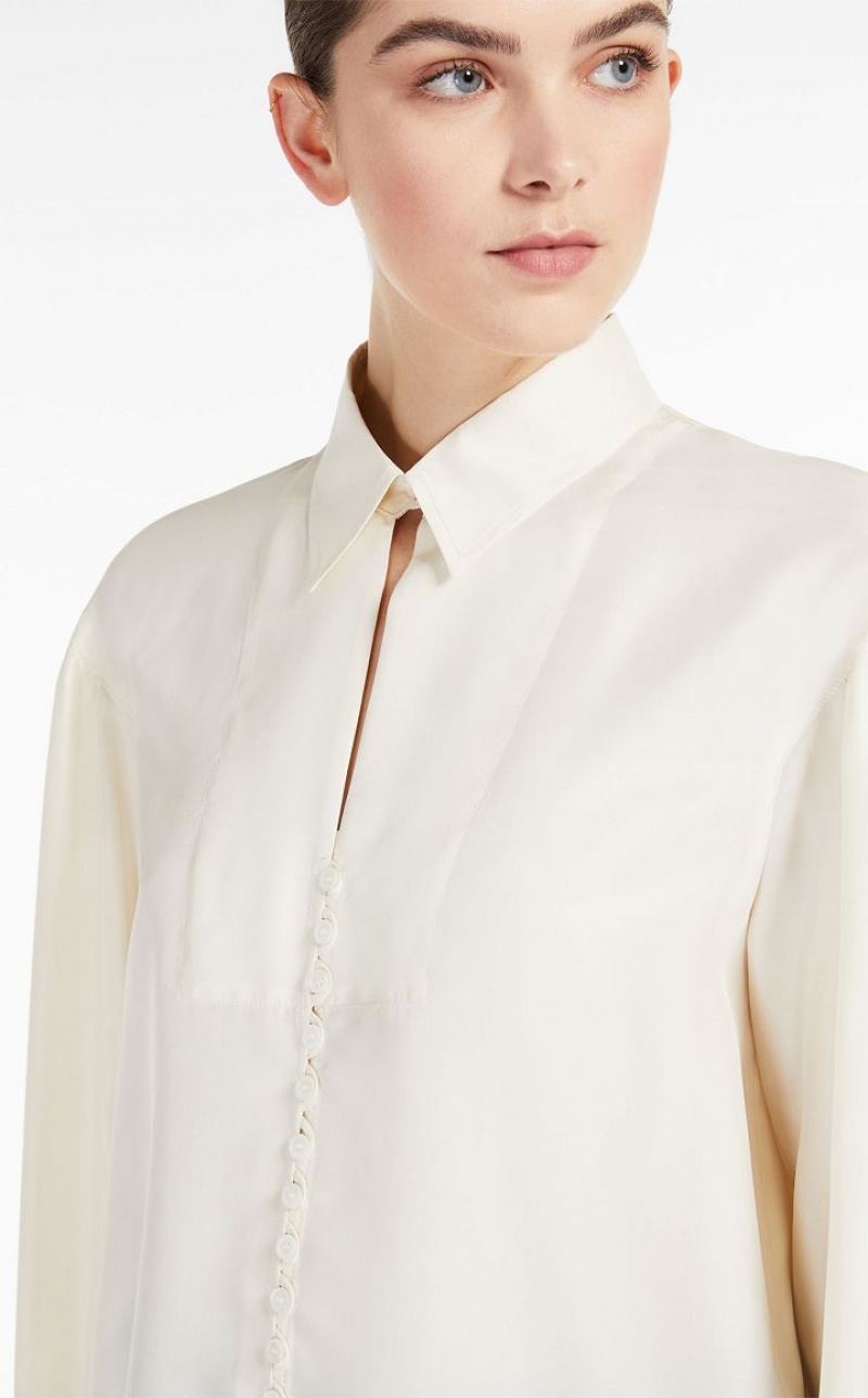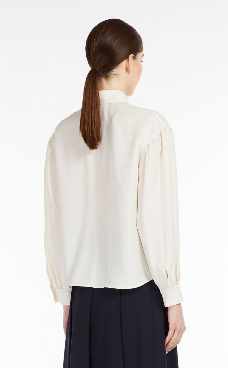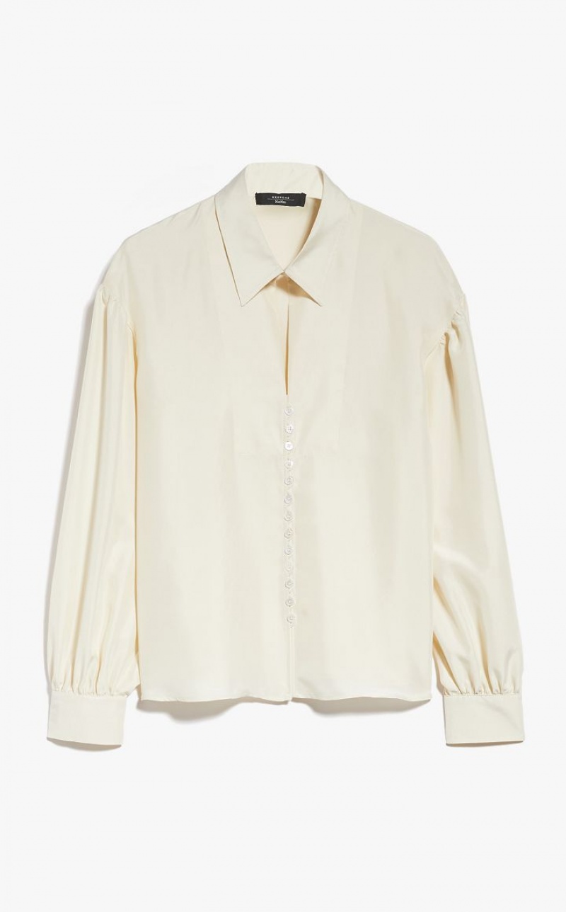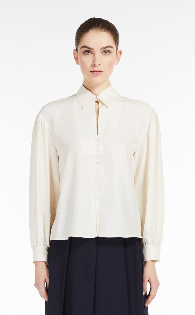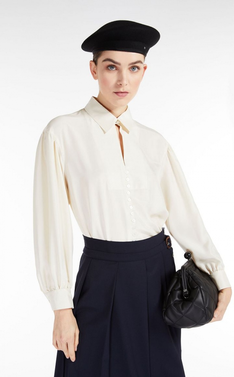Relaxed fit pure silk shirt. Cuff adorned puff sleeves, a mother of pearl button fastening and a collar, complete with buttonhole and button detail. Length: 58 cm.