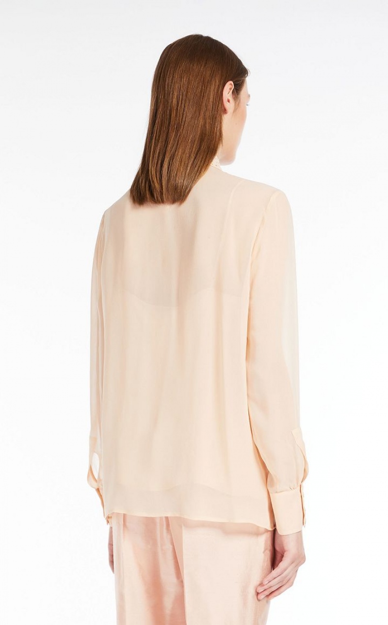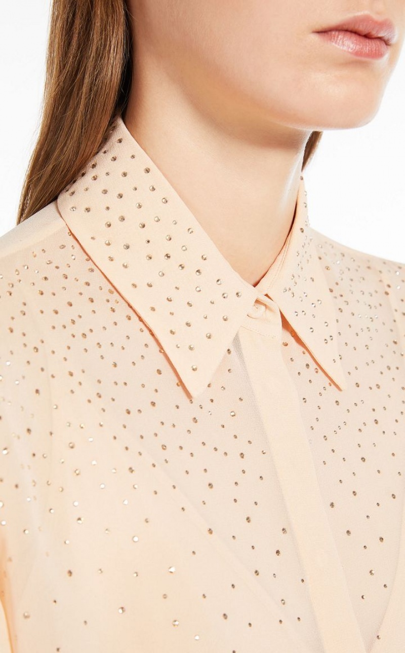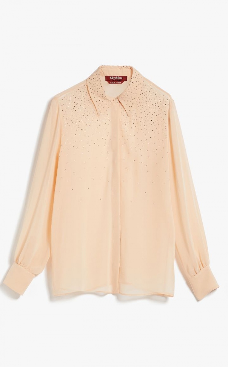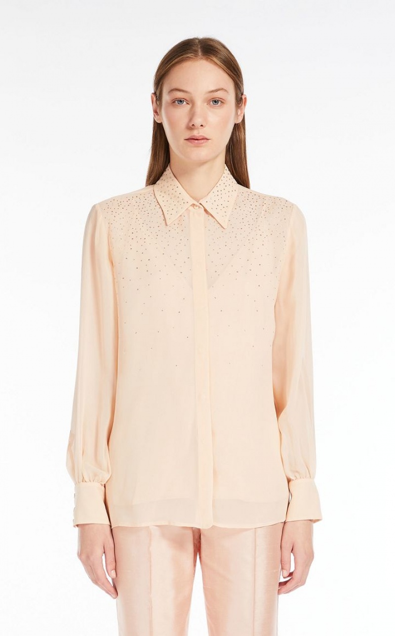 Elegant long-sleeved shirt in ultra-lightweight pure silk georgette fabric featuring a delicate rhinestone-embroidered front. Matching camisole top.