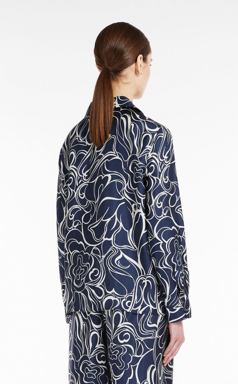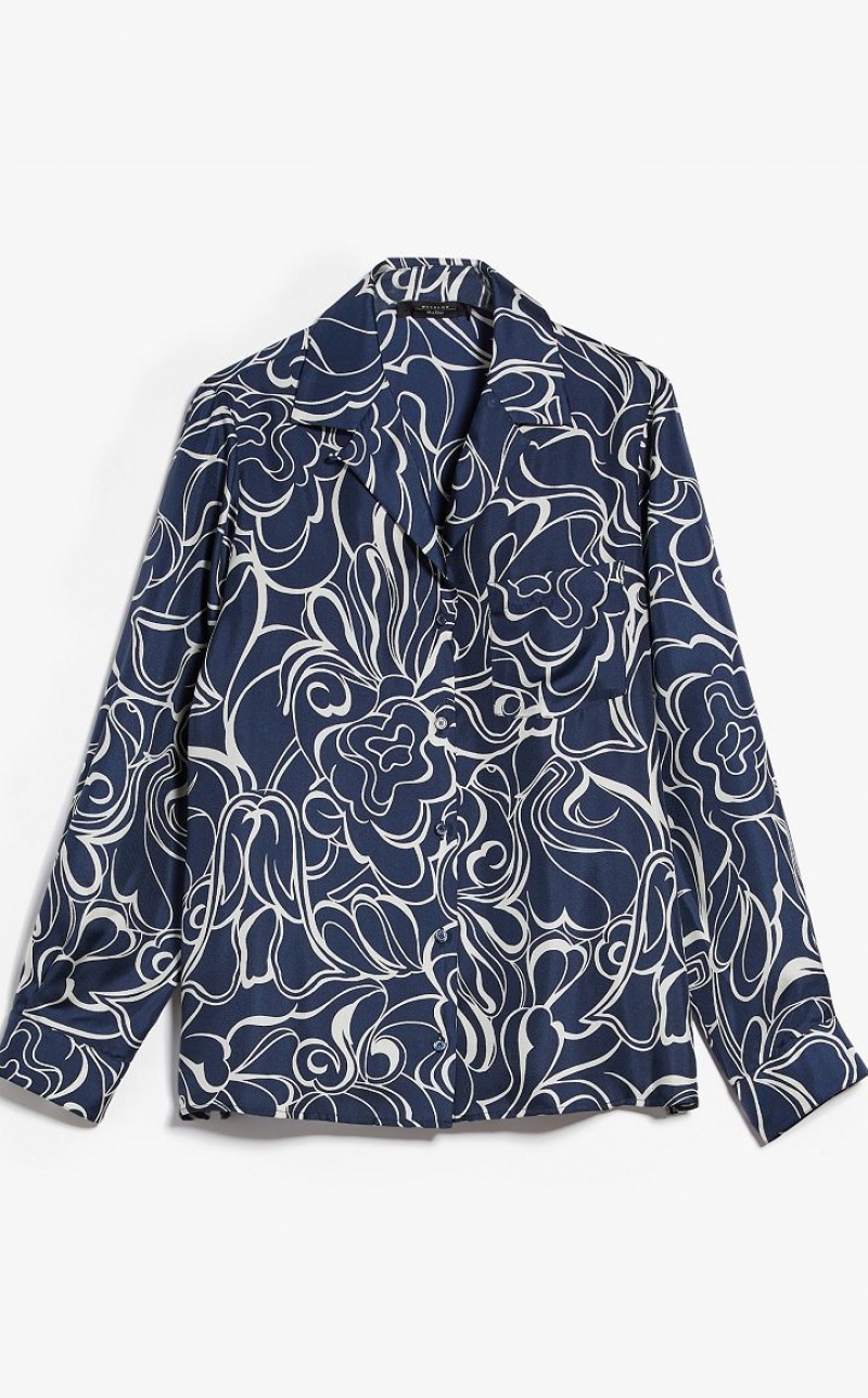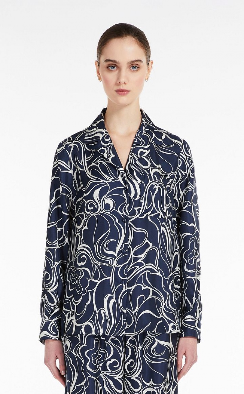 Straight fit shirt in printed pure silk twill fabric. Lapel collar, long cuffed sleeves, a breast pocket and side slit detail. Mother of pearl button fastening.