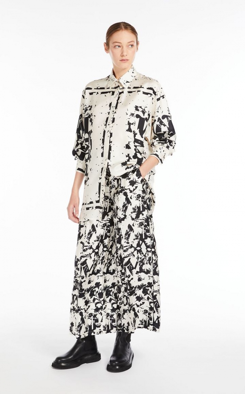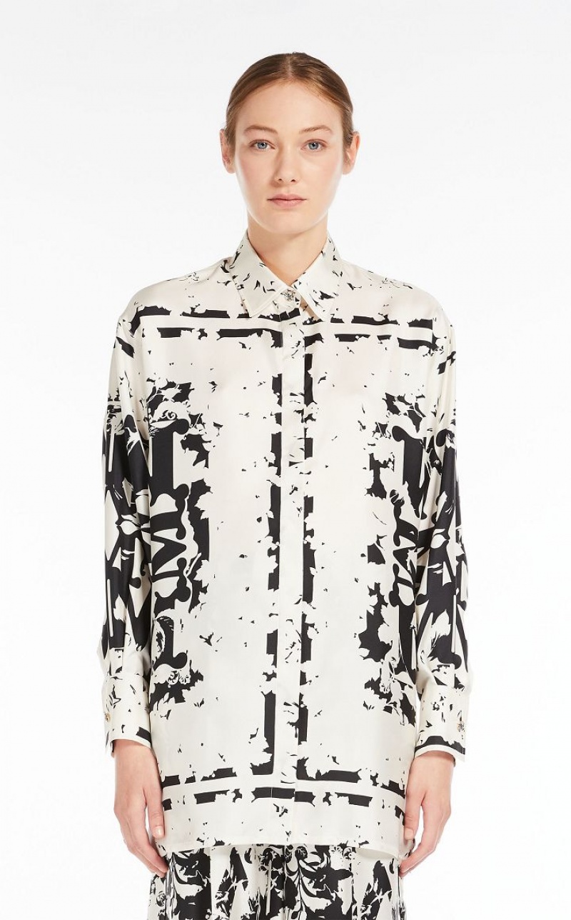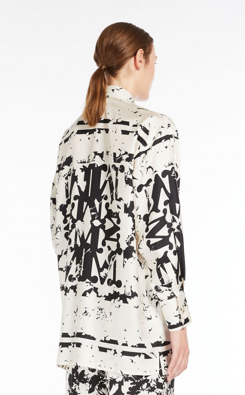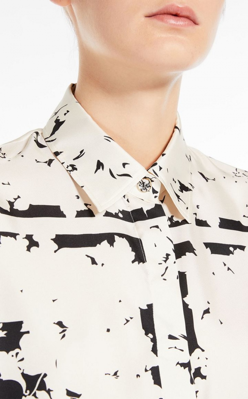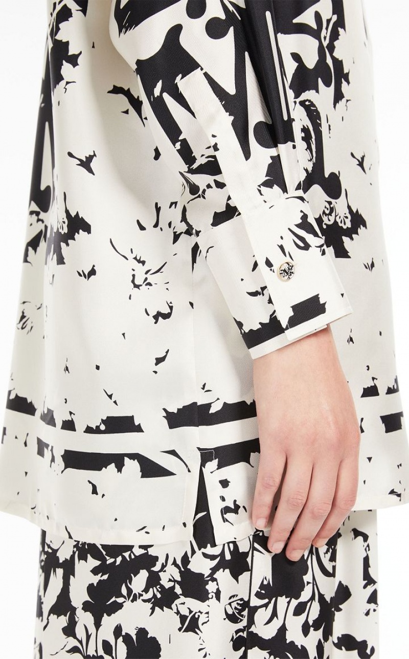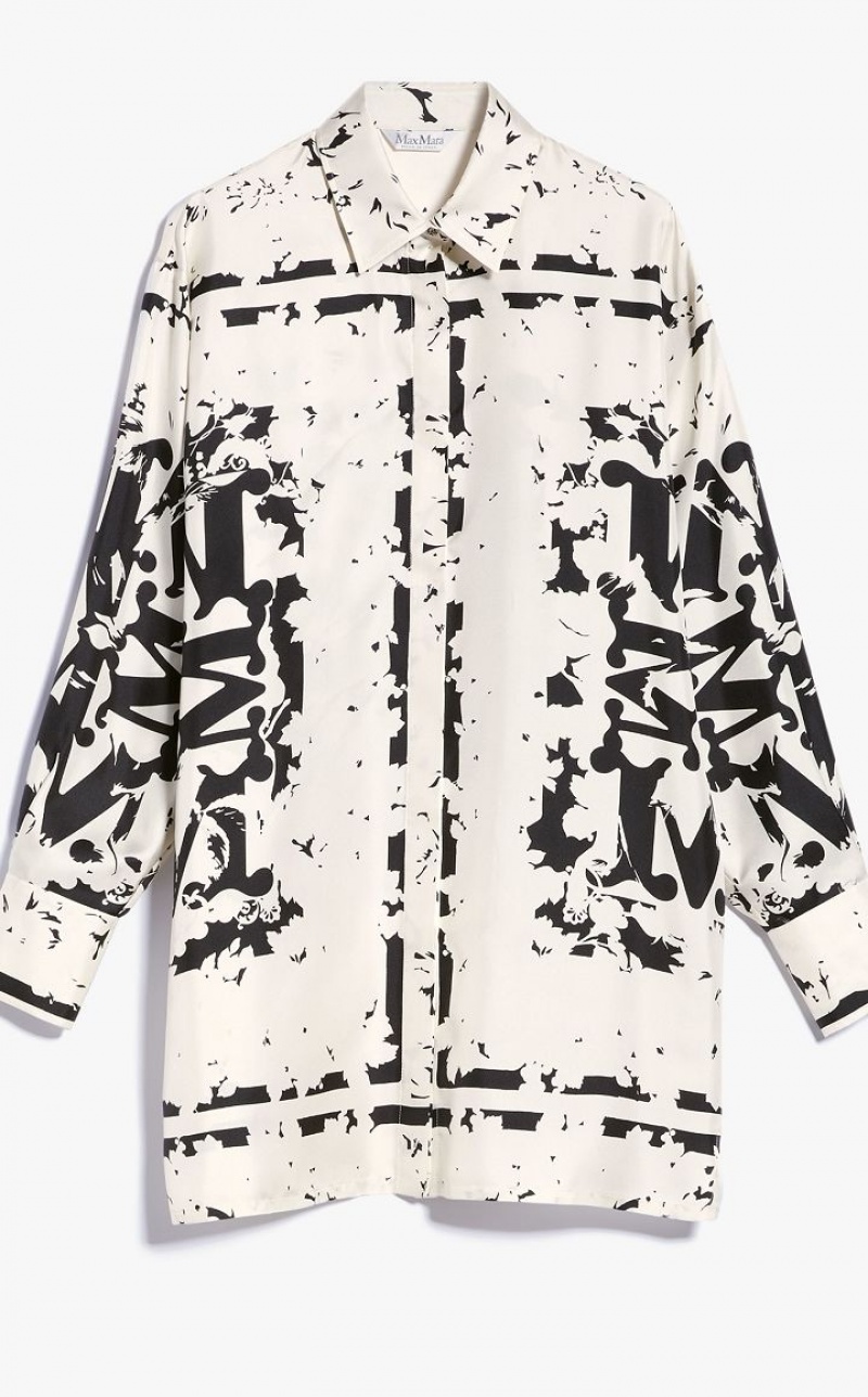 Long shirt in fine printed pure silk twill with a straight and fluid line and side slits at the hem. Wide volume model with classic pointed collar, long sleeves with dropped shoulders and deep cuffs closed by monogram button. Concealed button fastening at the front. Length: 80 cm.