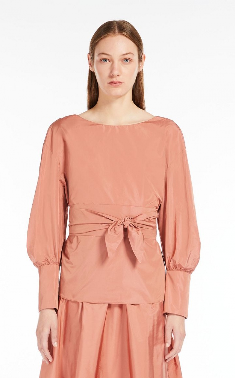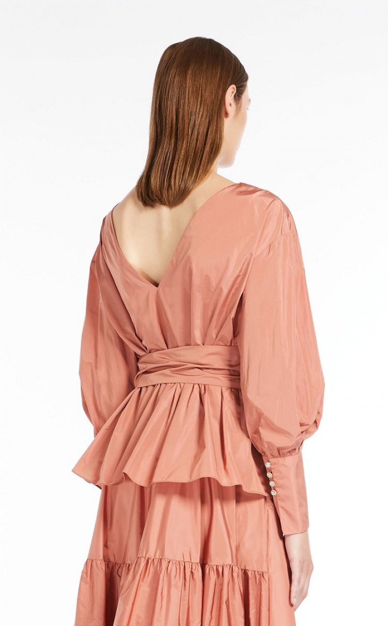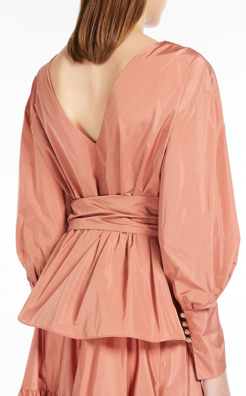 Couture-inspired blouse featuring long cuff-embellished balloon sleeves and a V-neck back. The taffeta model boasts a waistline-accentuating and highlighting matching belt. Length: 65 cm.