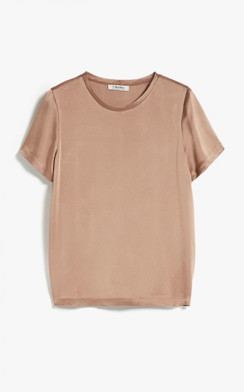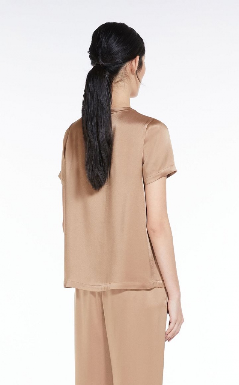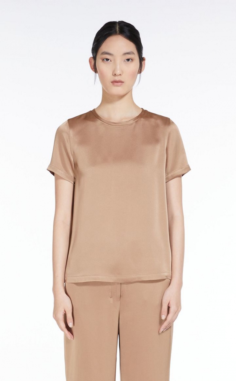 Short-sleeved crew-neck T-shirt in double-faced viscose-blend satin fabric. Length: 61 cm.