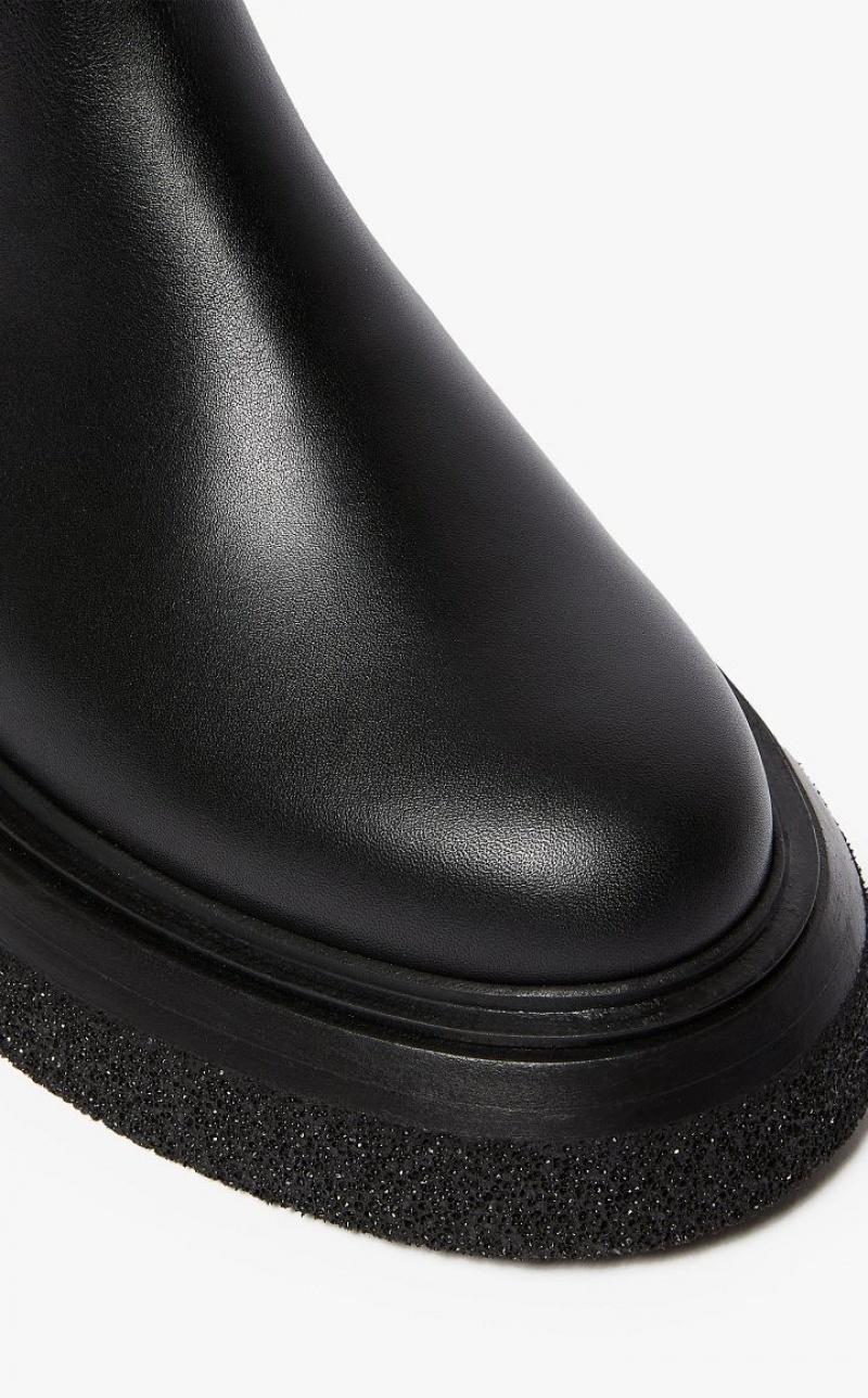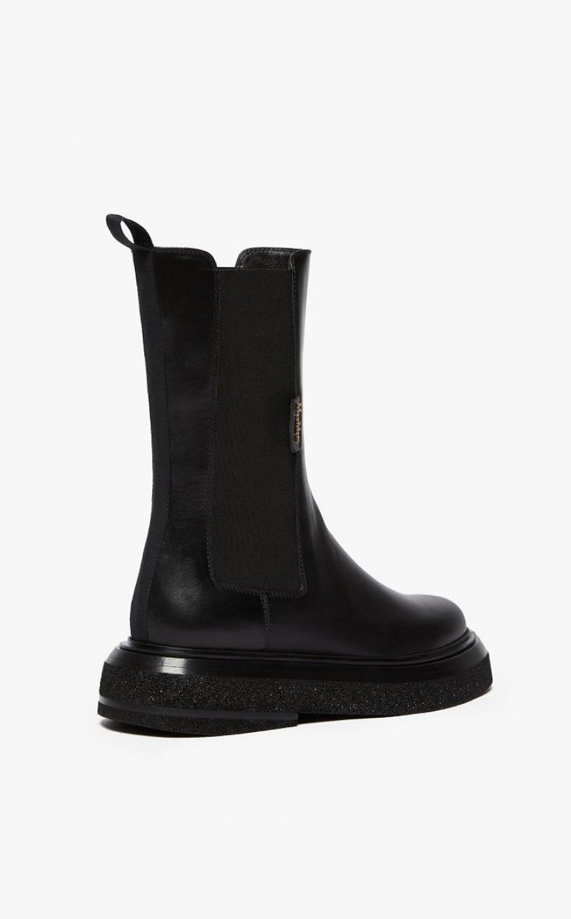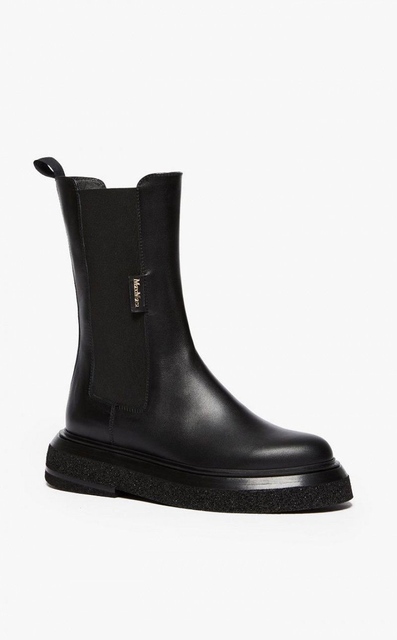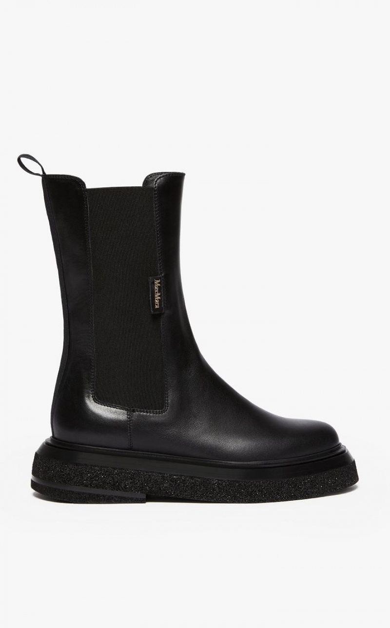 Chelsea boots in shiny calfskin, featuring a rounded-toe design and a wide, curved sole. Mid-calf length leg with classic elasticated side inserts, loop above the heel and small logo label at the side. The leather and rubber sole is extremely light and is comfortable when walking.