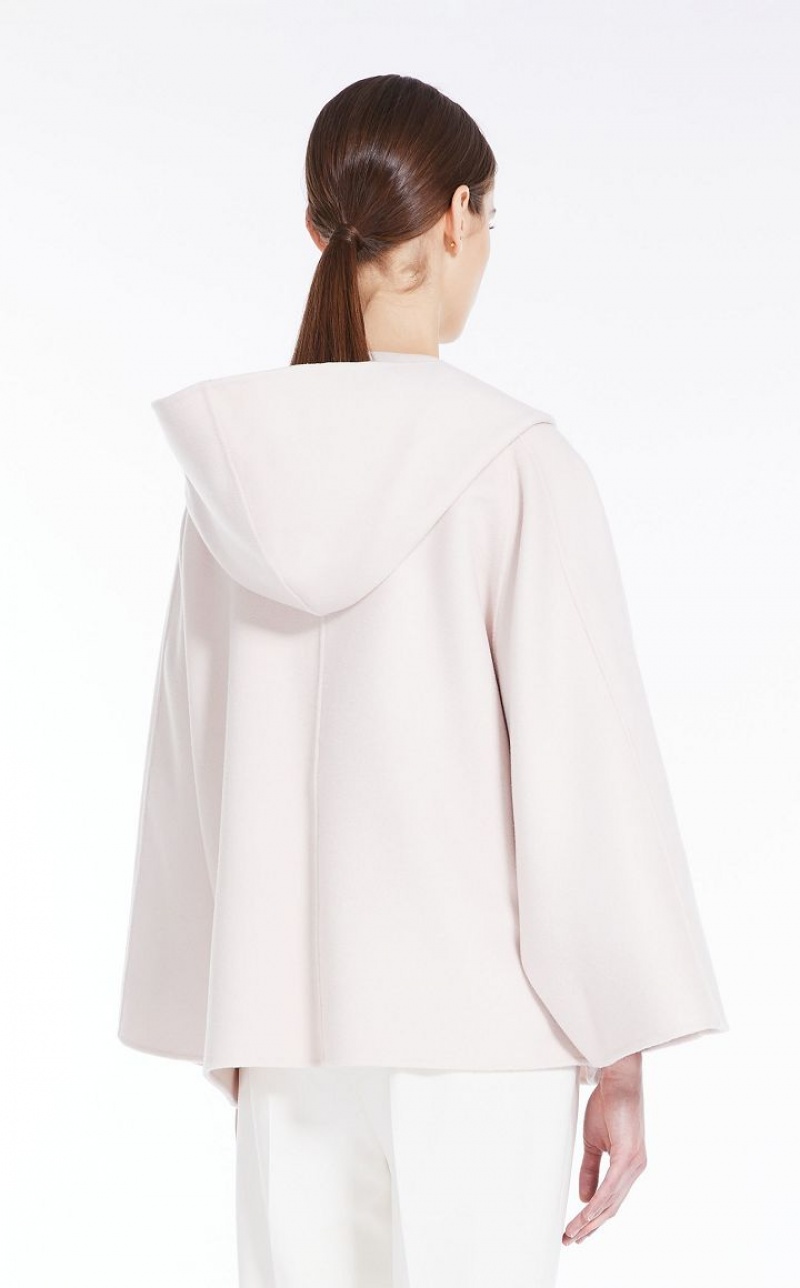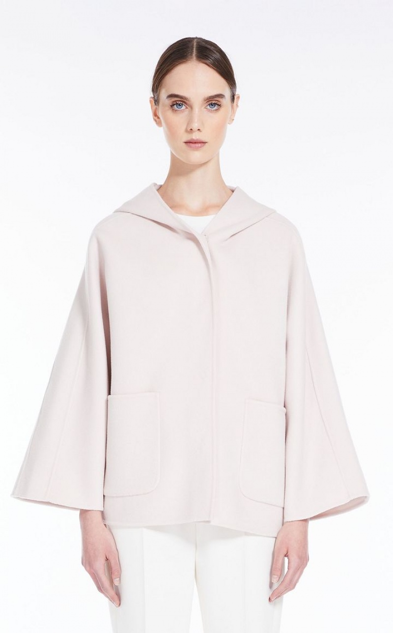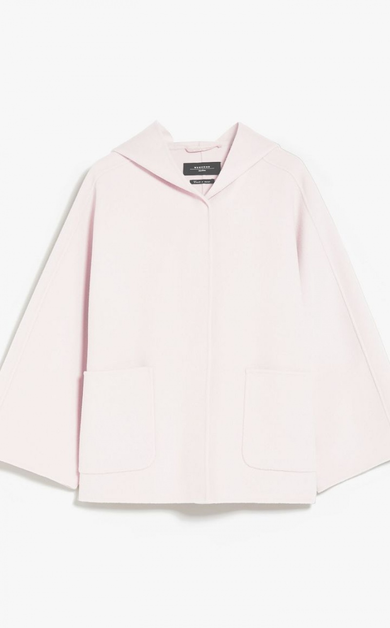 Short cape in a luxe pure wool fabric. Soft and warm, with a flared silhouette, long kimono sleeves, hood, and patch pockets on the front. Concealed fastening.