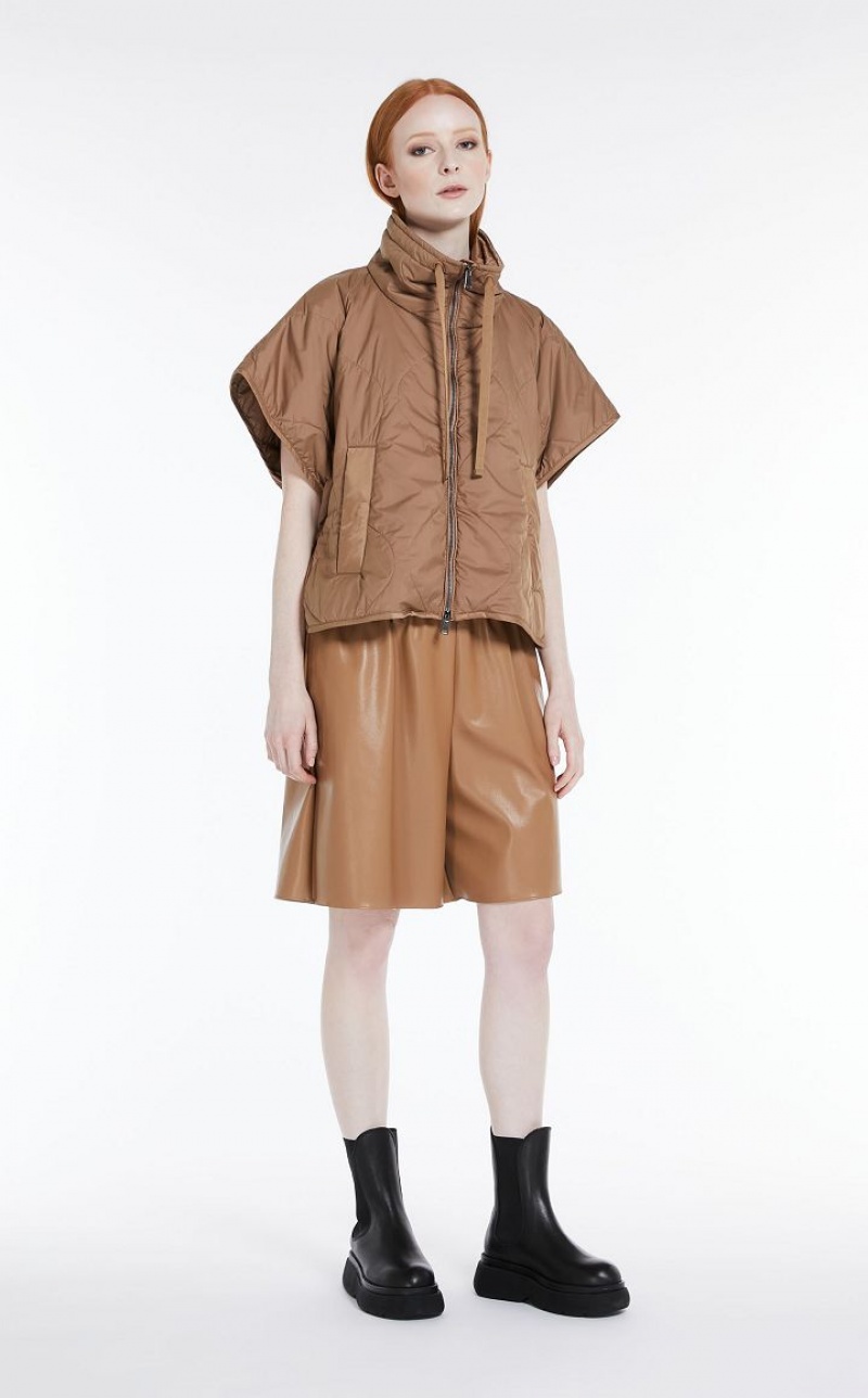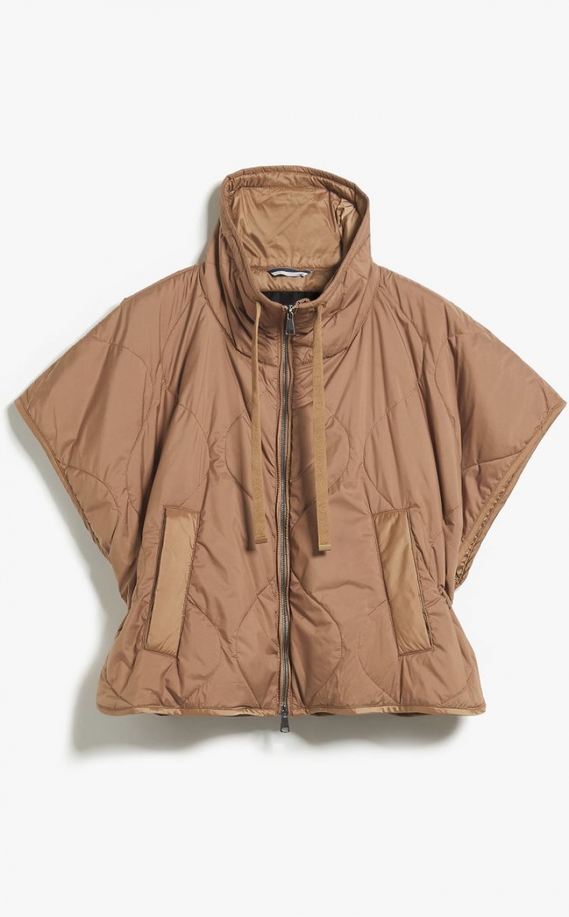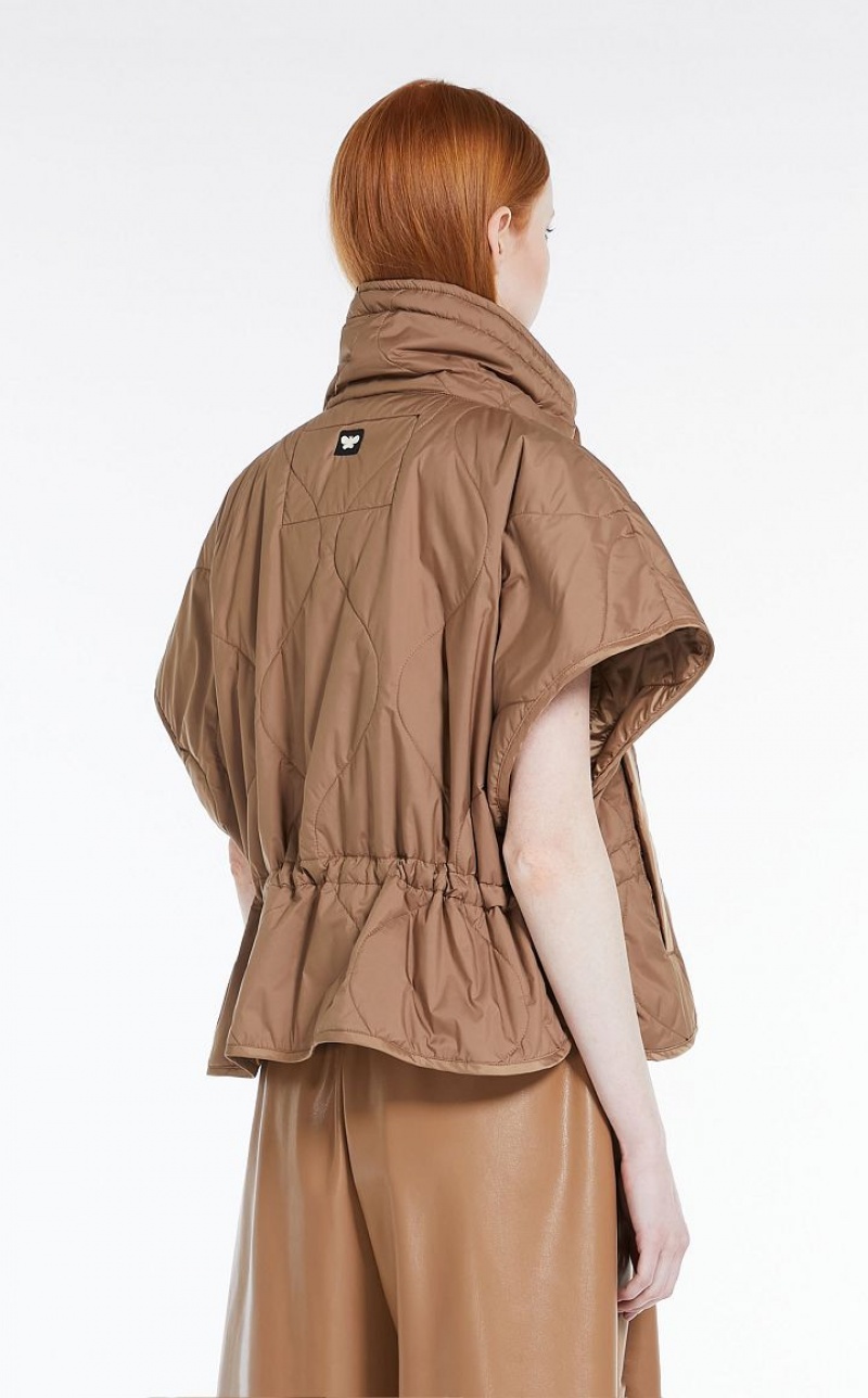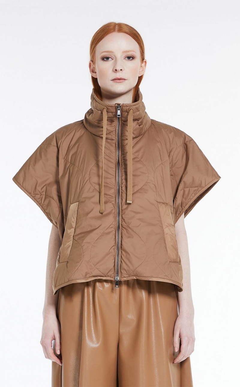 Short padded cape in technical showerproof fabric with quilted diamond pattern, high collar with drawstring, short sleeves and large welt pockets. The internal Luxepad Ultra fine Insulating Technology padding is designed to retain and optimise body heat, even when temperatures are cold. Finished with adjustable drawstring at the waist and butterfly logo detail on the back of the collar. Fastening with press studs.
