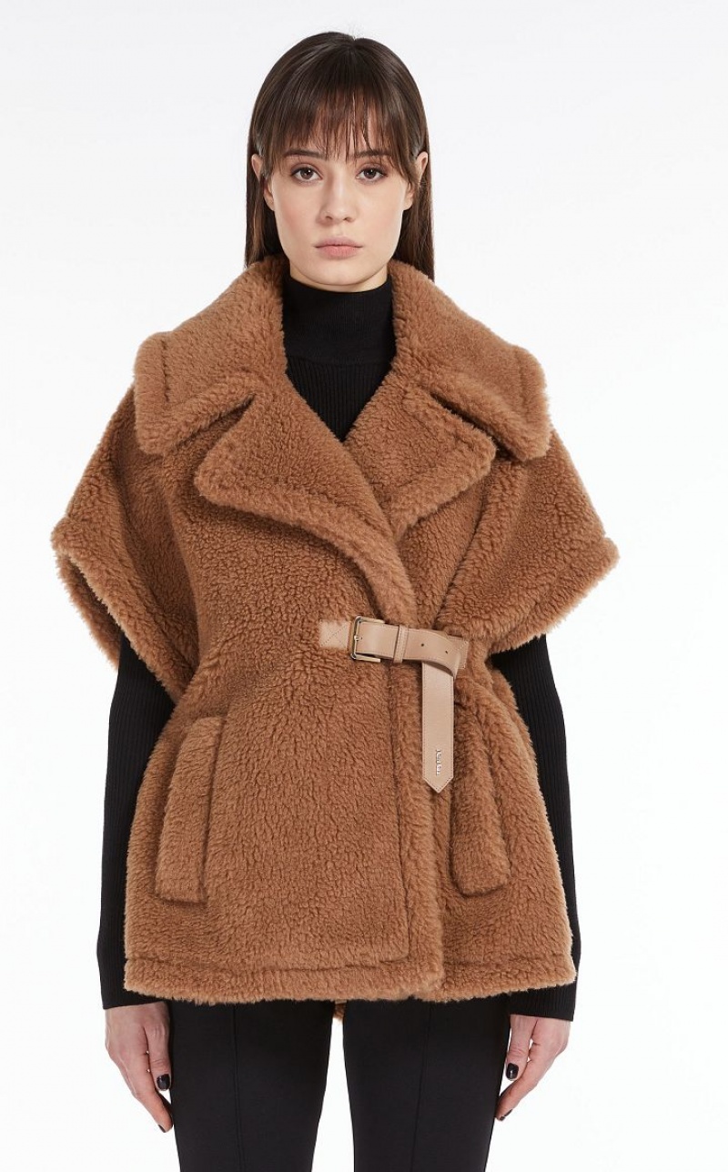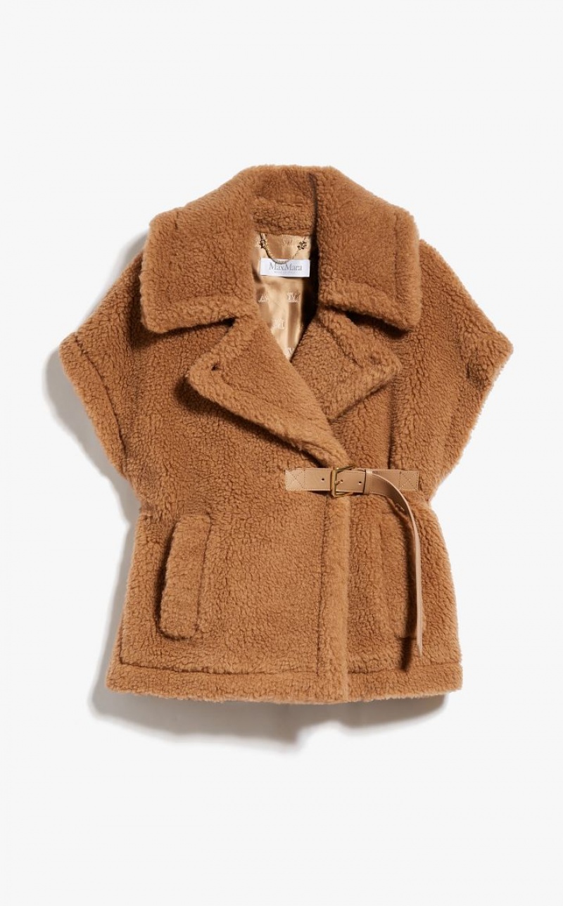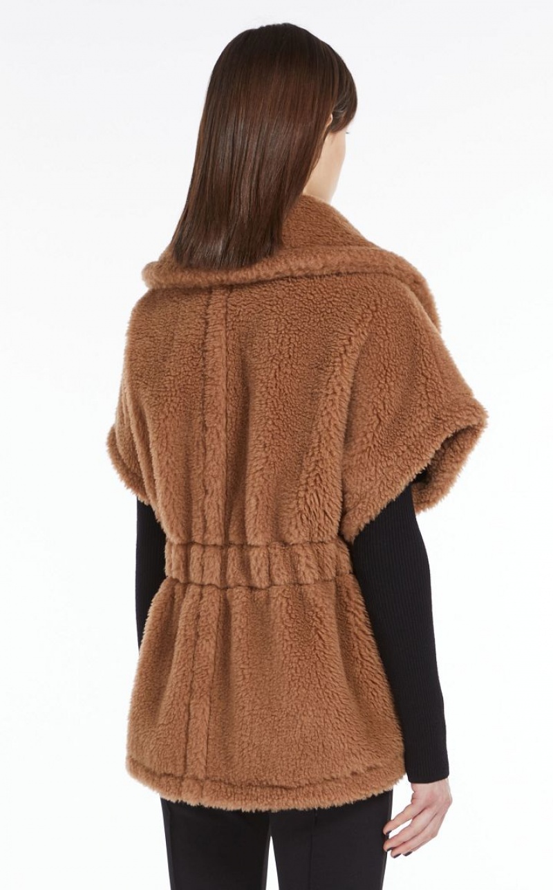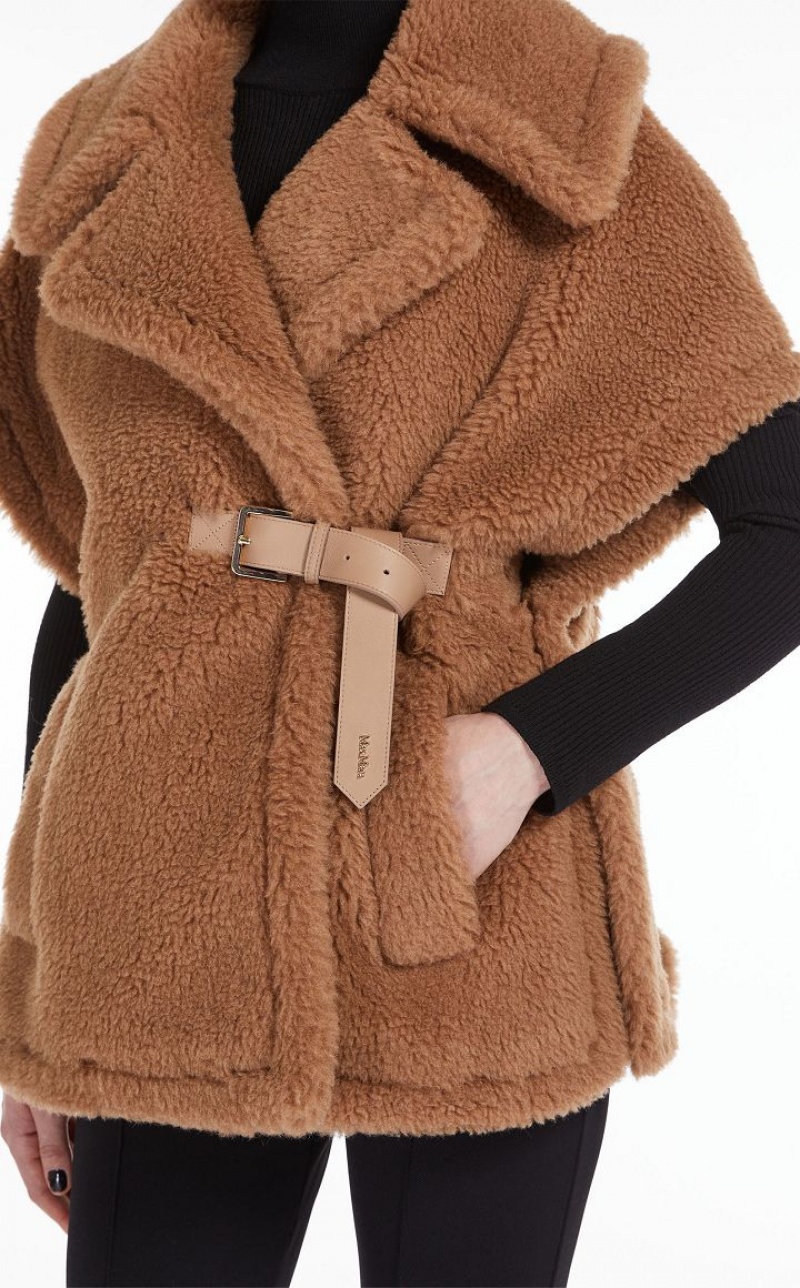 Sleeveless cape made of iconic camel Teddy fabric on a silk base. The gilet construction features a wide lapel neckline that rests on the shoulders, vertical welt pockets at the sides and an elasticated insert at the back of the waist that creates slight gathering. Front closure with two silk-covered snap-buttons and a long leather strap to be worn knotted with a buckle, Max Mara logo on the tip. Length: 72 cm.