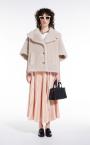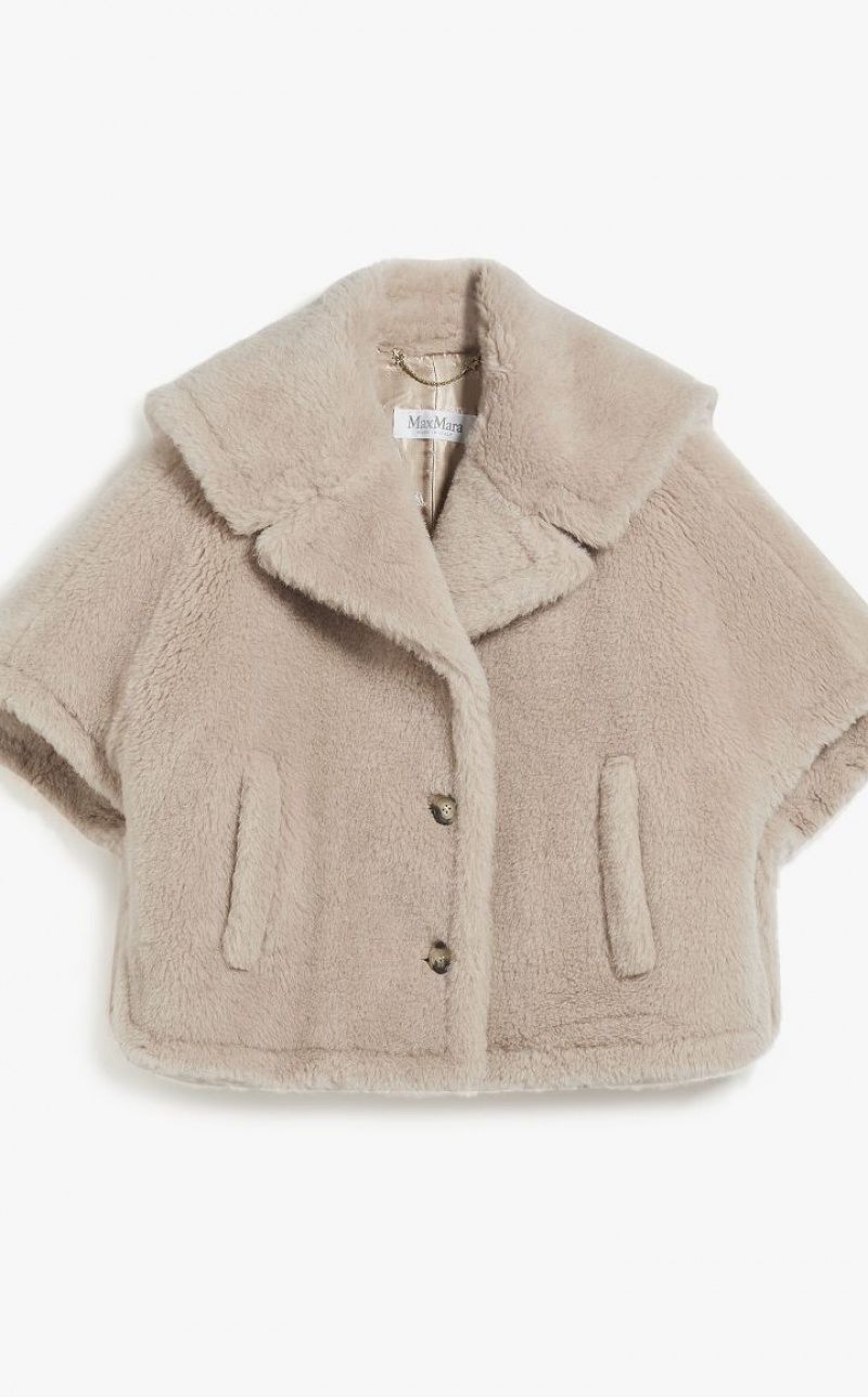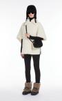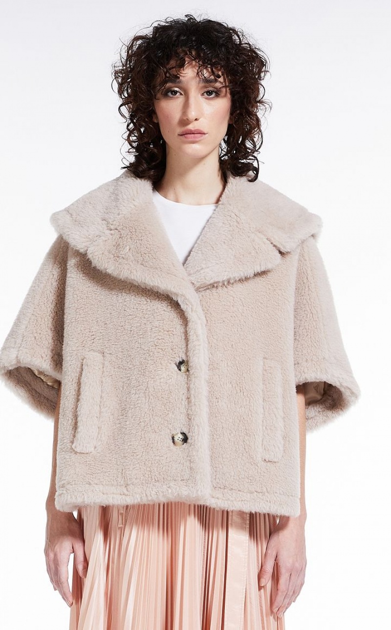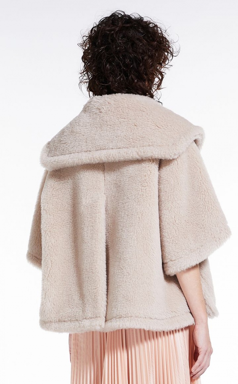 Cape made of soft alpaca and wool Teddy fabric on a silk base. The wide, enveloping volume features an oversized slit at the back, marinière-inspired wide lapel collar, short sleeves and vertical welt pockets. Satin lining. Asymmetric single-breasted fastening with buttons. Length: 62 cm.