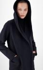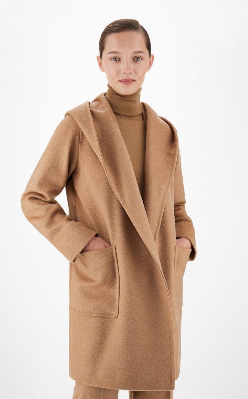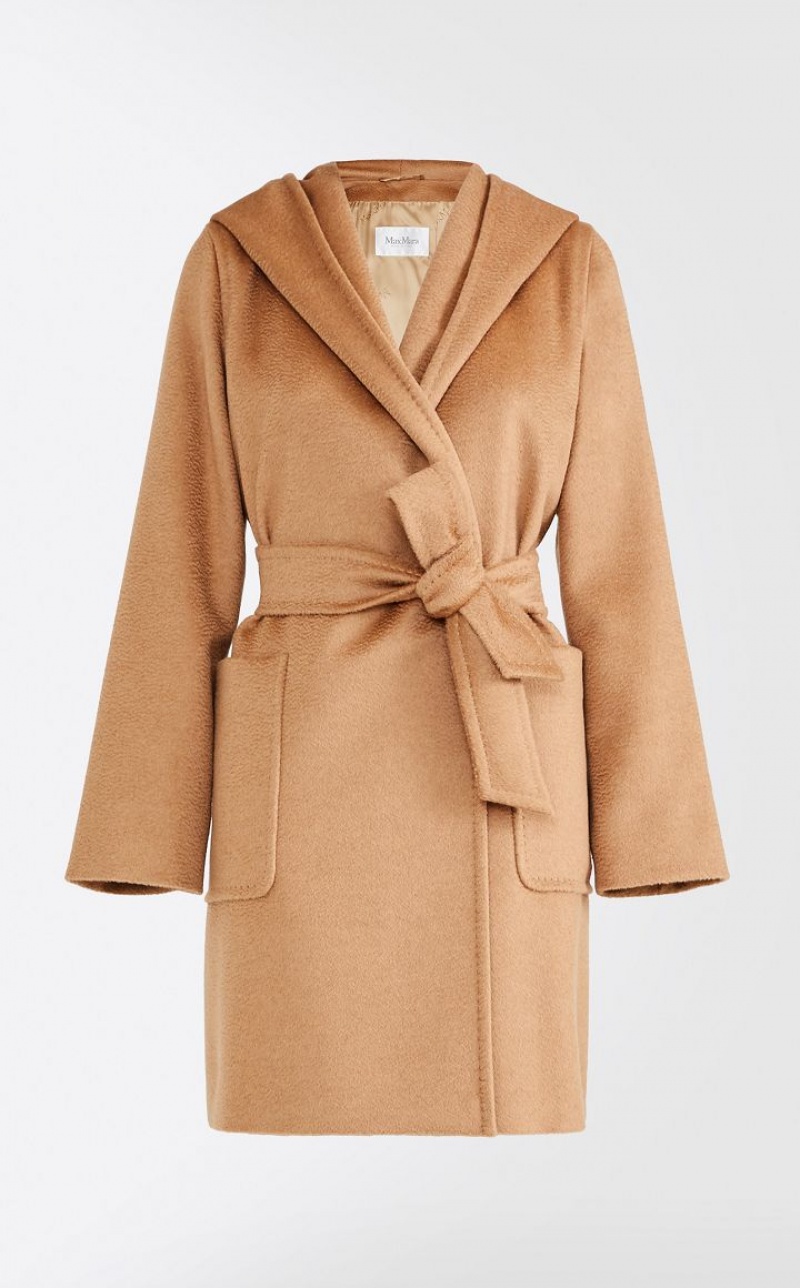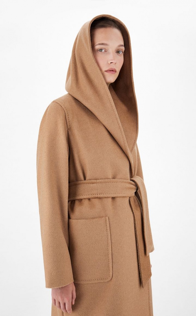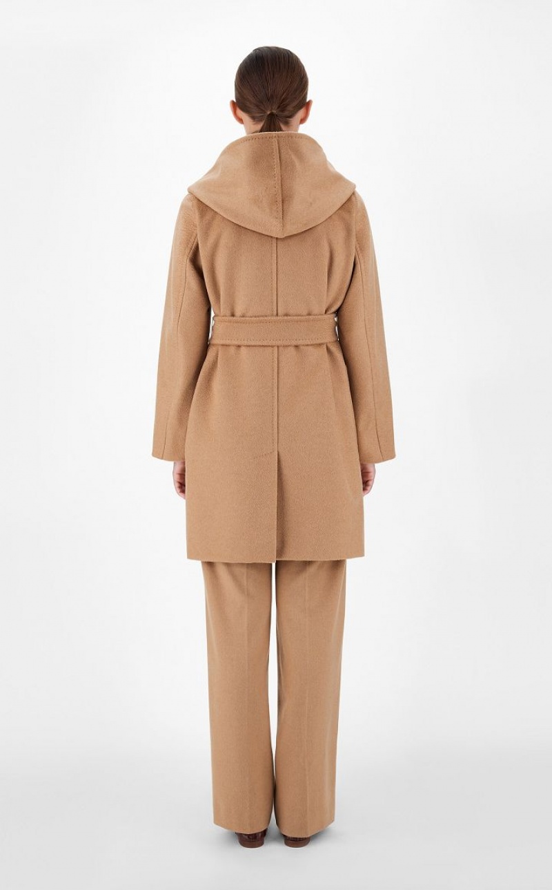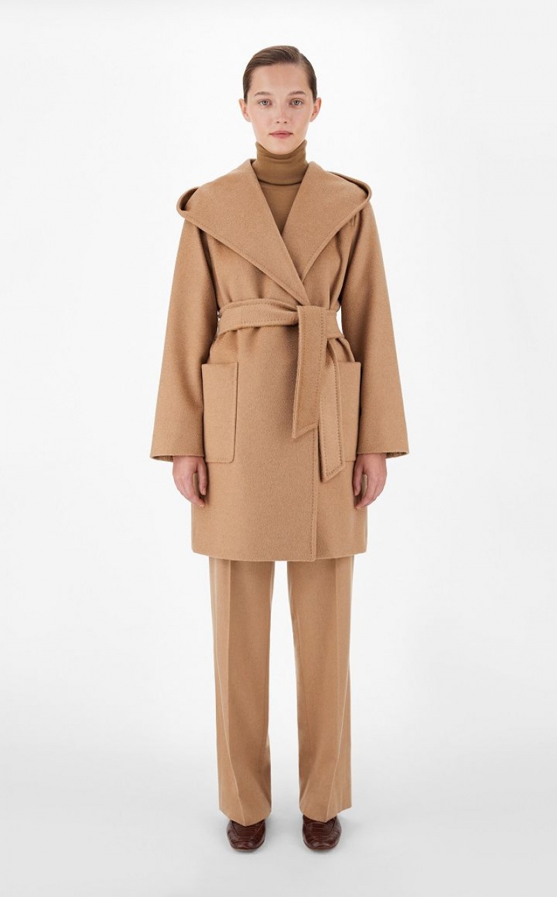 Wrap coat in exquisite sable-trimmed pure camel featuring an enveloping silhouette with hood, long set-in sleeves and patch pockets on the front. Feminine style finished with sartorial pick stitch and matching belt to accentuate the waist. Length: 90 cm.