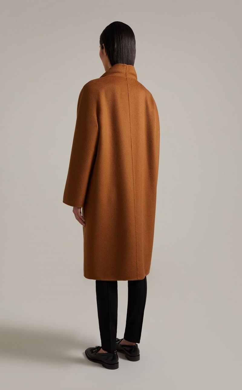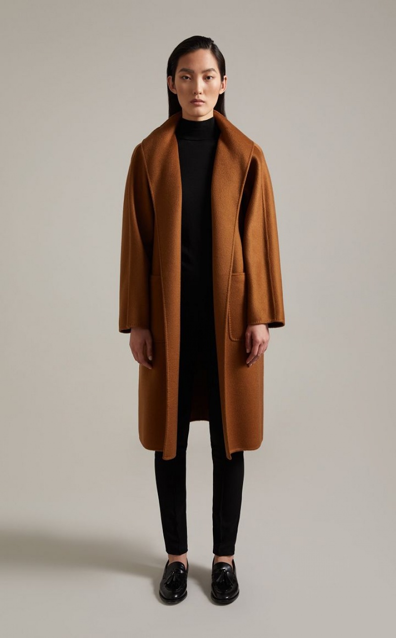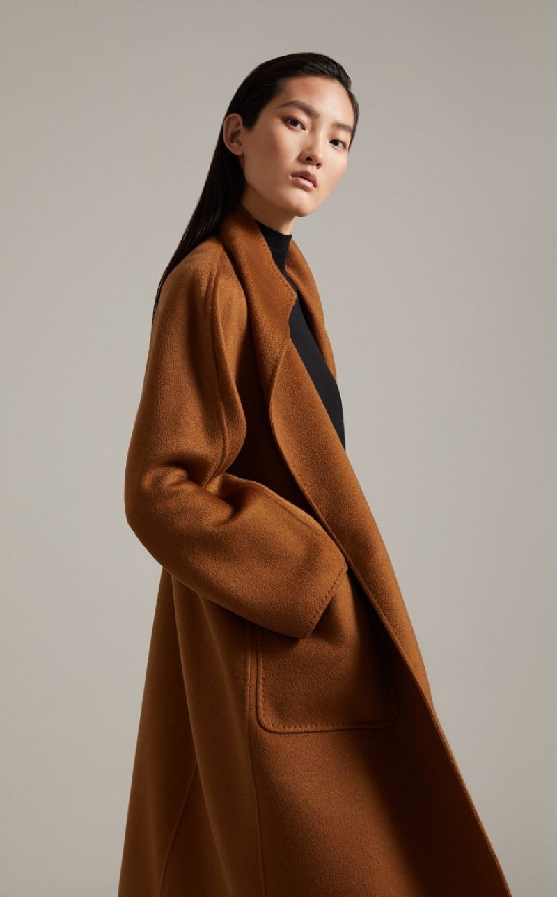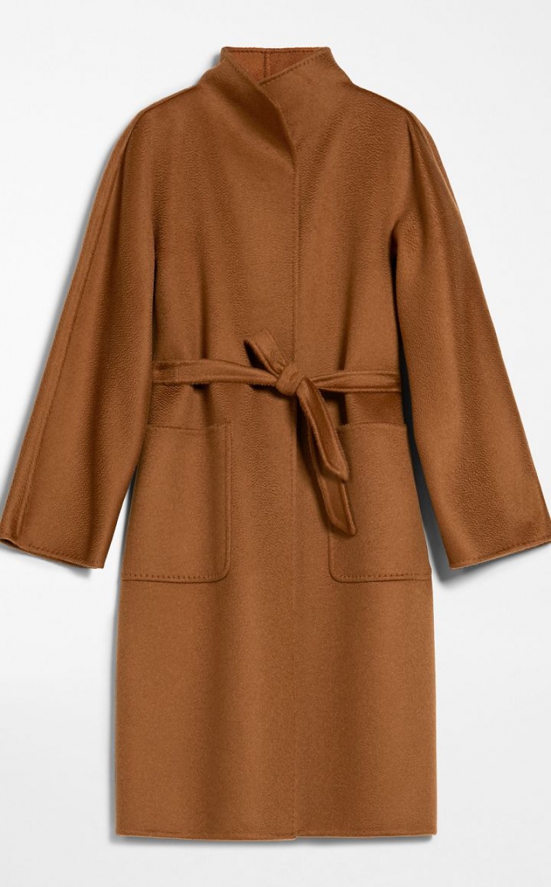 Iconic Max Mara coat featuring a cardigan-inspired straight silhouette. Made of exquisite pure double cashmere with hand-sewn sable trim, it boasts a standing collar, kimono sleeves and patch pockets. The matching belt allows you to accentuate the waist. Length: 105 cm.