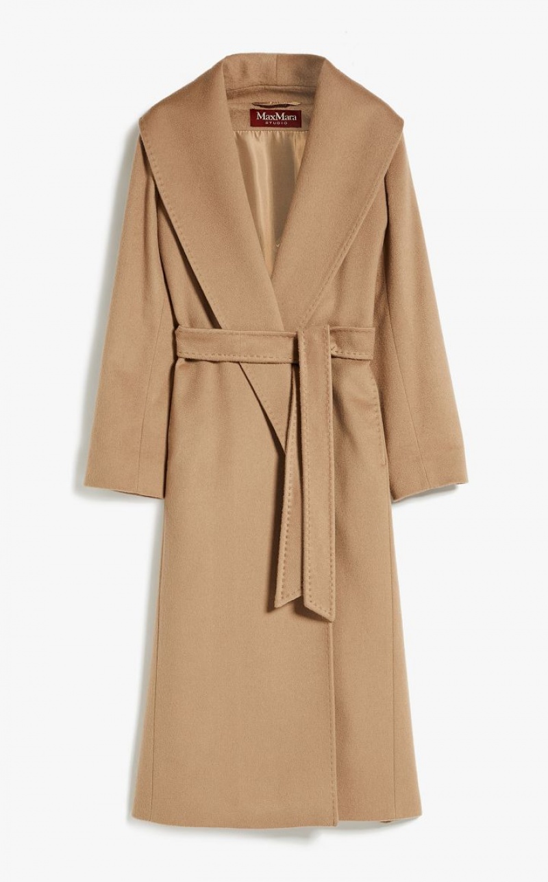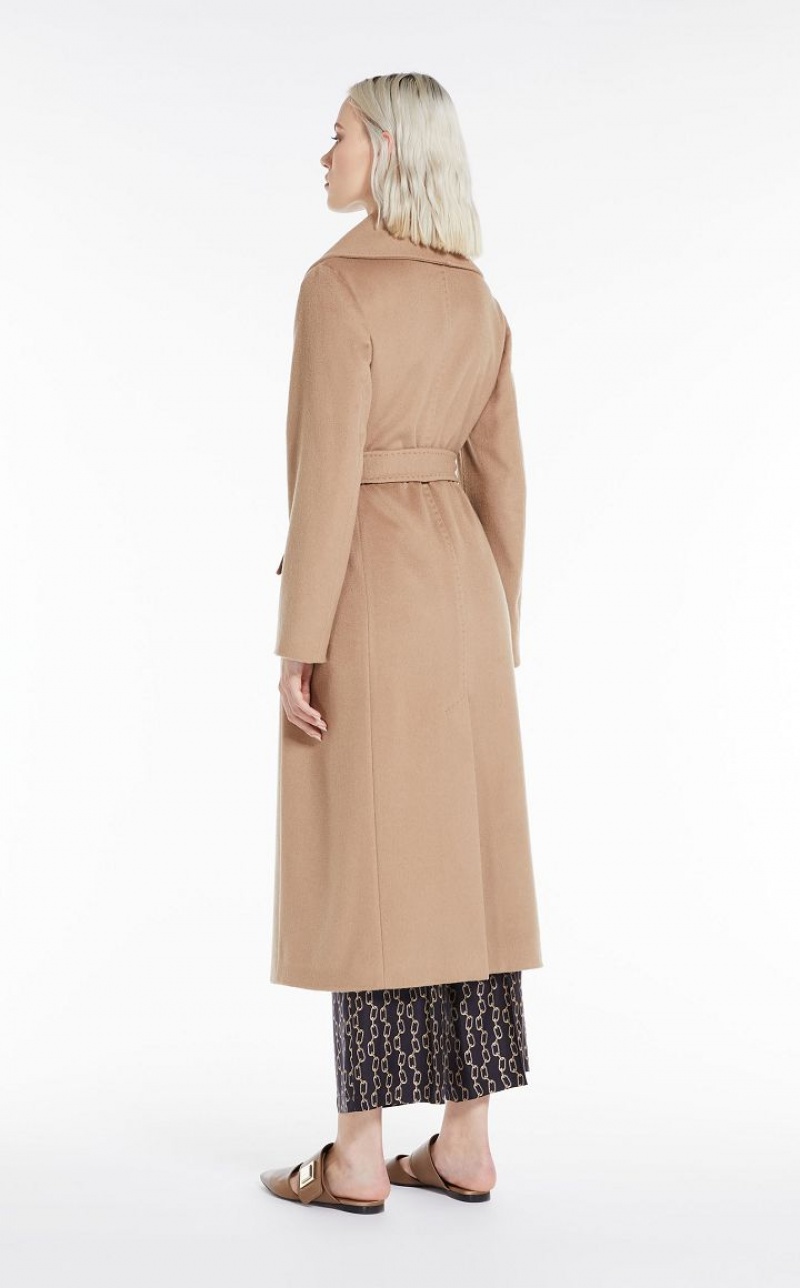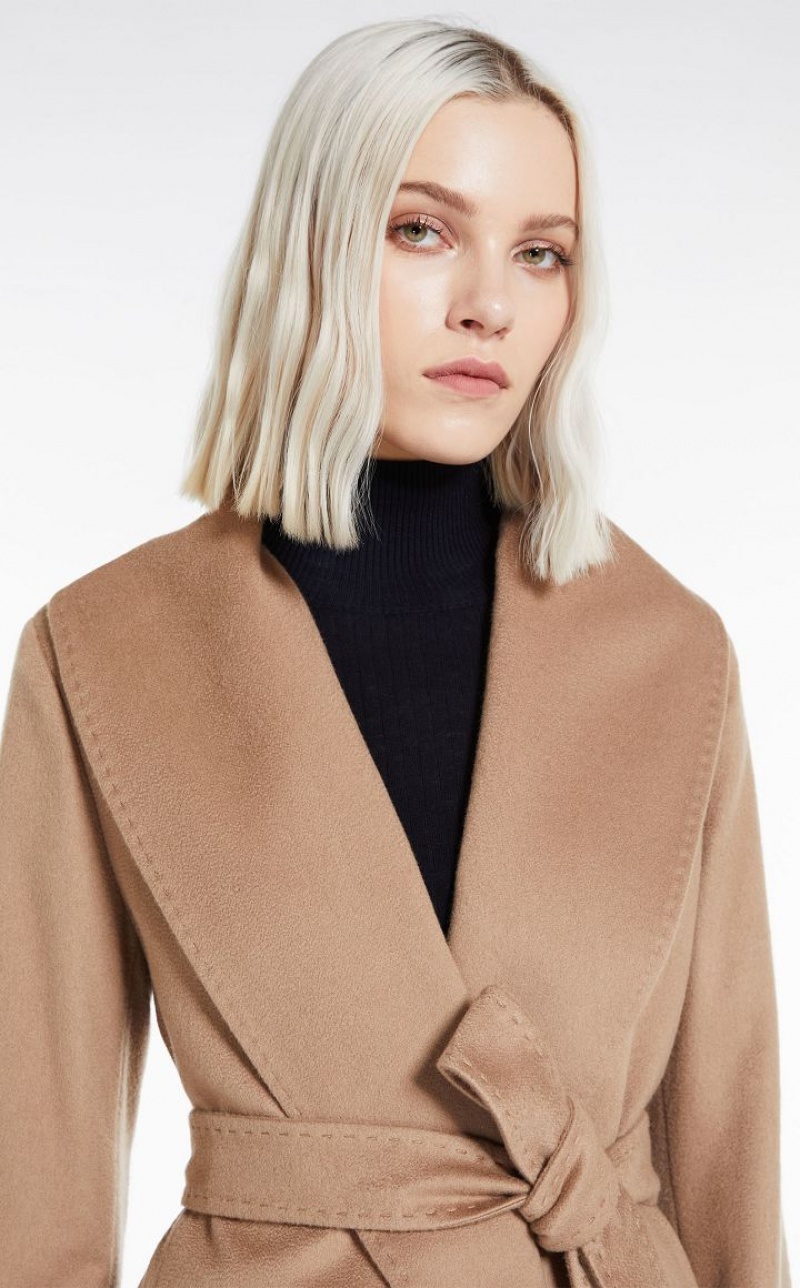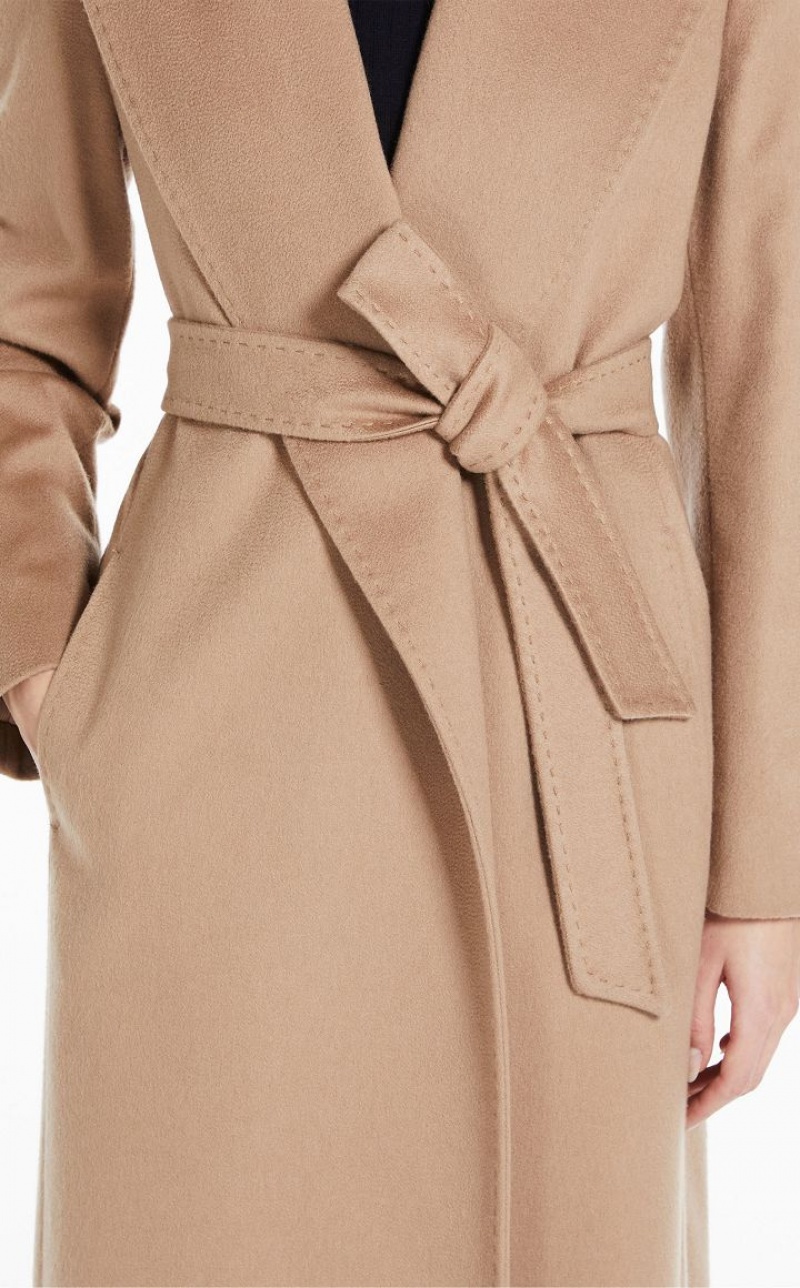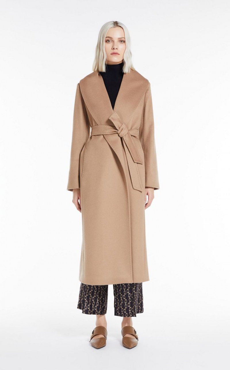 Long robe-style coat in fine pure cashmere fabric. The feminine, figure-enveloping model boasts a matching waist belt, shawl collar and long set-in sleeves. Lined model. Length: 120 cm.