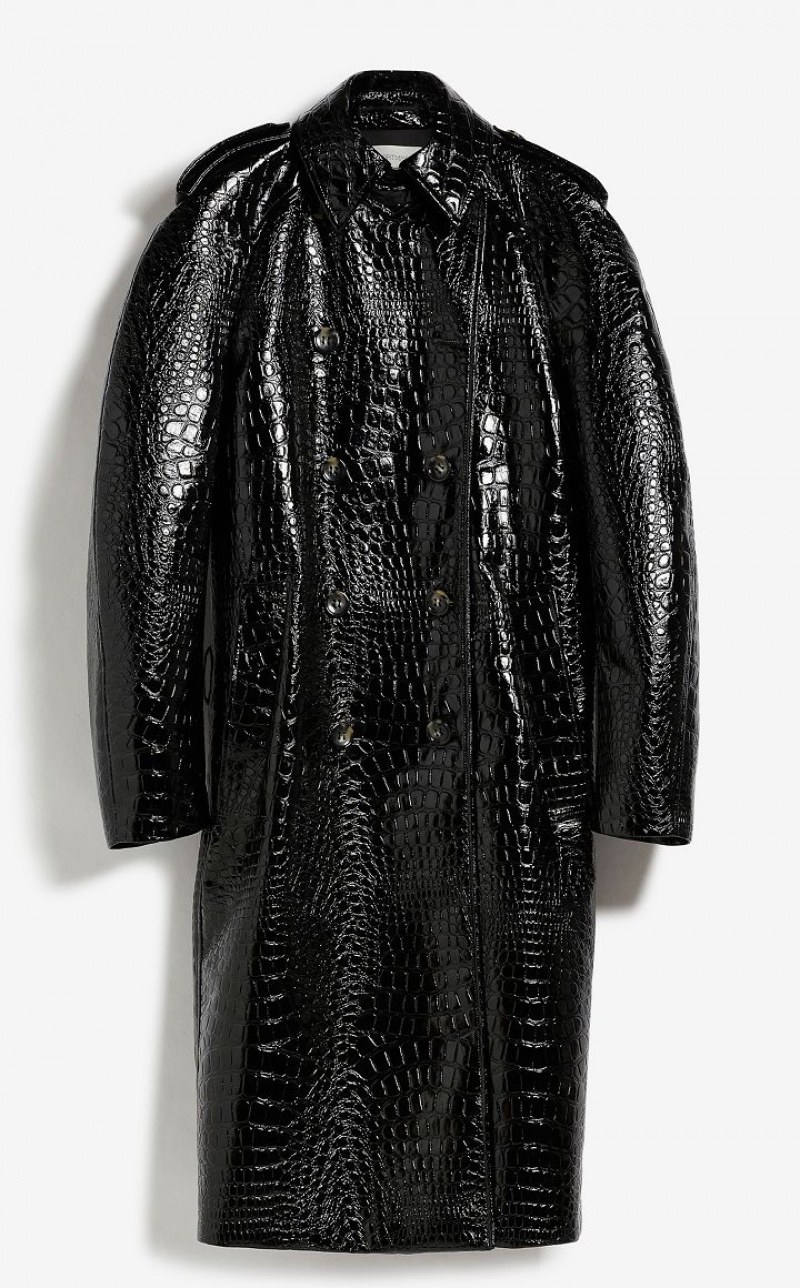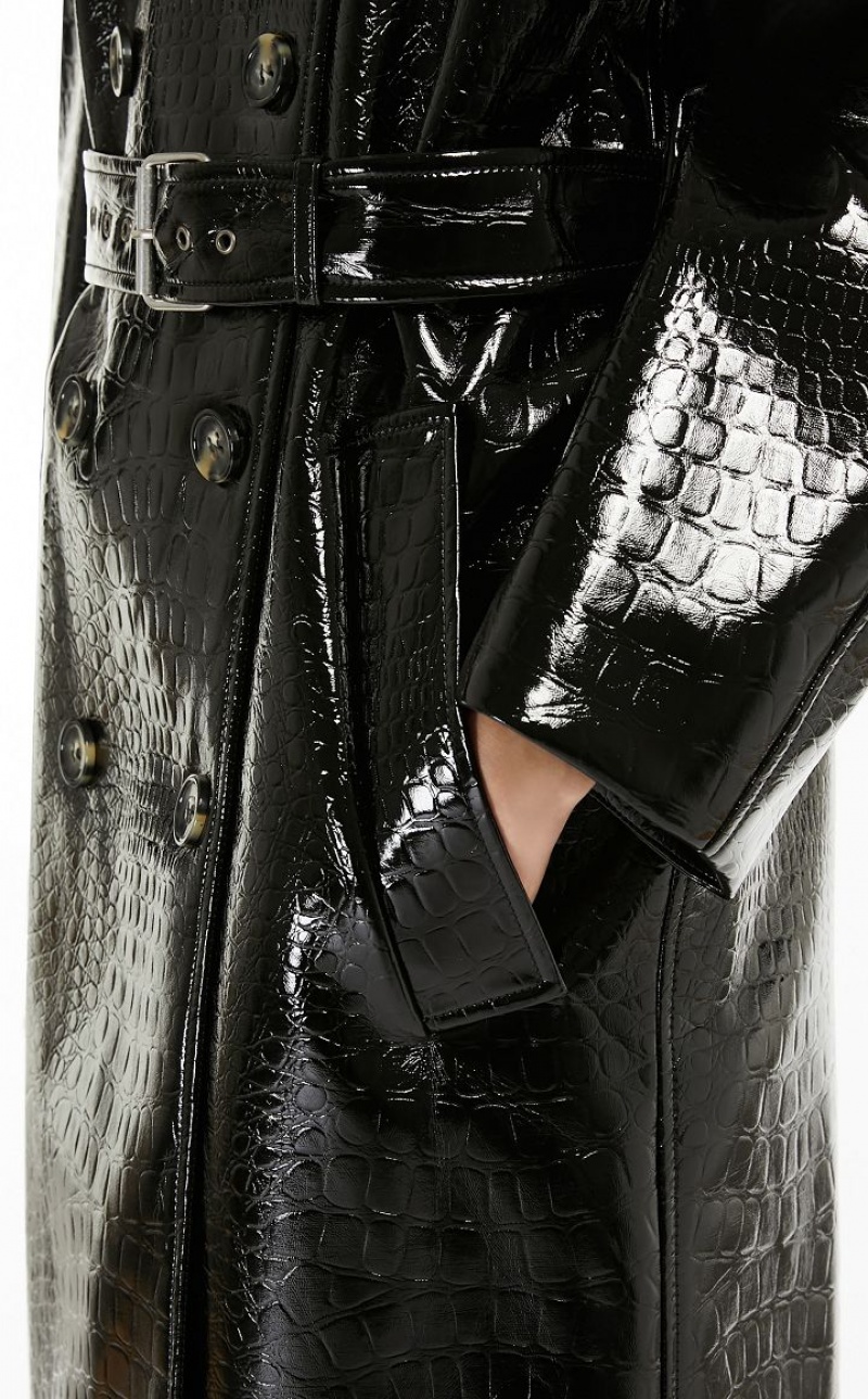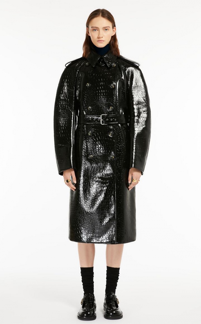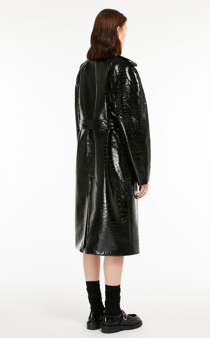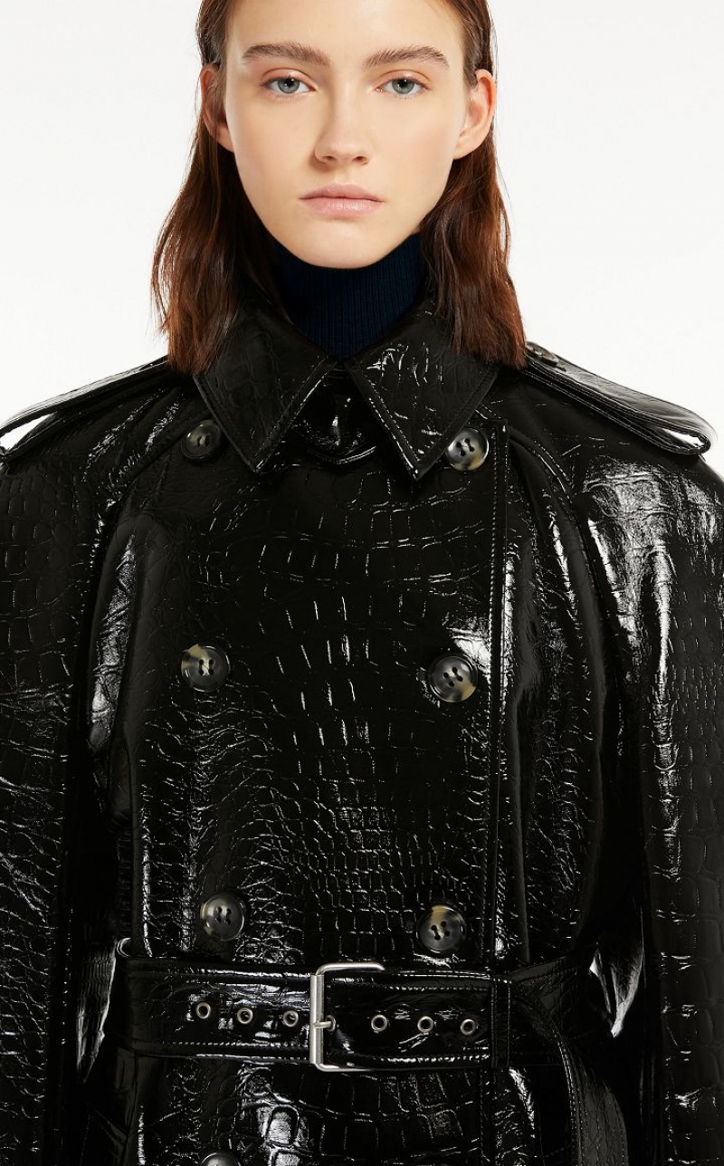 Trench coat in embossed faux crocodile vinyl. Loosely cut, with raglan sleeves, epaulettes on the shoulders, double-breasted fastening and waist belt with buckle. The volume of the coat is emphasised by the reverse pleat on the back highlighted by topstitching. Below-the-knee length and lined.
