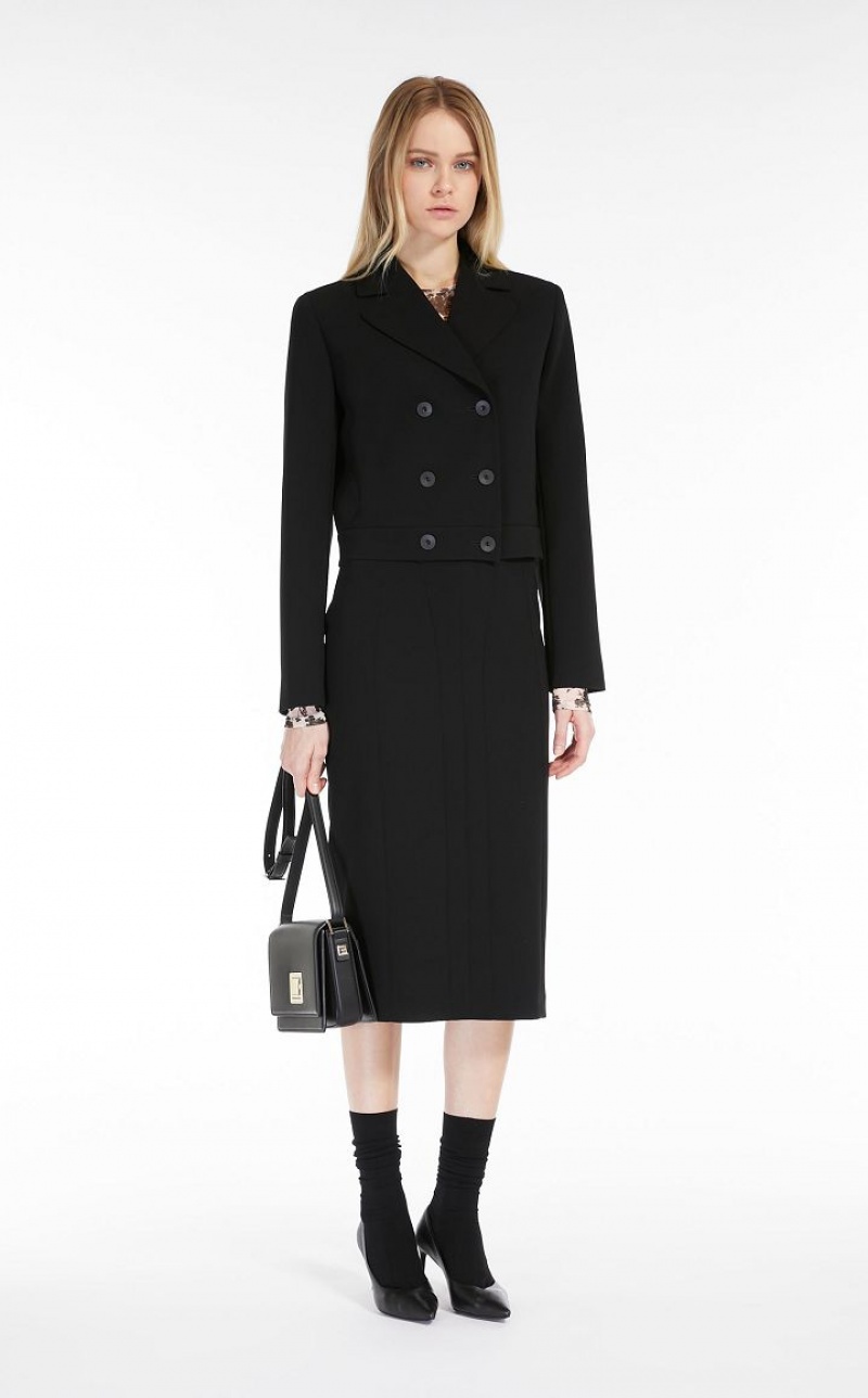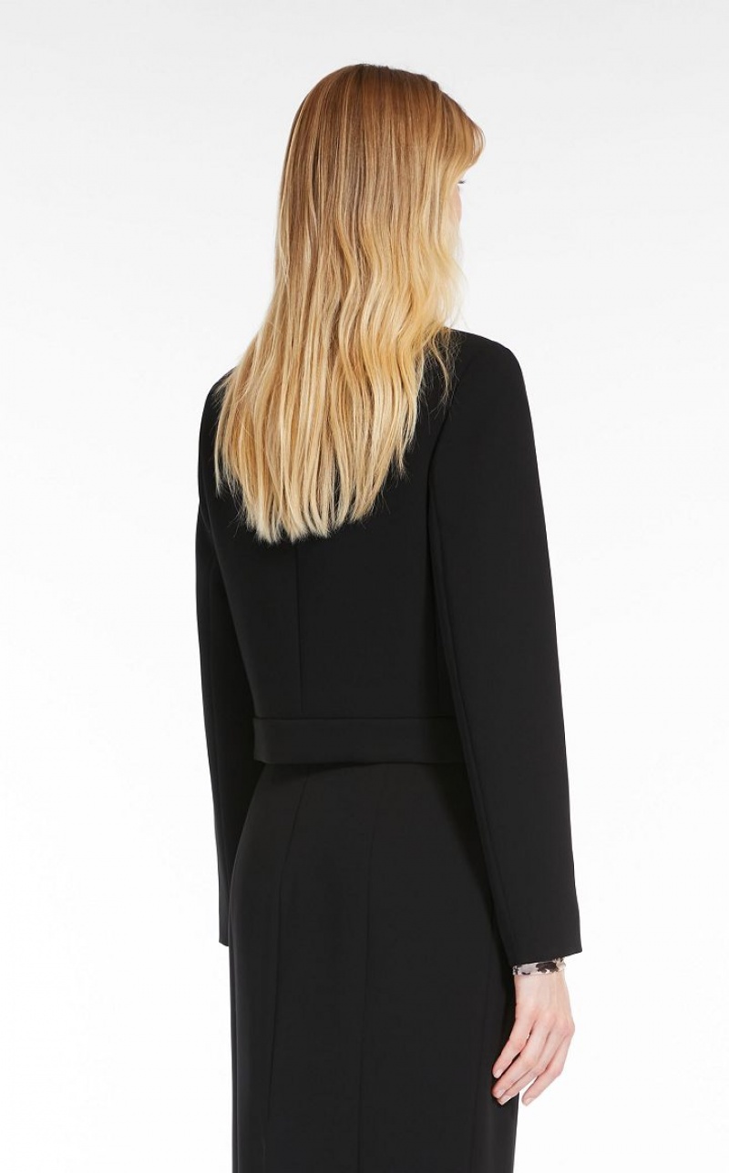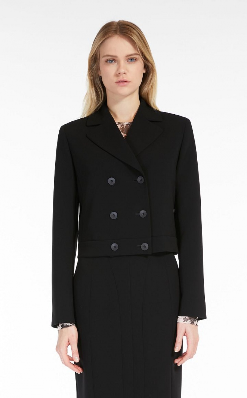 Double-breasted cropped jacket in technical cady fabric featuring a button fastening. The model boasts a lapel collar and long set-in sleeves. Lined model. Length: 50 cm.