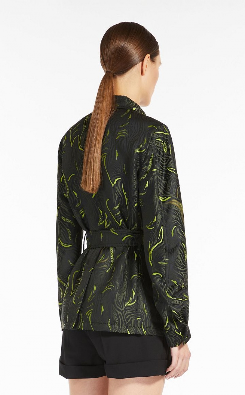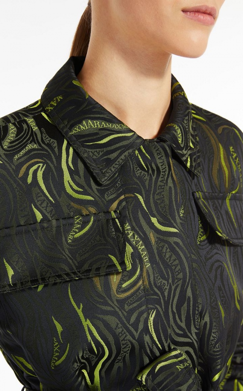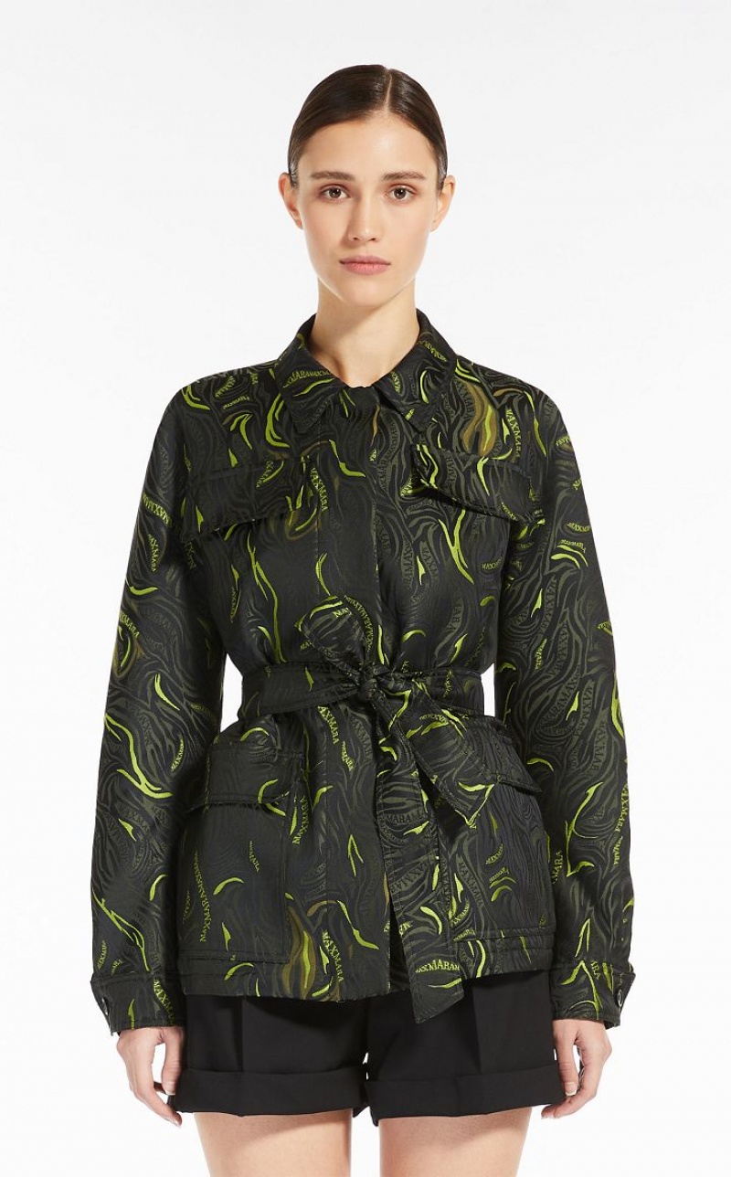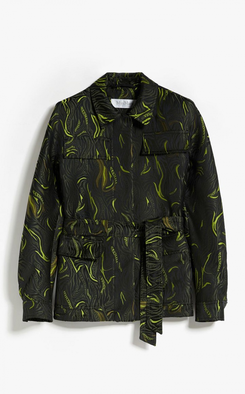 Shirt jacket made of fine jacquard fabric, with all-over animal print design and Max Mara logo details. The safari-inspired construction features two patch pockets, two flap pockets on the chest and kimono sleeves with round cut on the back, closed at the ends with shirt cuffs. The matching belt accentuates the silhouette. Semi-lined style, closed with zip and covered buttons. Length: 68 cm.