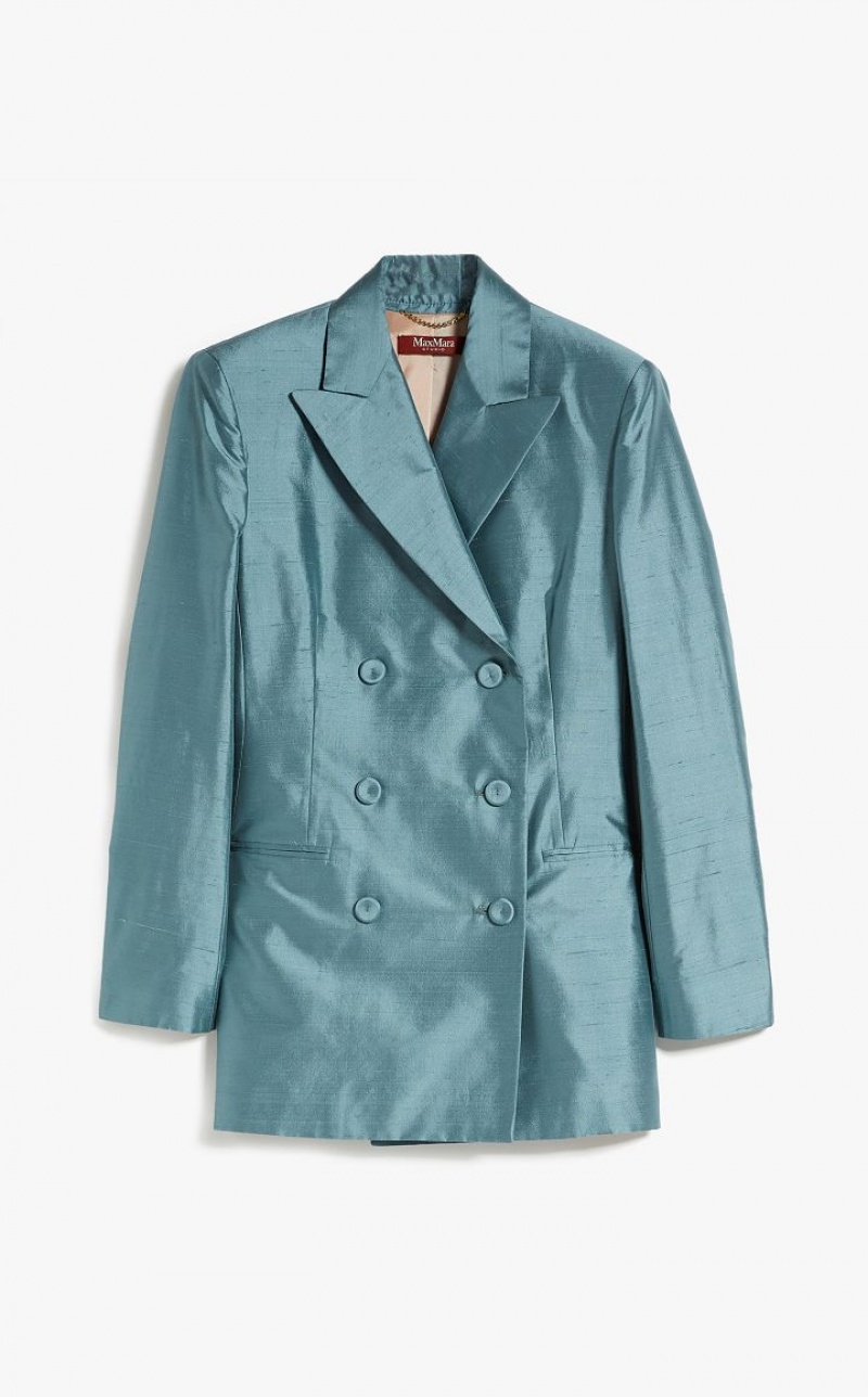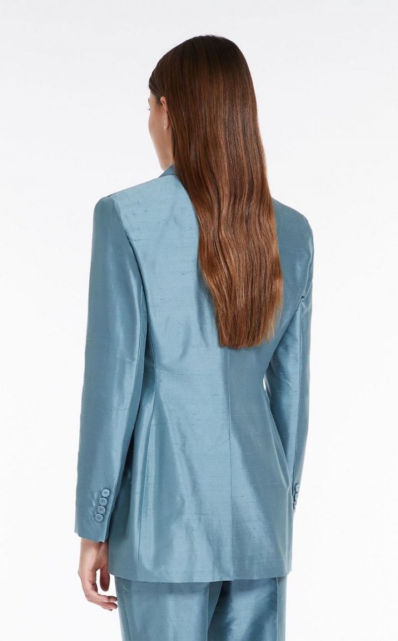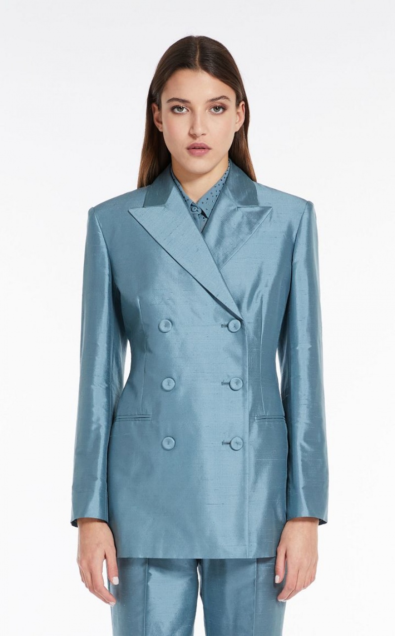 Elegant double-breasted jacket in fine pure silk shantung fabric featuring a peak-lapel collar, long set-in sleeves and welt pockets. 6-button fastening. Length: 72 cm.
