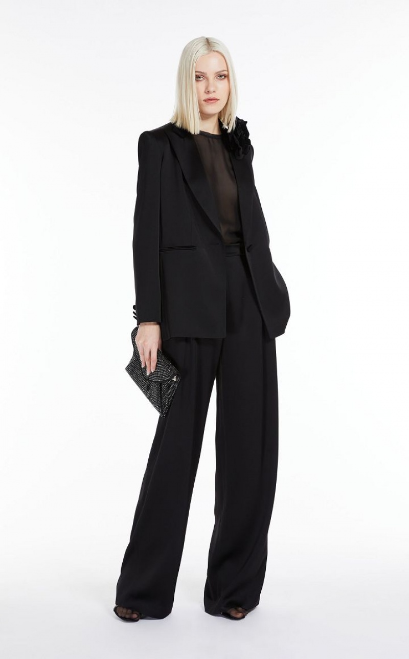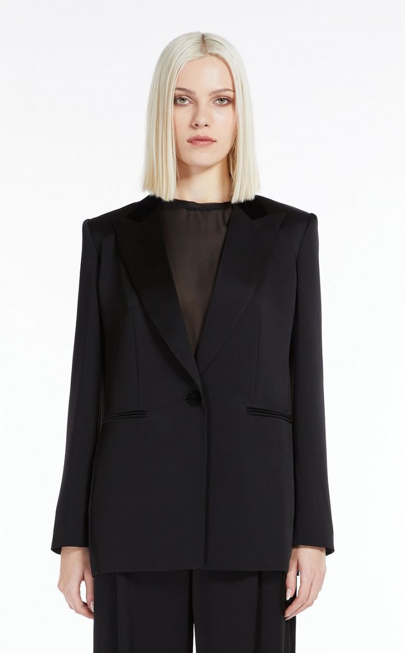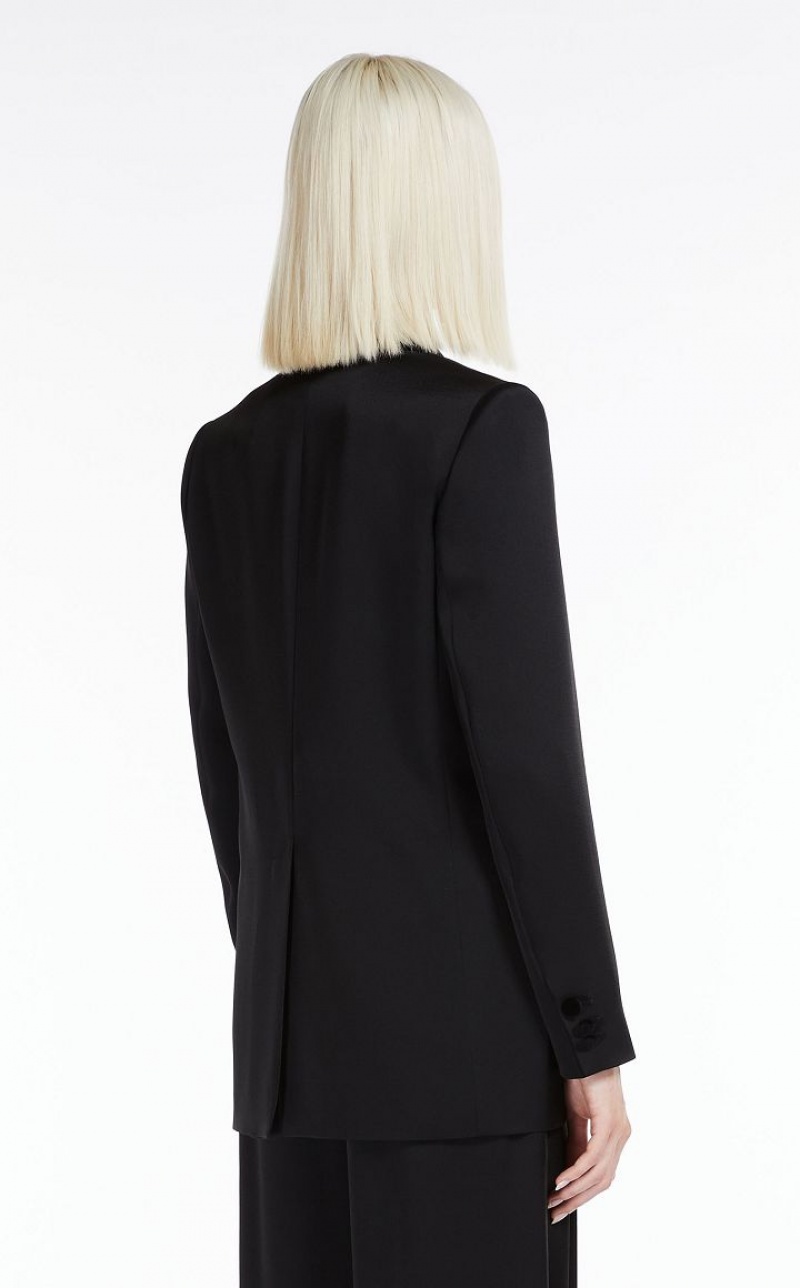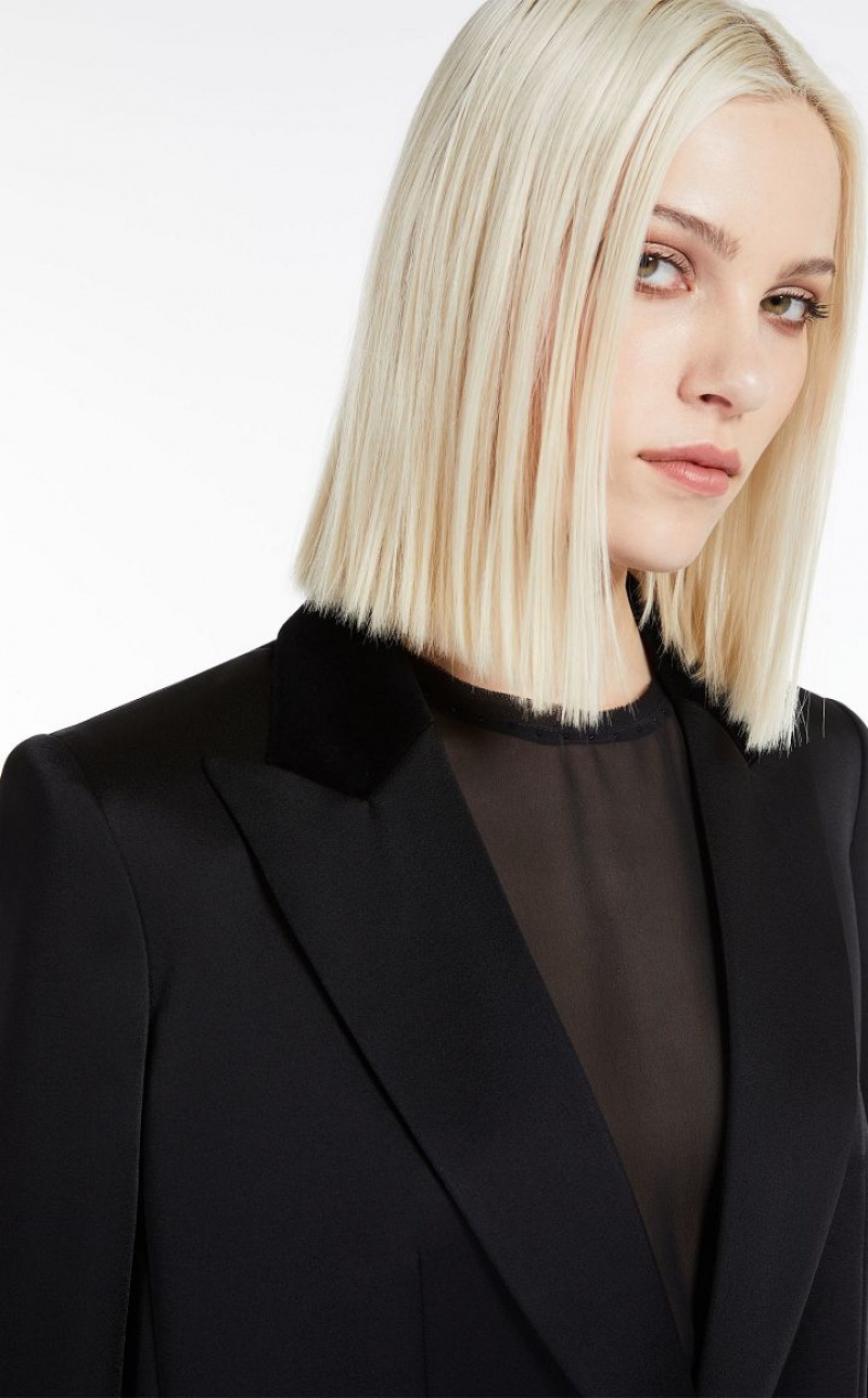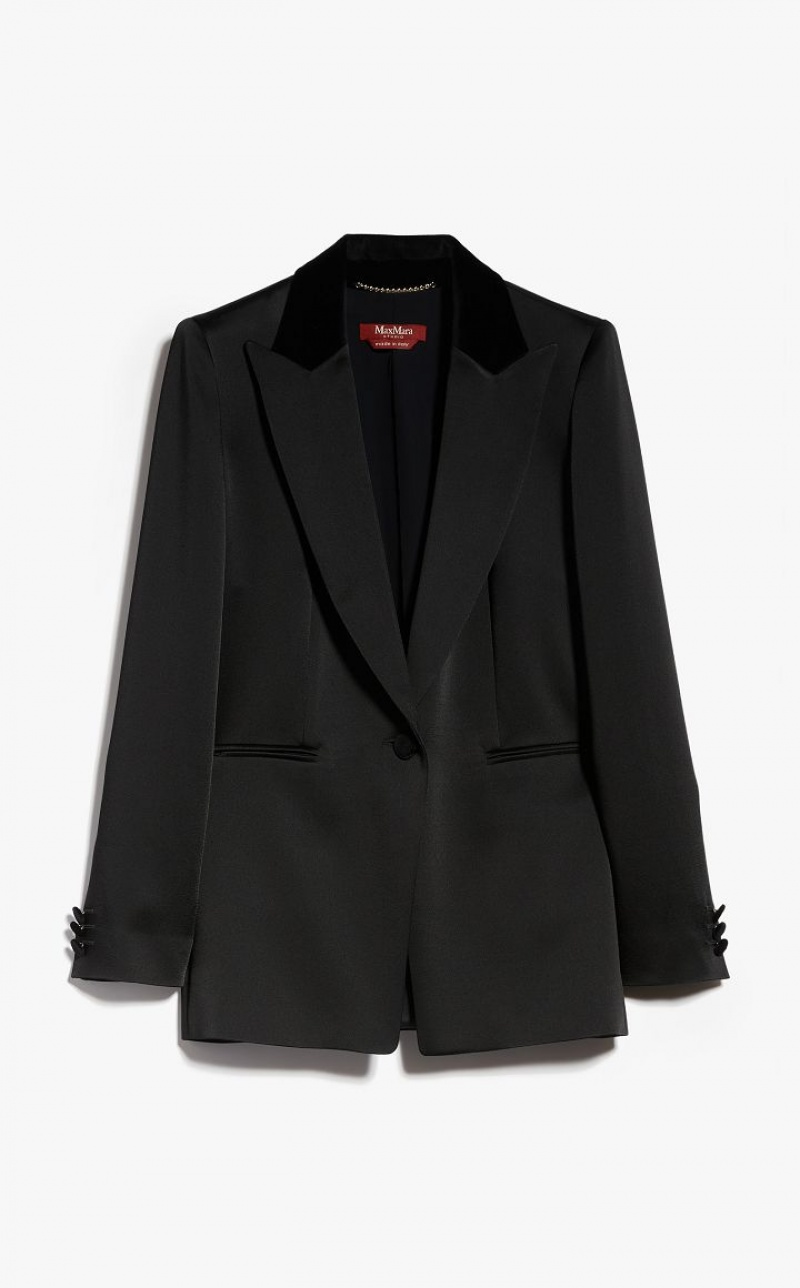 Single-breasted fine envers satin jacket. Tuxedo-inspired style characterised by a collar with peak lapels, velvet inserts, long sleeves and double welt pockets. Finished with a central slit at the back. Single-breasted one-button closure. Length: 72 cm.