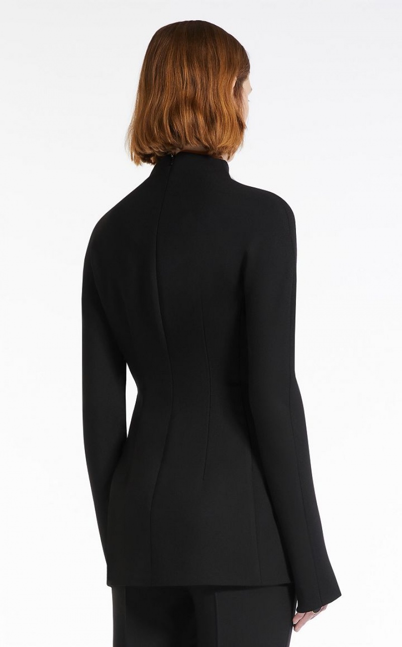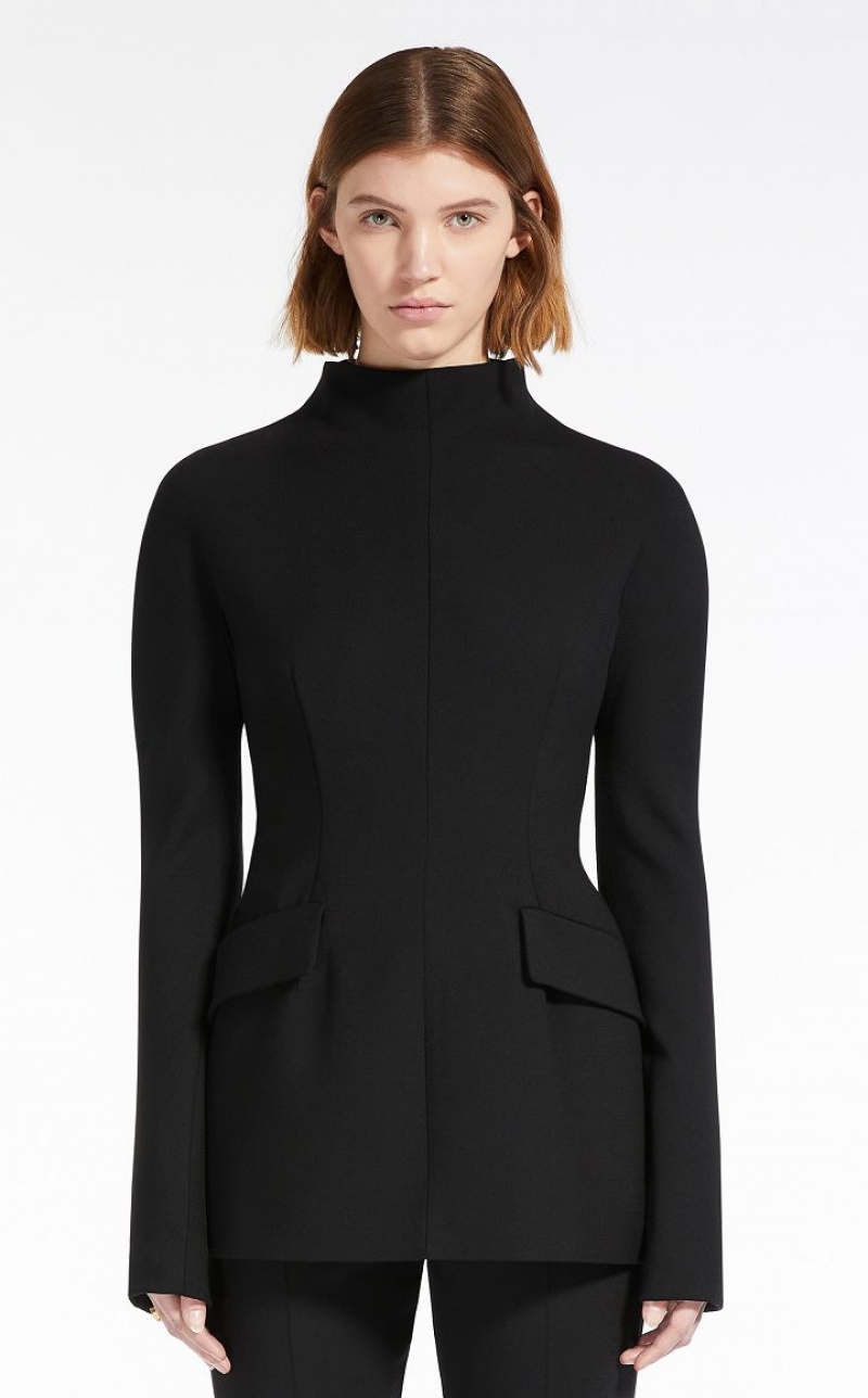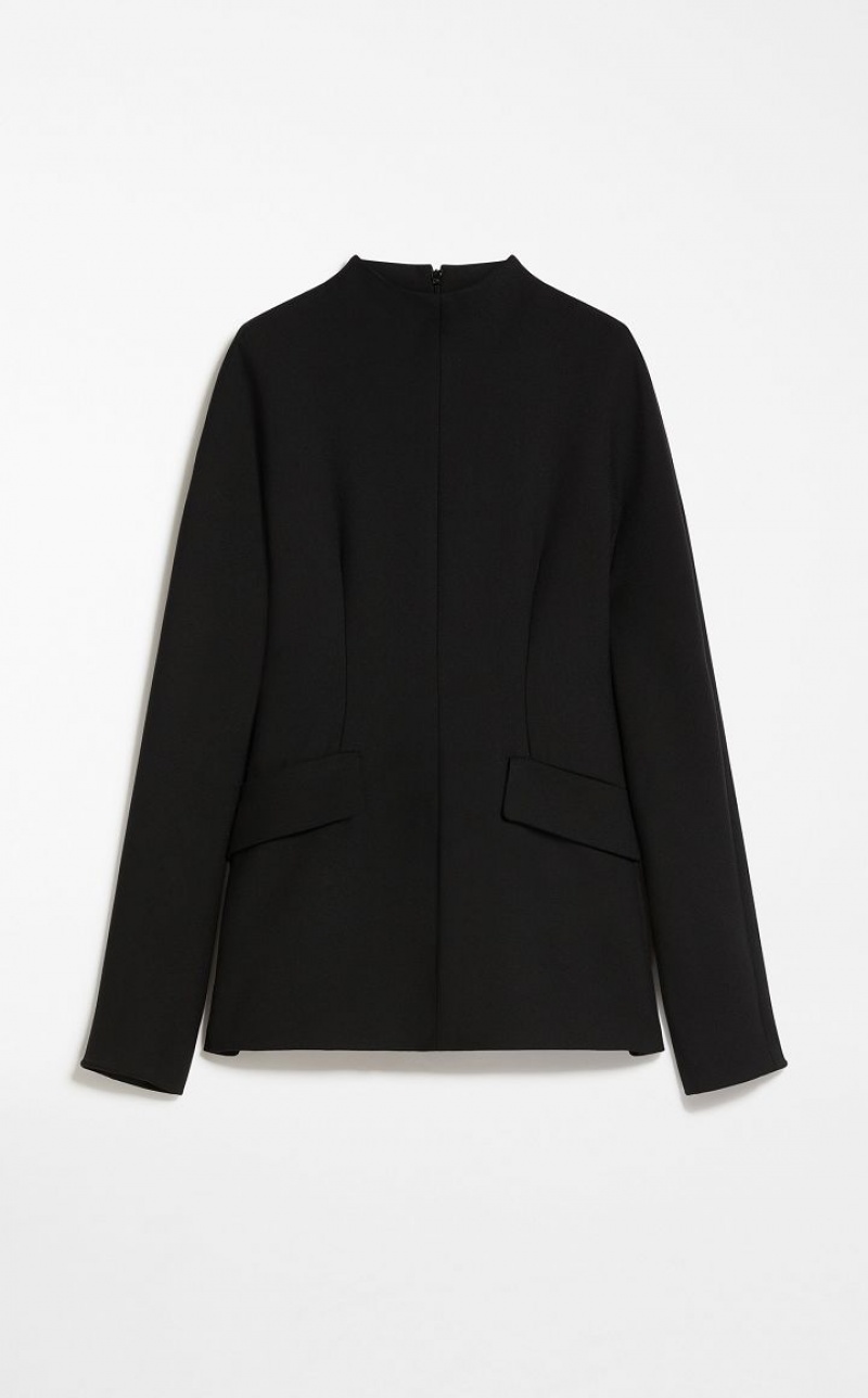Jacket in wool-blend stretch gabardine, with a blouse-effect deconstructed structure and snug fit. The style is fitted at the bust, with darts and shaping that cinch the waist and round off the hips. The kimono construction is completed by a raised collar and centre-back opening with a concealed zip. Flap pockets positioned diagonally on the front. Garment length: 80 cm.