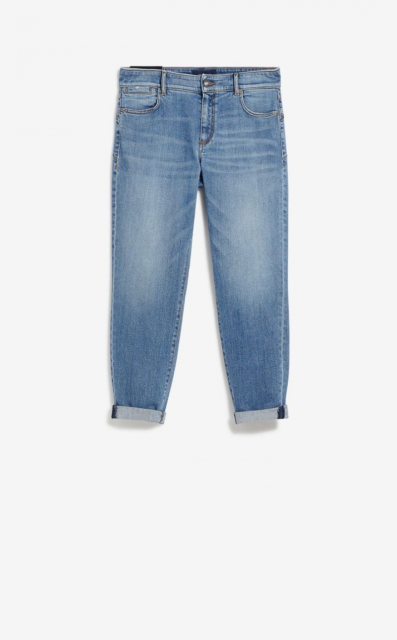 Five-pocket jeans in indigo stretch denim, garment processed with a gently vintage, dark treatment. Cigarette cut, low waist and turn-ups at the ankle. The whole garment features contrasting stitching with tobacco-coloured thread.