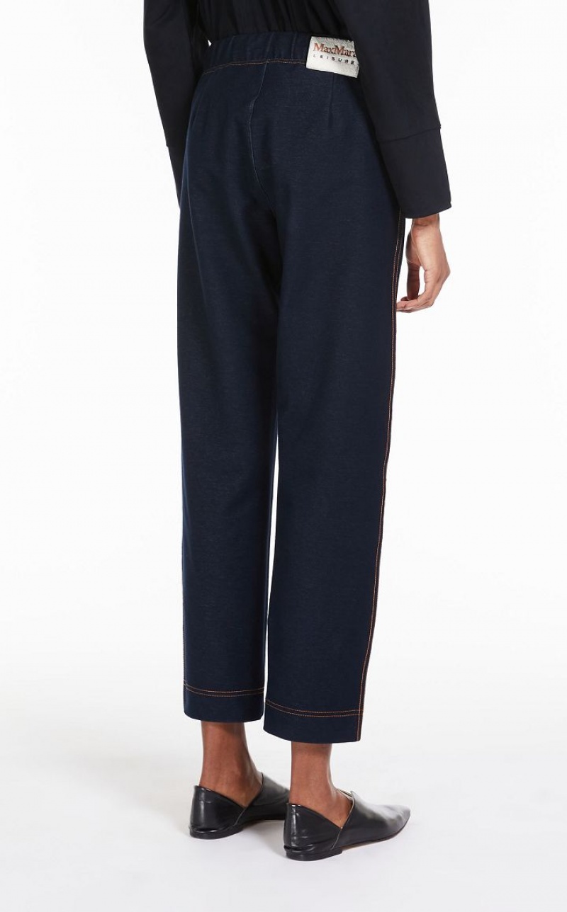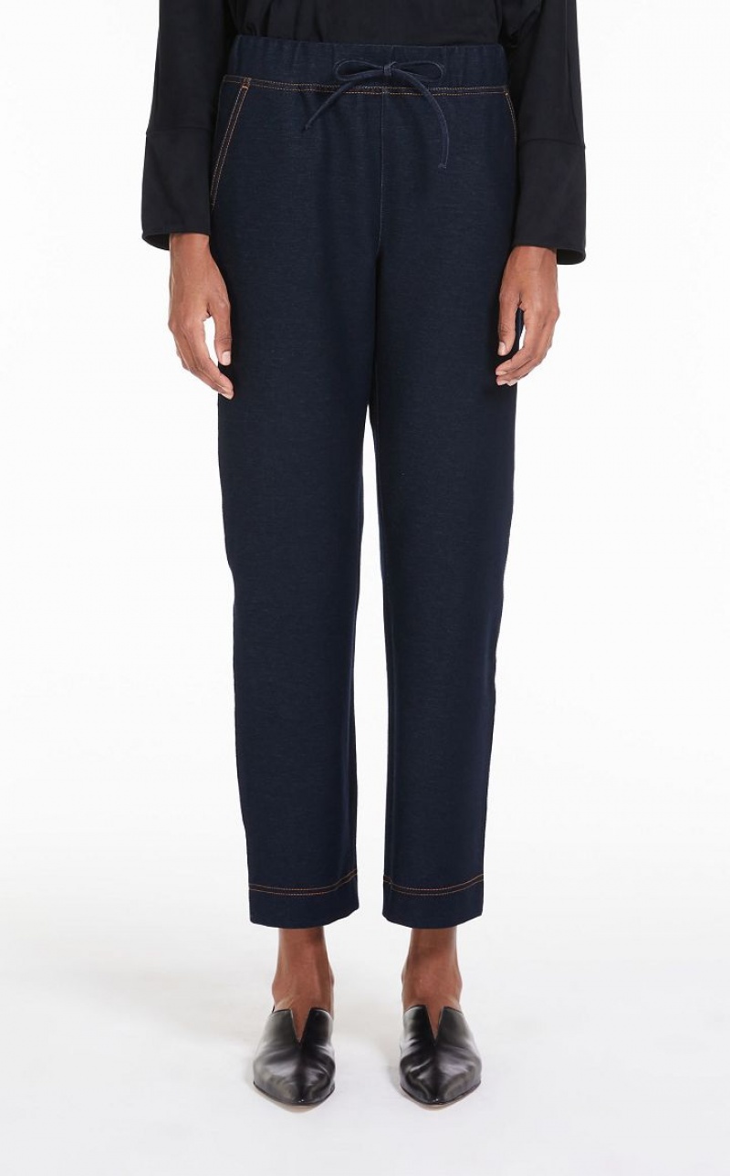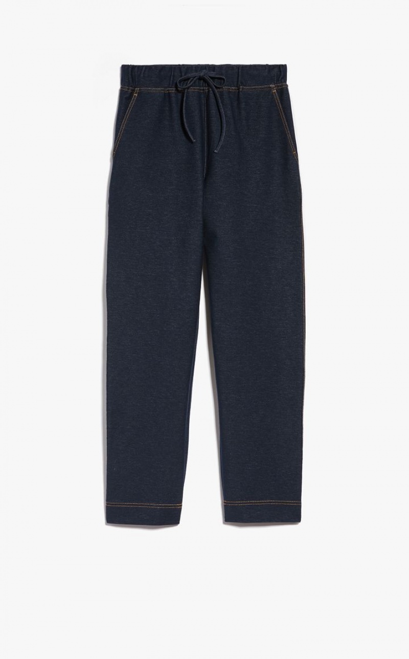 Denim jersey joggers featuring an elasticated waist with drawstring and side pockets. Cropped model at the ankle, embellished with contrasting stitching. Logo label on the back waistband. Length: 98 cm.