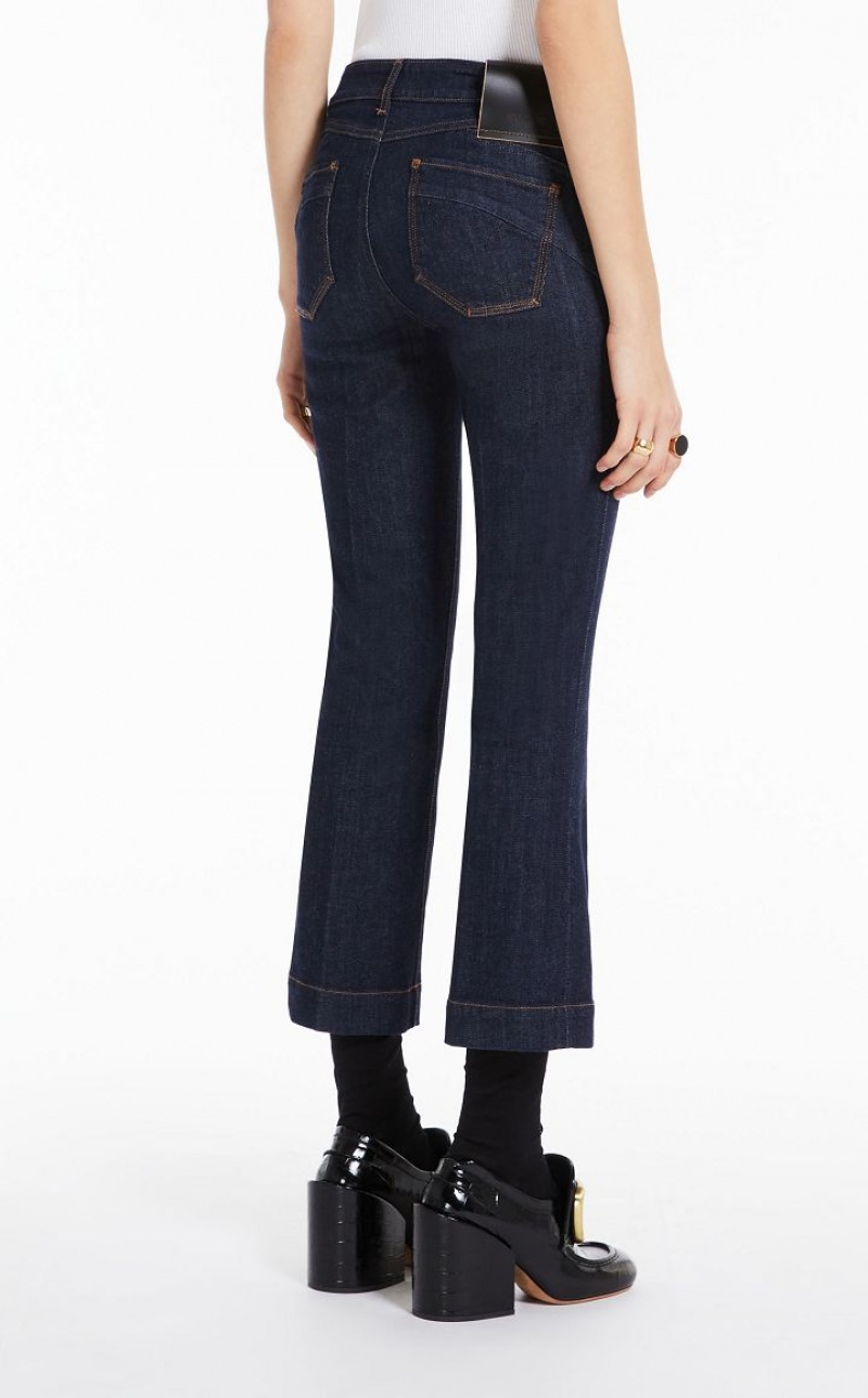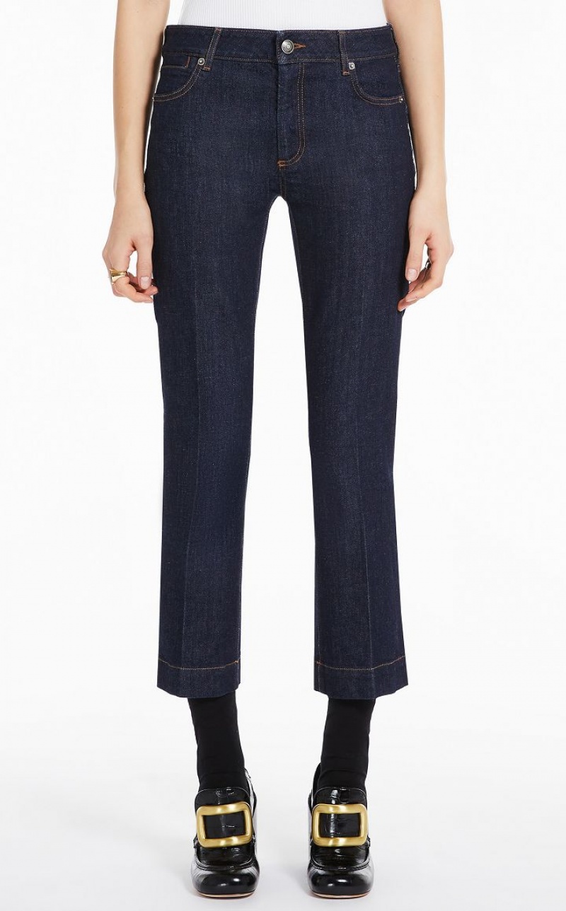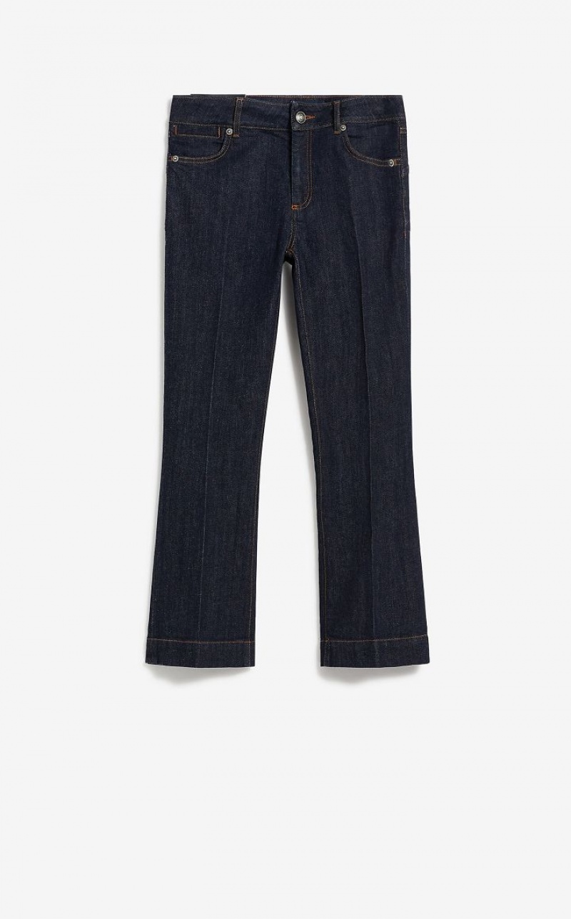 Perfect-fit ankle-length jeans with a slightly flared shape. Coming in indigo stretch denim, they feature a clean dark wash, metal rivet studs and tack button, and contrasting tobacco-brown top-stitching. Pressed pleat leg detail on both the front and back.