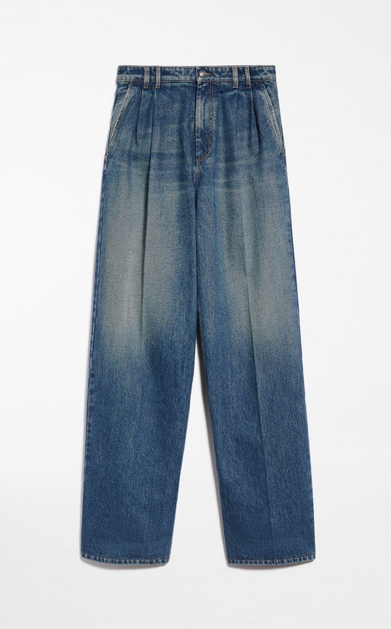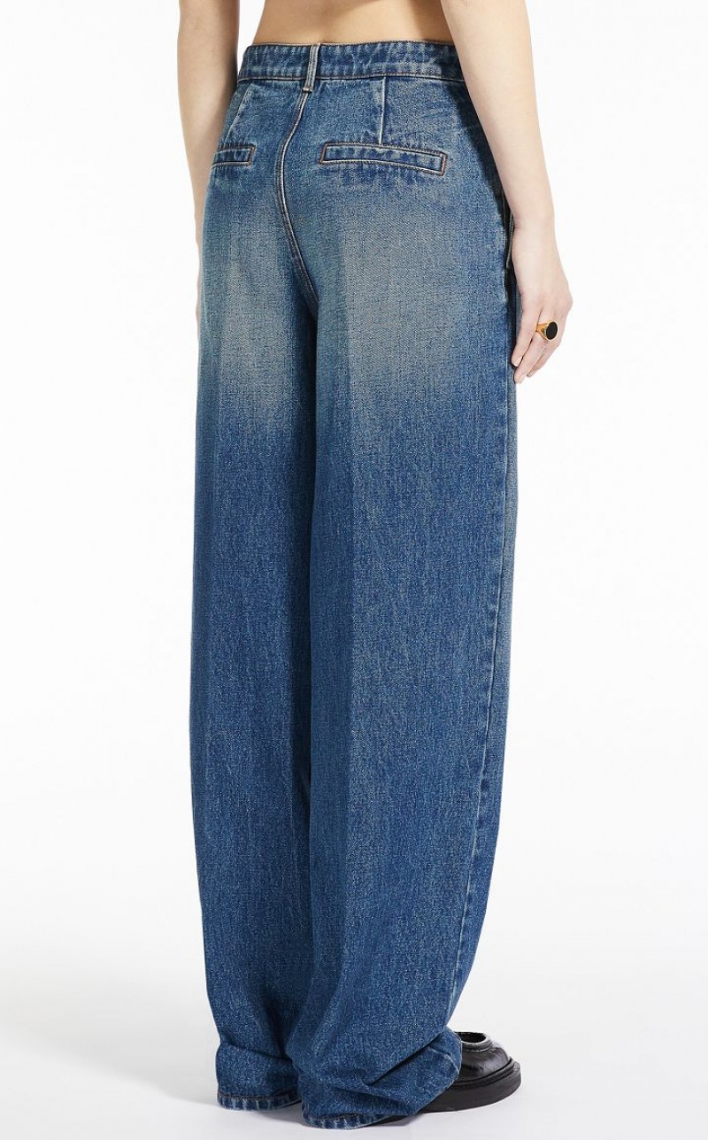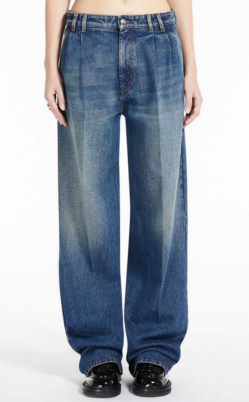Loose-fitting low-waisted trousers made of indigo denim with a vintage treatment. The construction is inspired by tailored styles, with double darts on the front, slant side pockets and back welt pockets, and a trouser crease front and back. All the stitching is in a contrasting tobacco colour. Length: 127 cm.