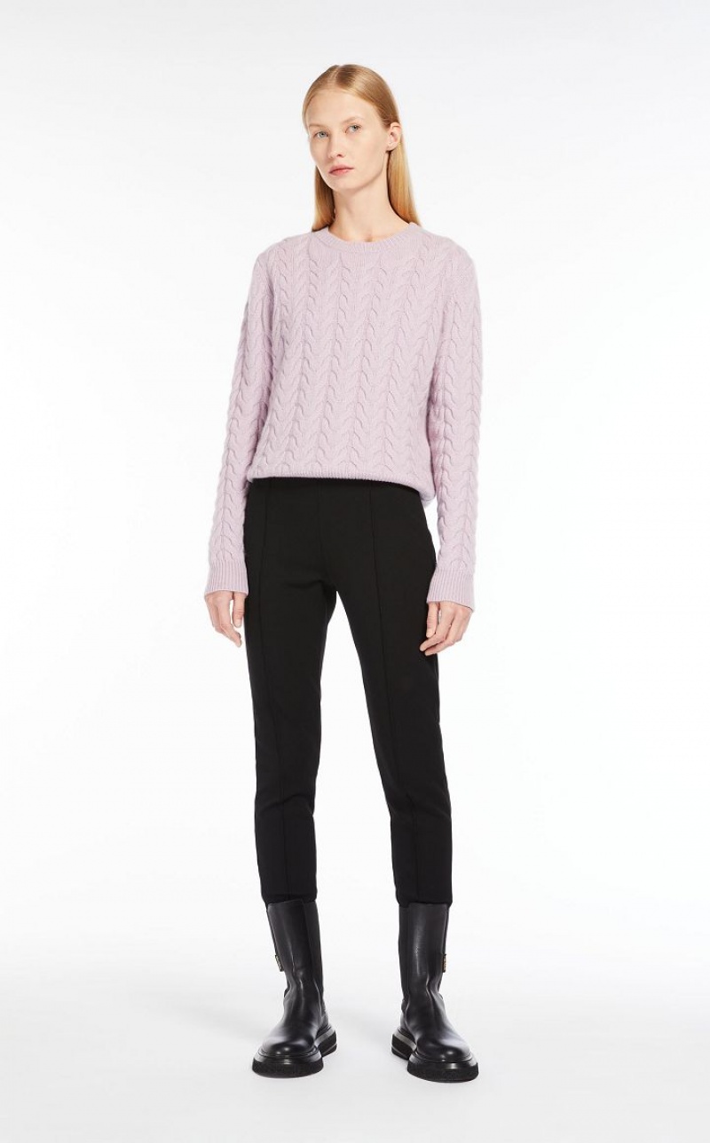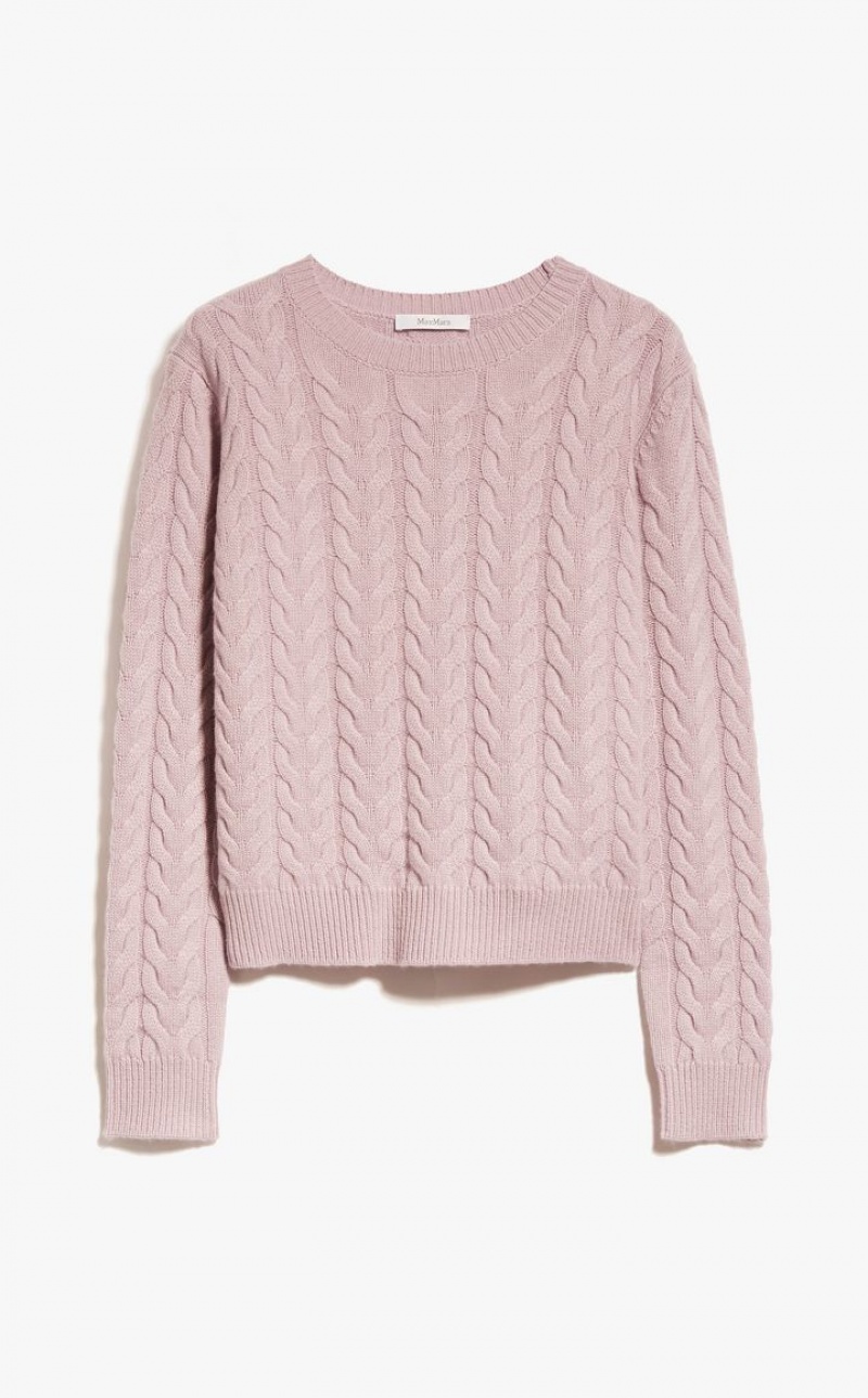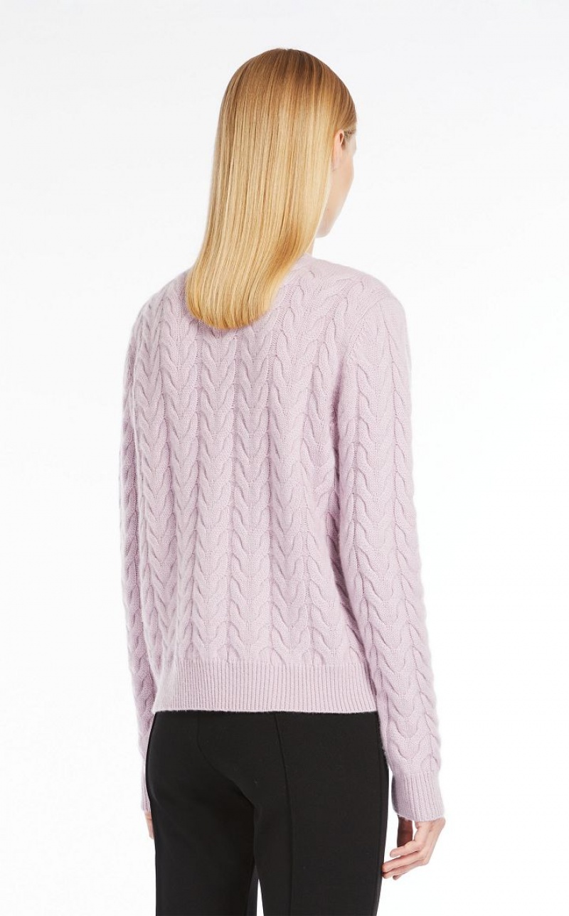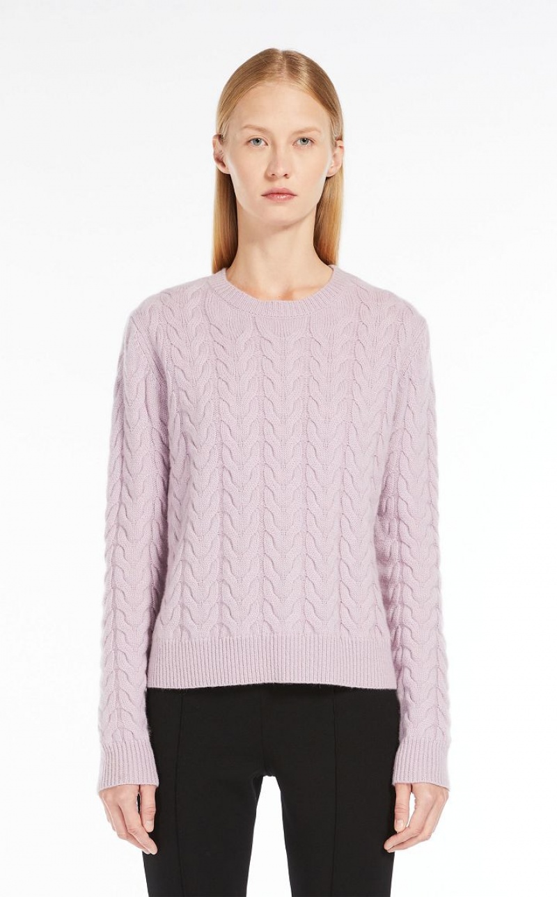 Small pullover in fine pure cashmere yarn with a semi-fitted volume, round neckline and long sleeves. The garment is embellished with an all-over cable knit and ribbed edges. Length: 55 cm.