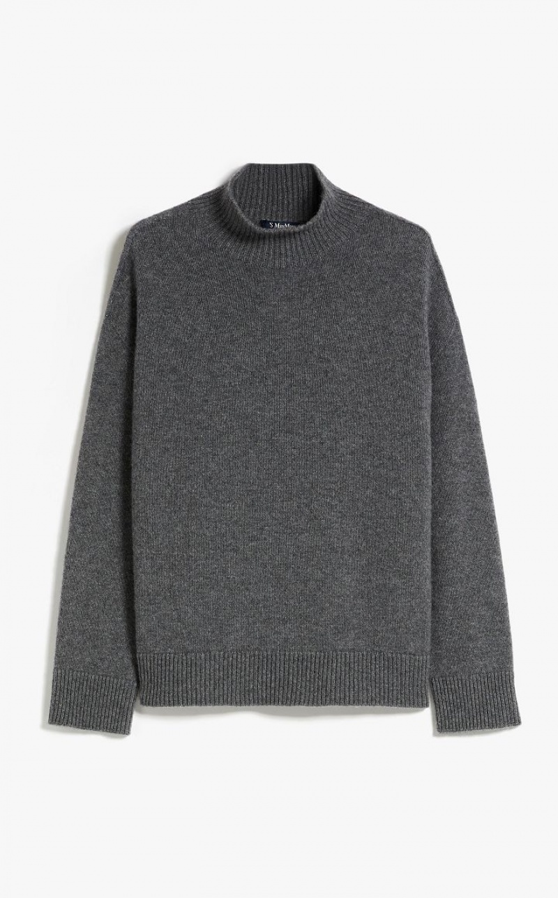 Relaxed-fit polo-neck sweater in fine pure cashmere yarn featuring a high neck, long low set-in sleeves and side slit detail at the hem. Rib-knit neck, cuffs and hem. Length: 64 cm.