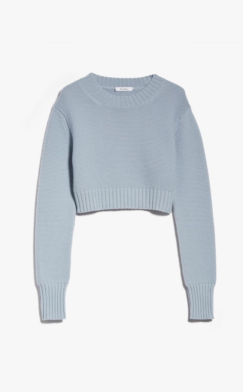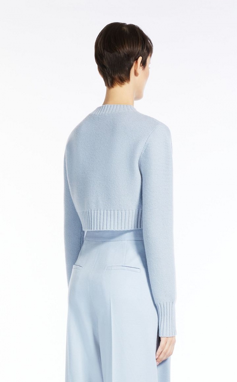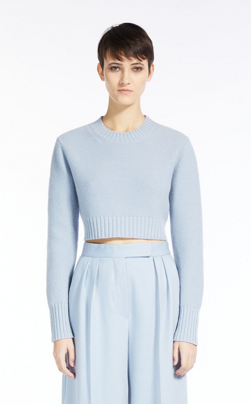 Cropped, long-sleeved jumper, made of fine pure cashmere yarn in a links-stitch knit. Crew-neck style finished with ribbed edges. Length: 40 cm.
