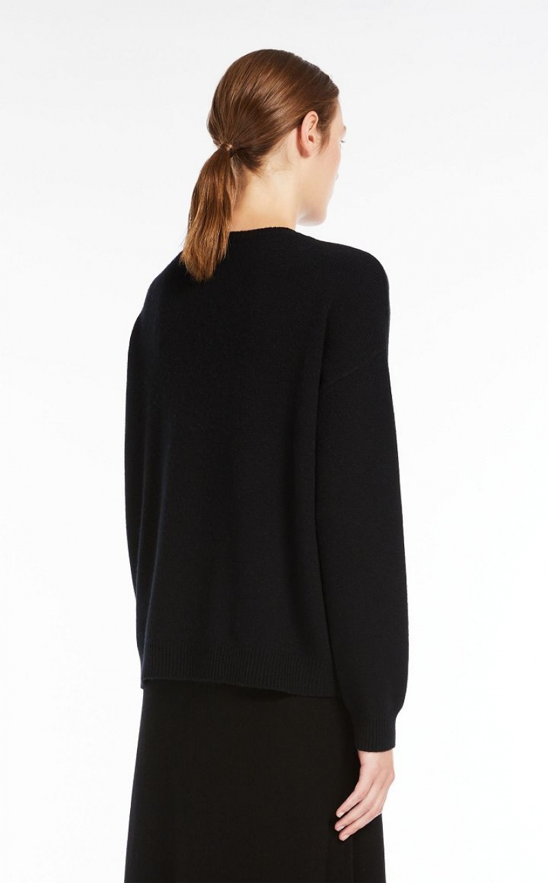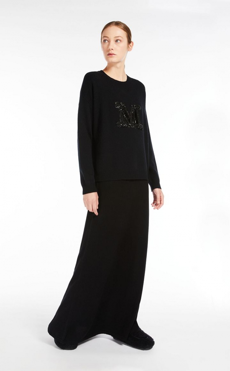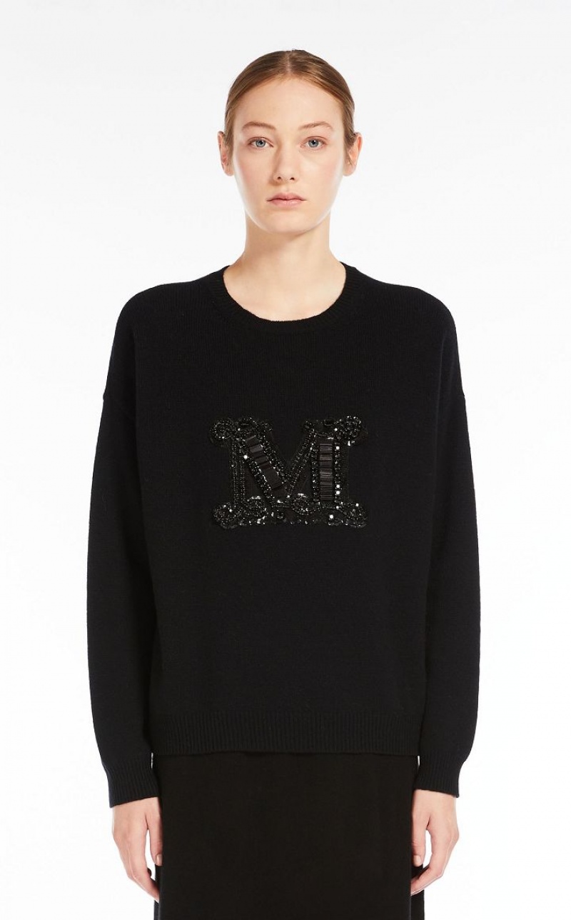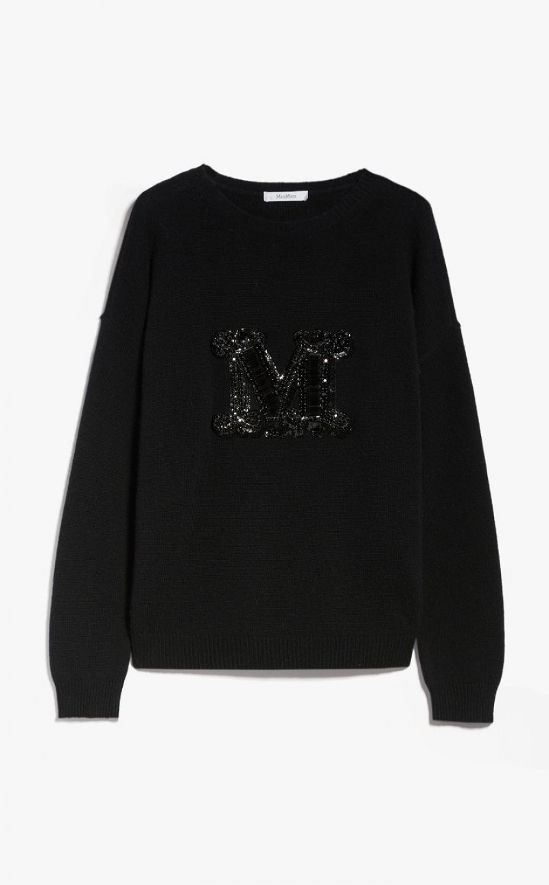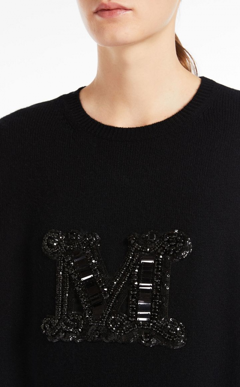 Jumper in exquisite pure cashmere yarn, featuring a round neck and long sleeves with dropped shoulders. Slightly oversized relaxed fit style, embellished with a jewel appliqué that reproduces the M Monogram logo on the front. Finished with ribbed edges. Length: 65 cm.