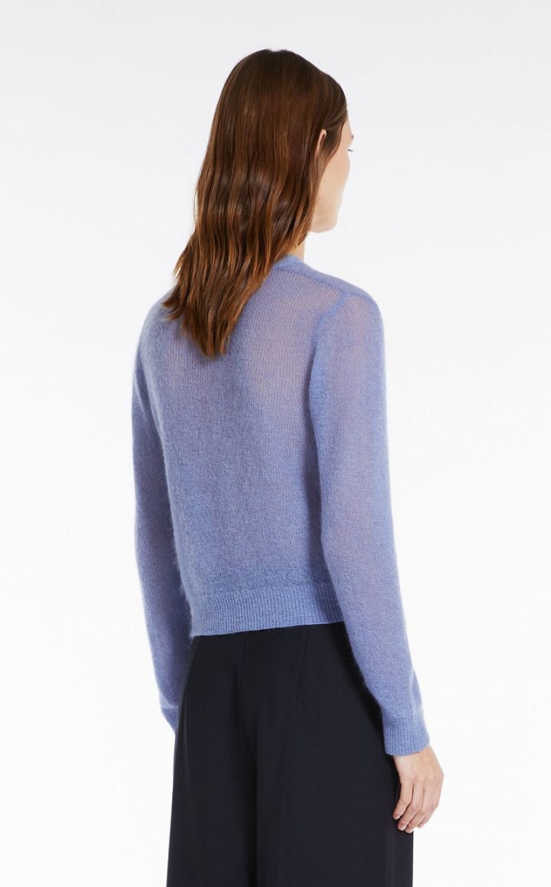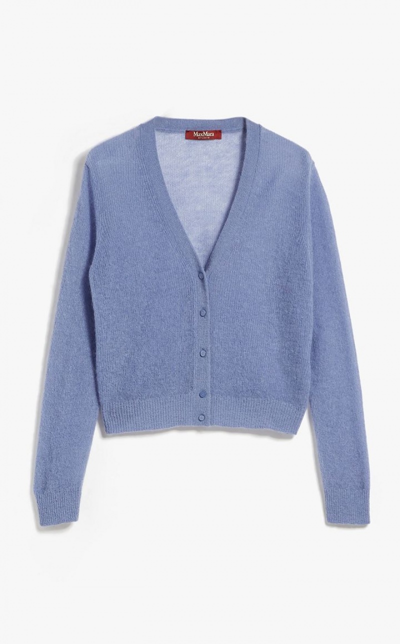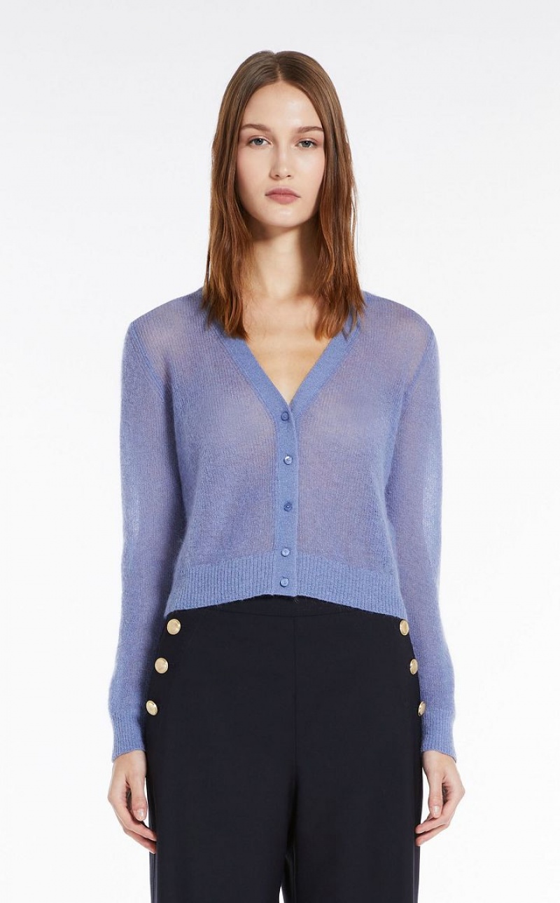Half fisherman’s-knit long-sleeved V-neck cardigan in fine mohair gauze fabric. Rib-knit cuffs and deep hem. Button fastening. Length: 52 cm.