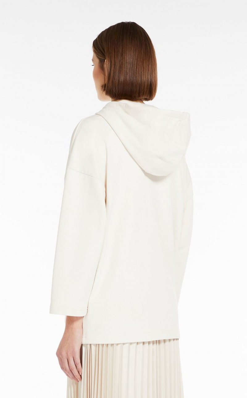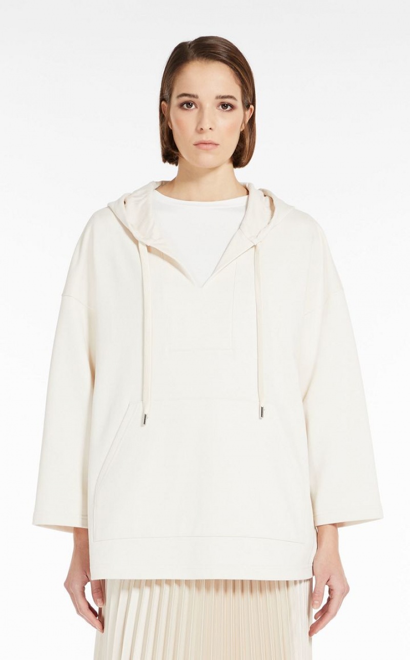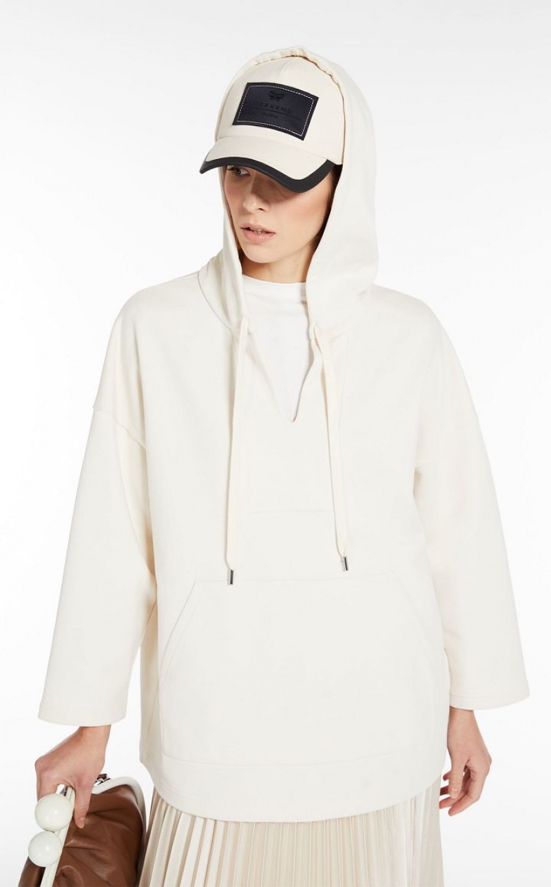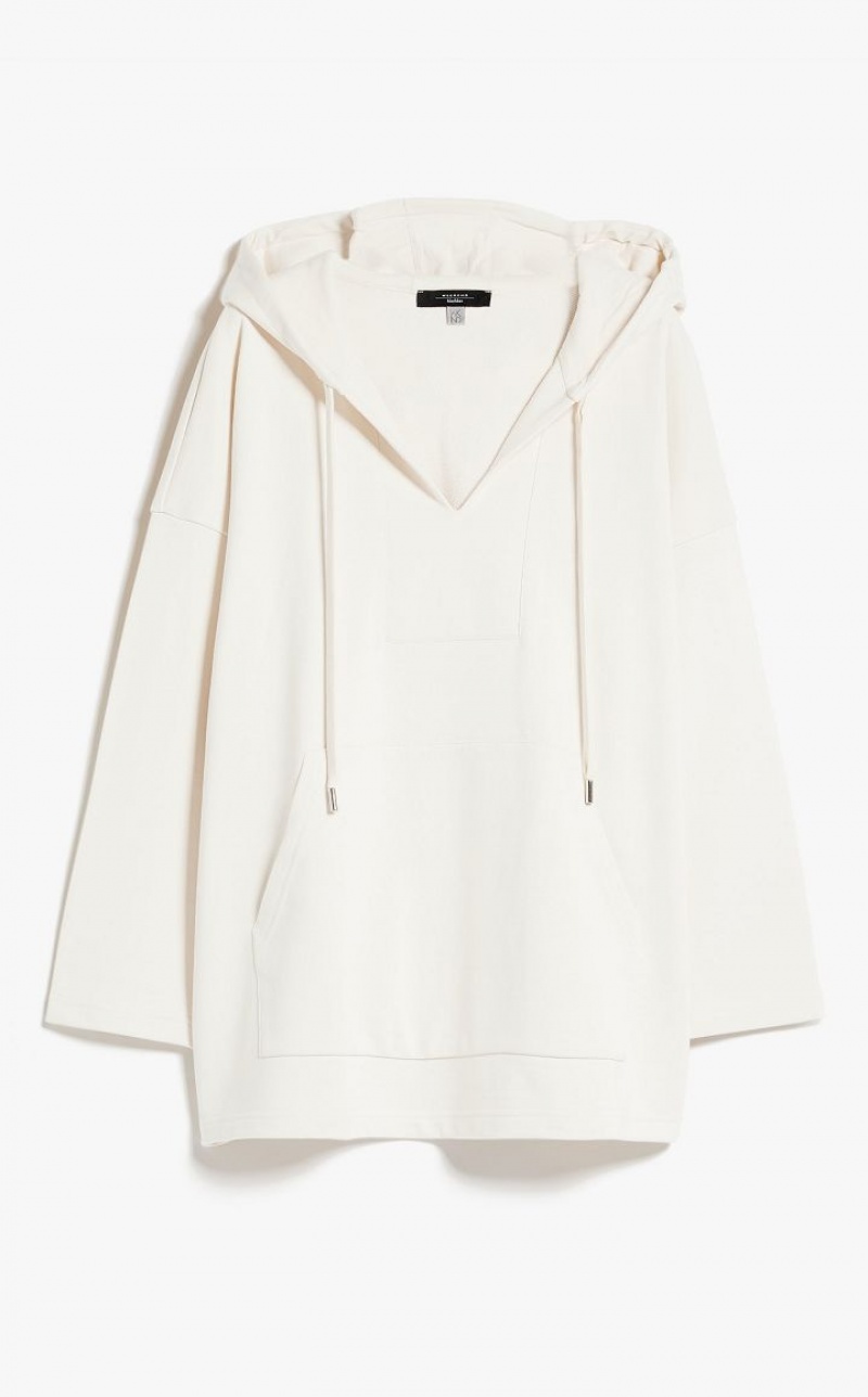 Oversized sweatshirt in soft cotton jersey. Straight-cut style with drawstring hood, with V-neck on the front, central pouch pocket and long full sleeves with dropped shoulders. Trimmed with small butterfly logo embroidered on the rear hem. Length: 70 cm.