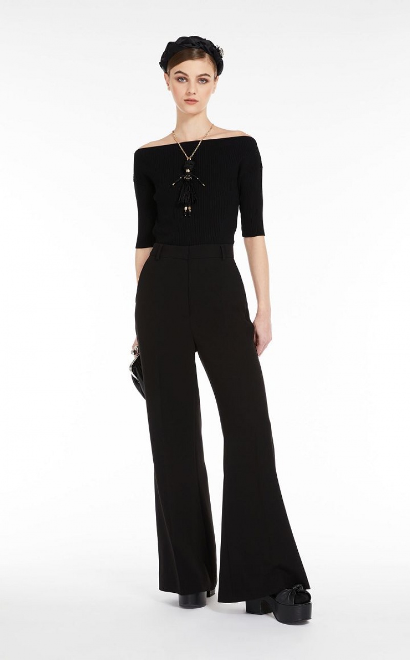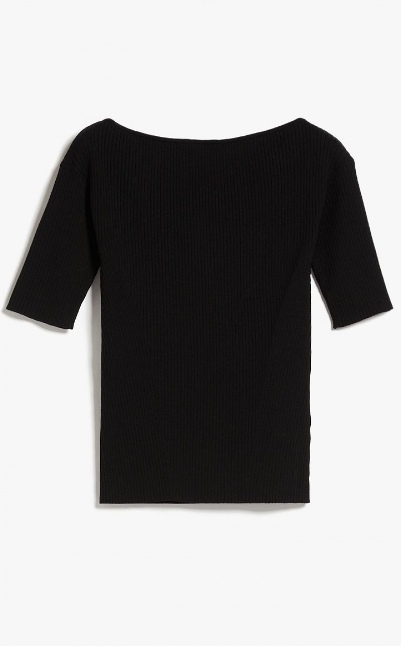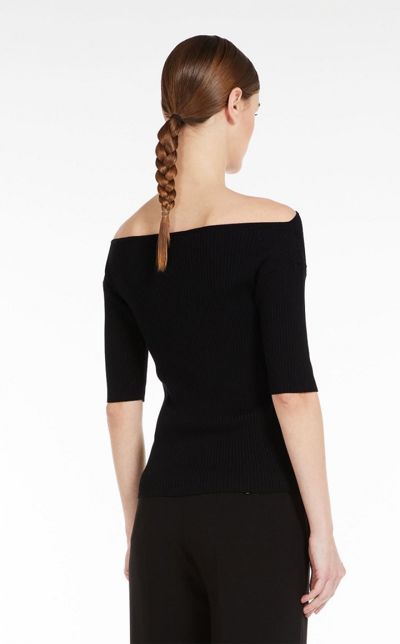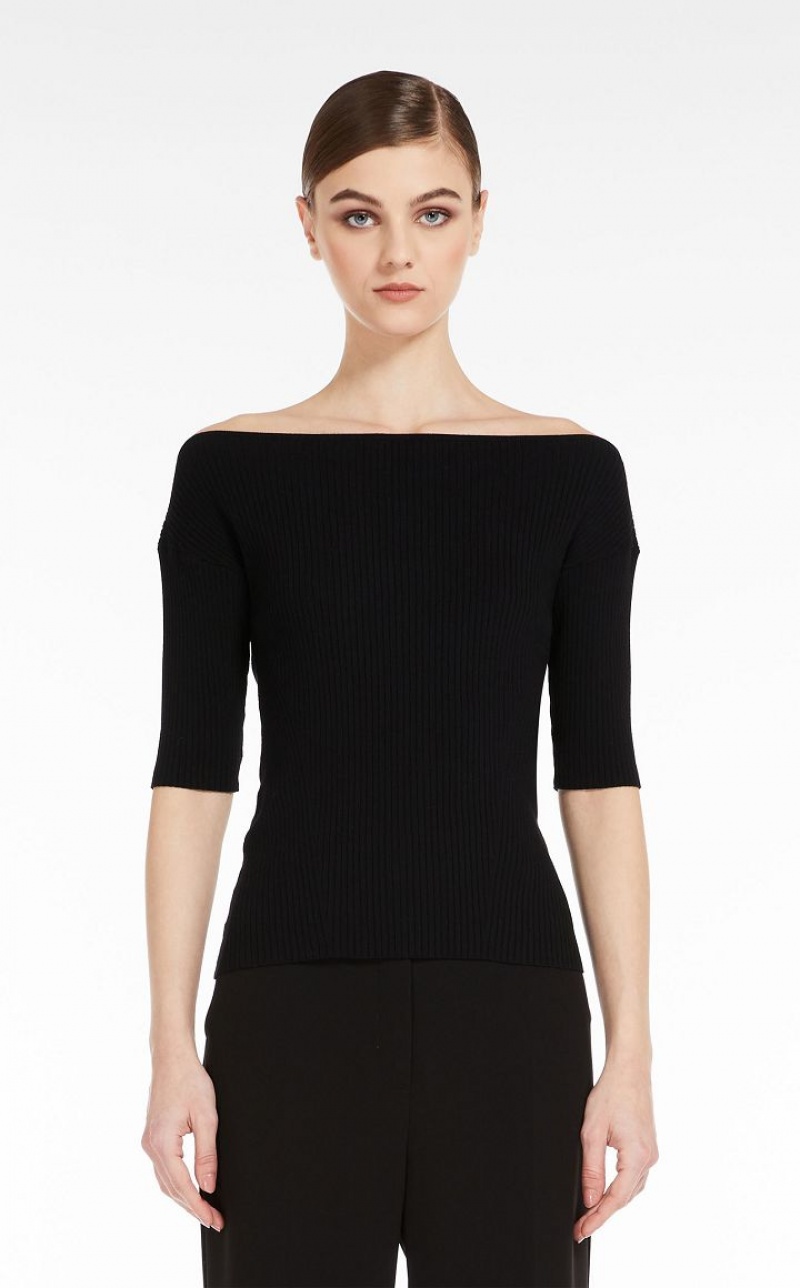 Off-the-shoulder top in stretch viscose yarn. This style features a rib knit to accentuate the fitted, feminine silhouette, with boat neck and elbow-length sleeves.