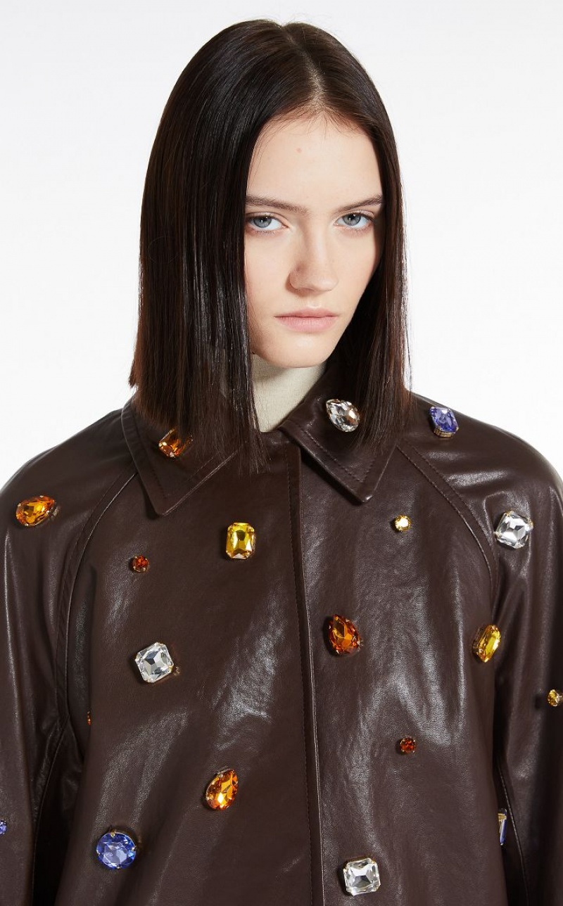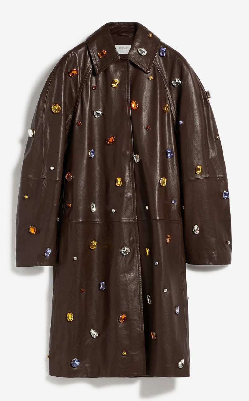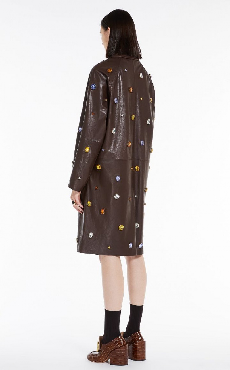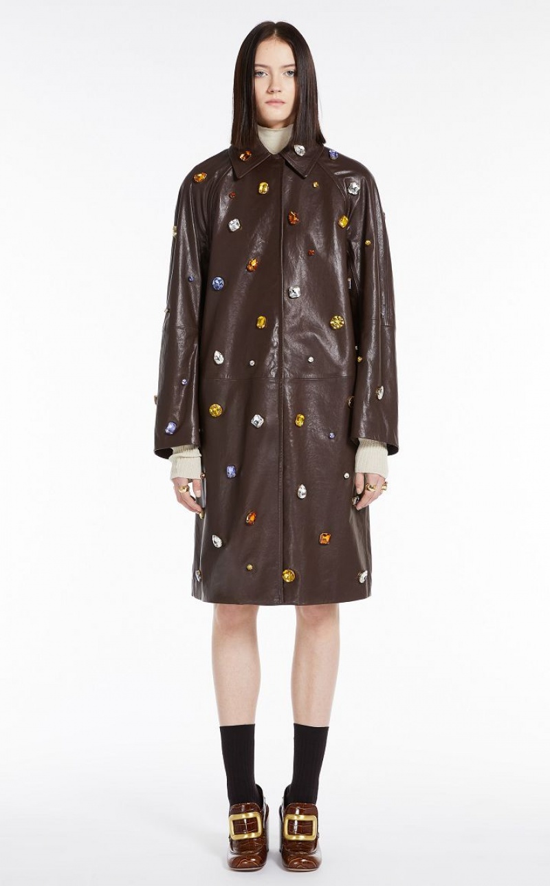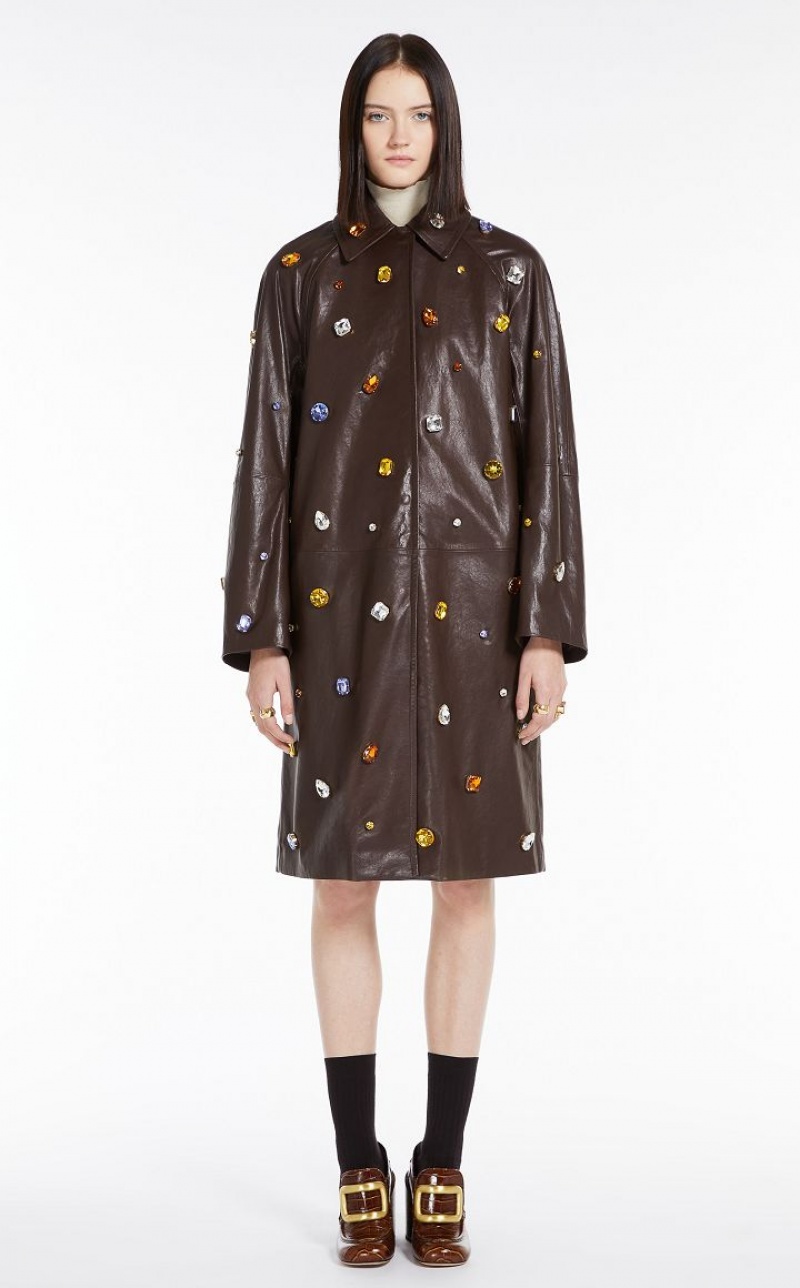 Coat in lined nappa leather, decorated with coloured gems applied all over. The straight line, with shirt collar, pockets inserted down the sides and raglan sleeves inspired by raincoats. Concealed front fastening with press studs. Below-the-knee length.