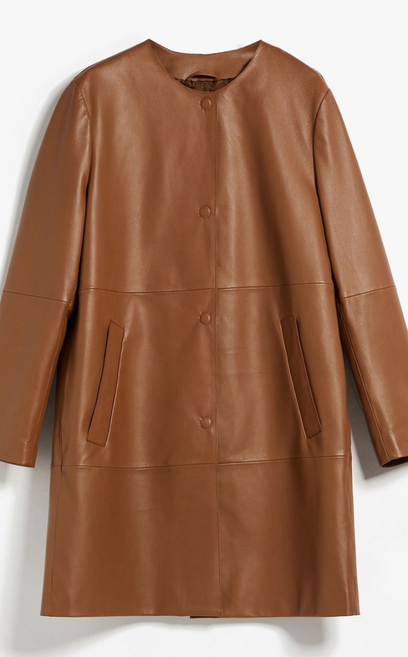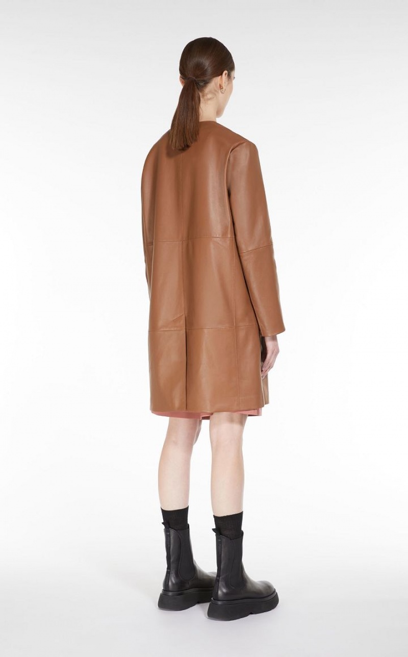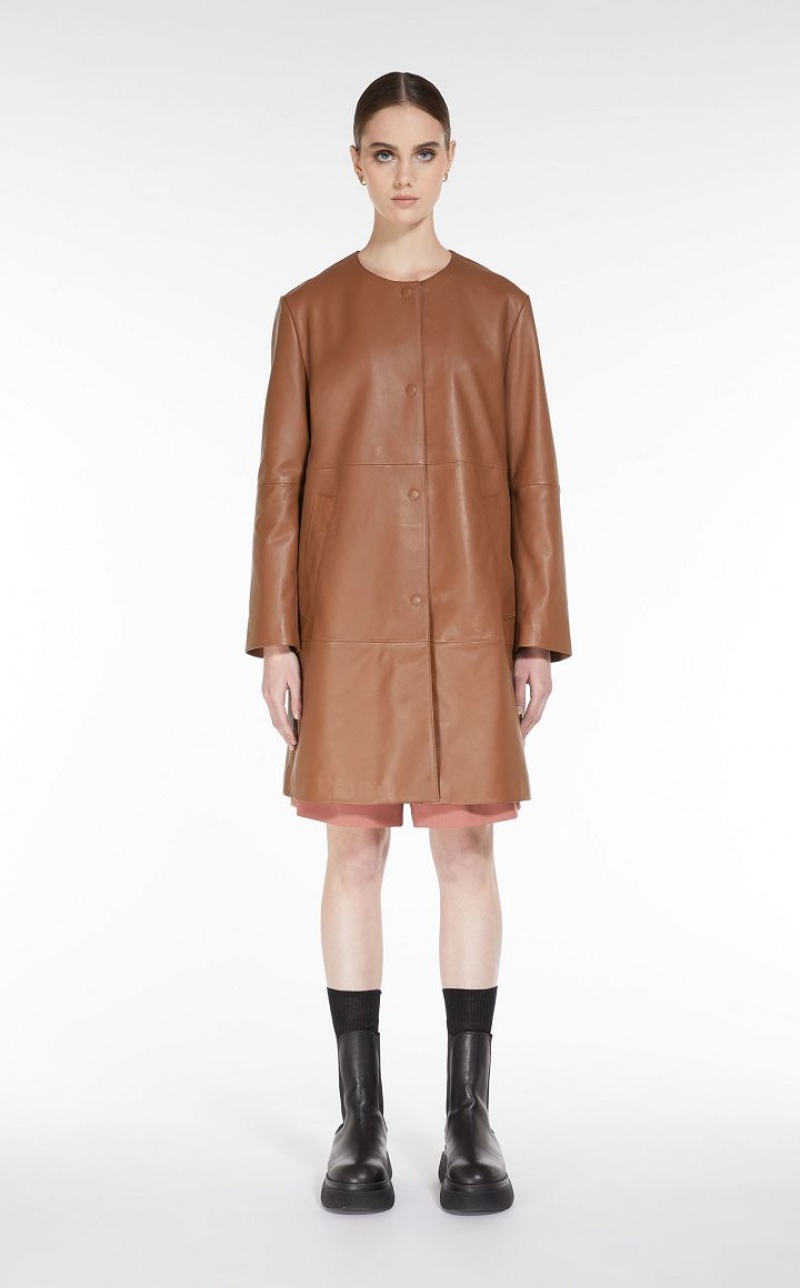 Duster coat in soft nappa leather. Lined style with a straight cut, featuring a round neck, long set-in sleeves, slanted pockets and central vent at the back. Front fastening with concealed press studs with decorative stitching.