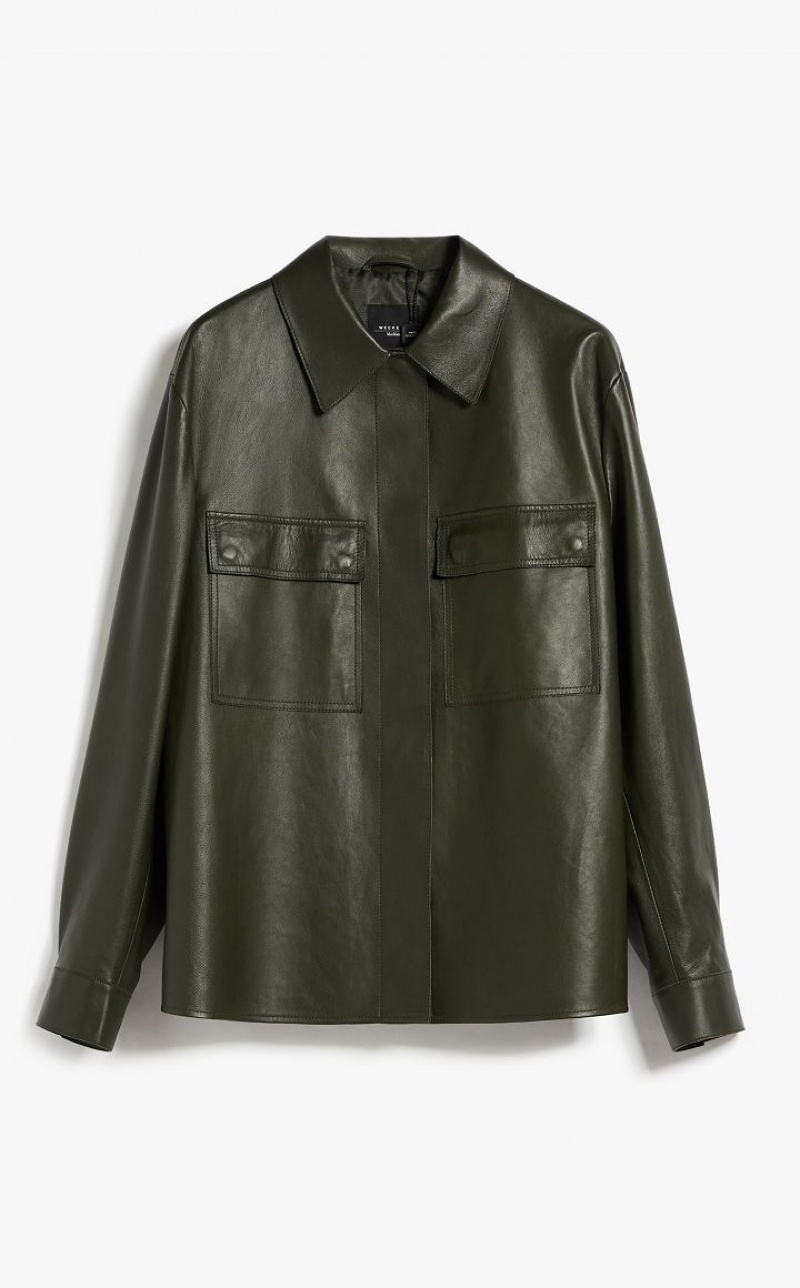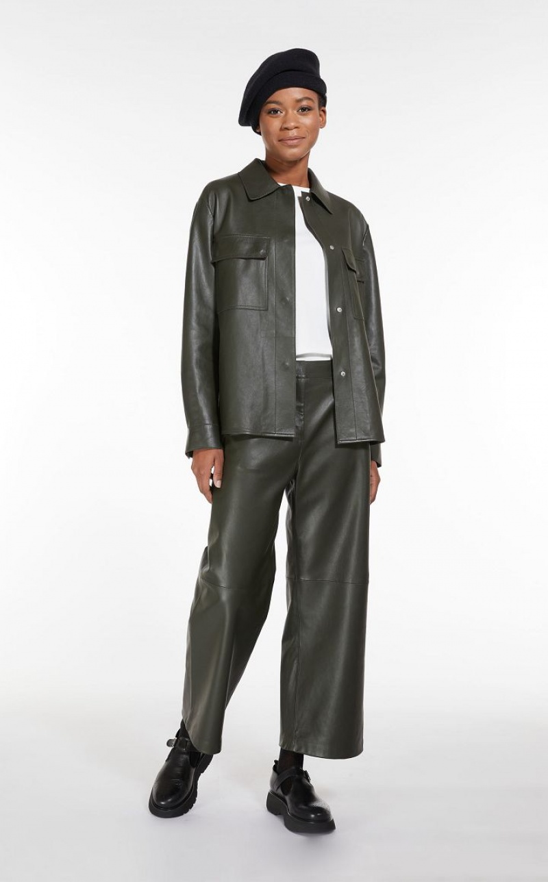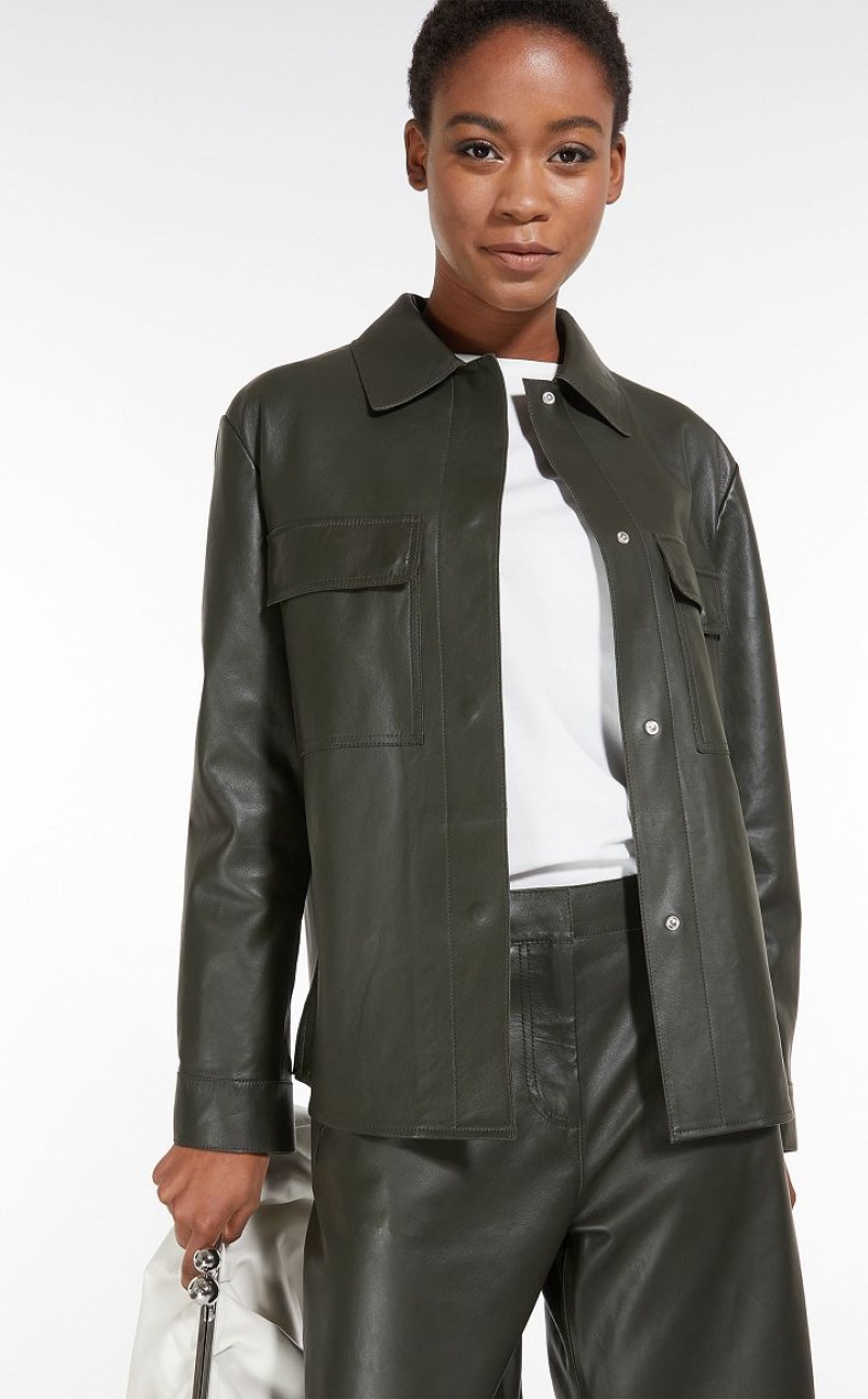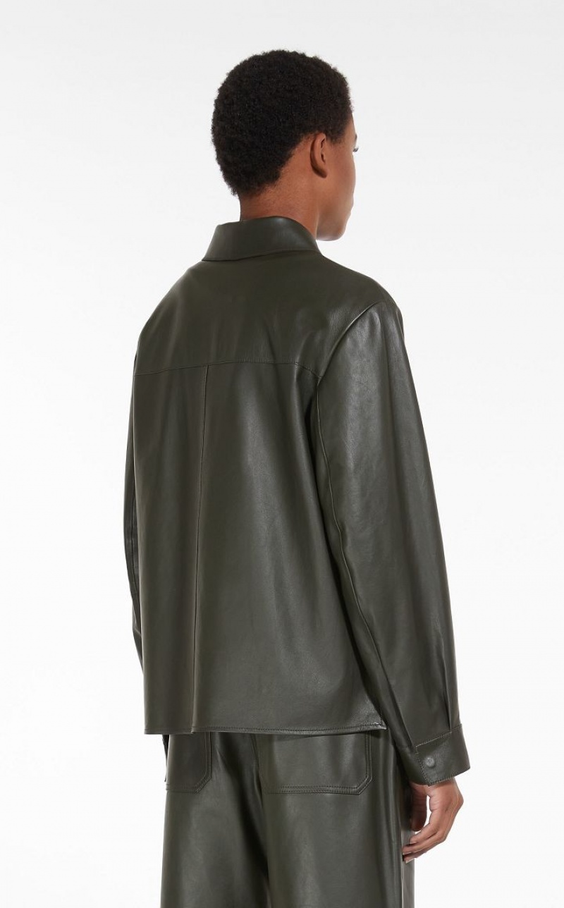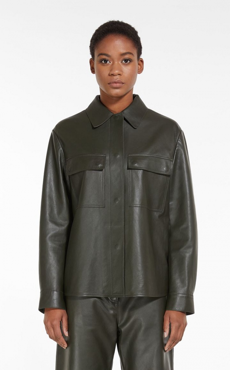 Shirt-style jacket in soft nappa leather. Lined style featuring classic details: point collar, loose sleeves with cuffs, side slits at the hem, and large, military-style patch pockets on the front. Front fastening with concealed press studs.