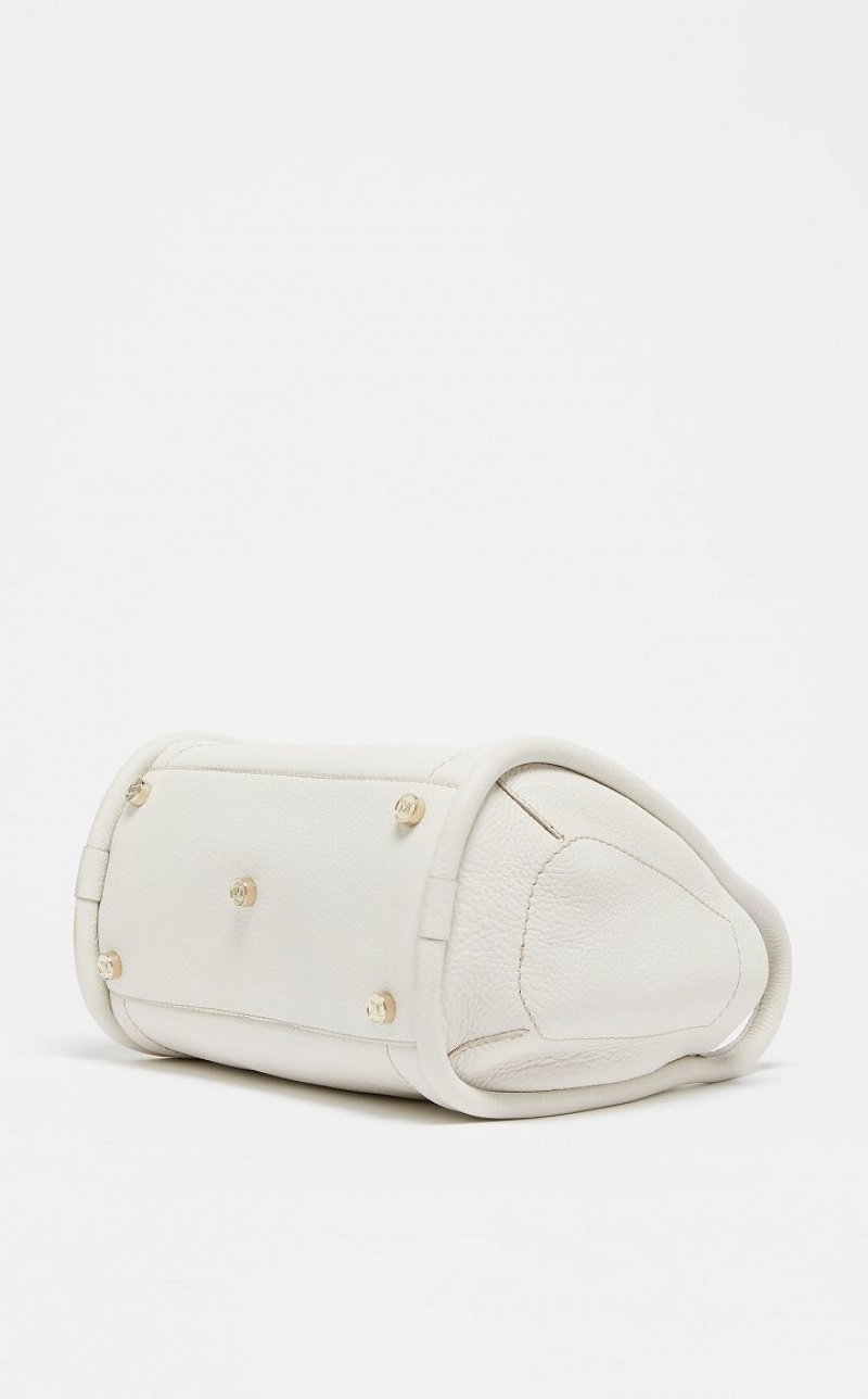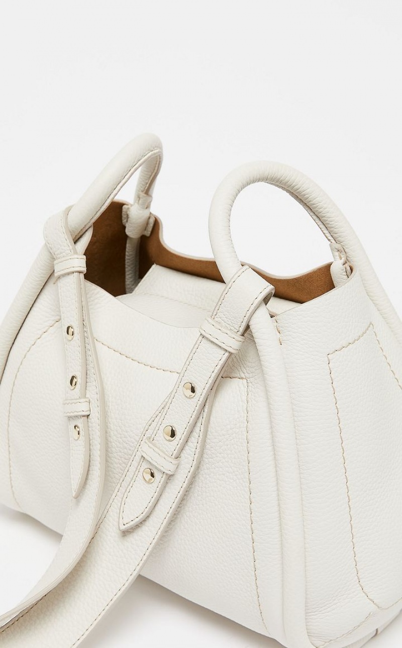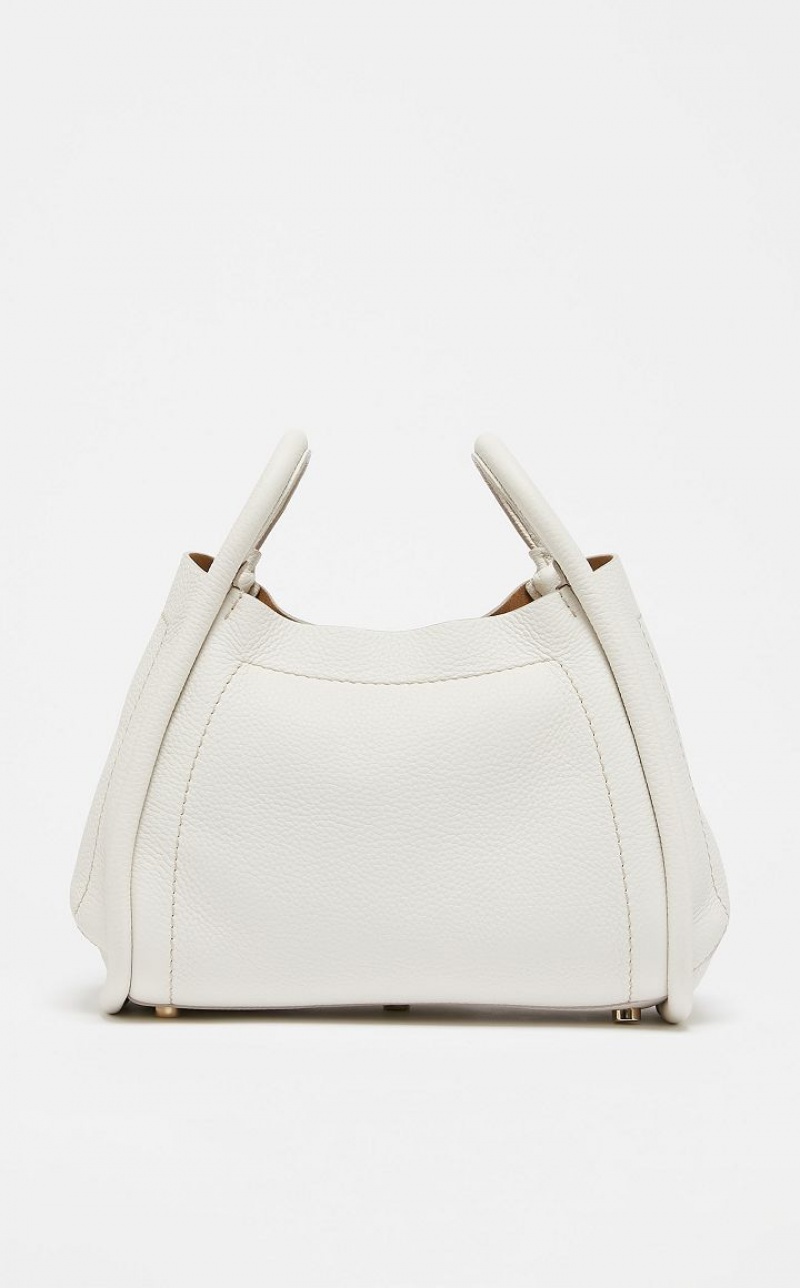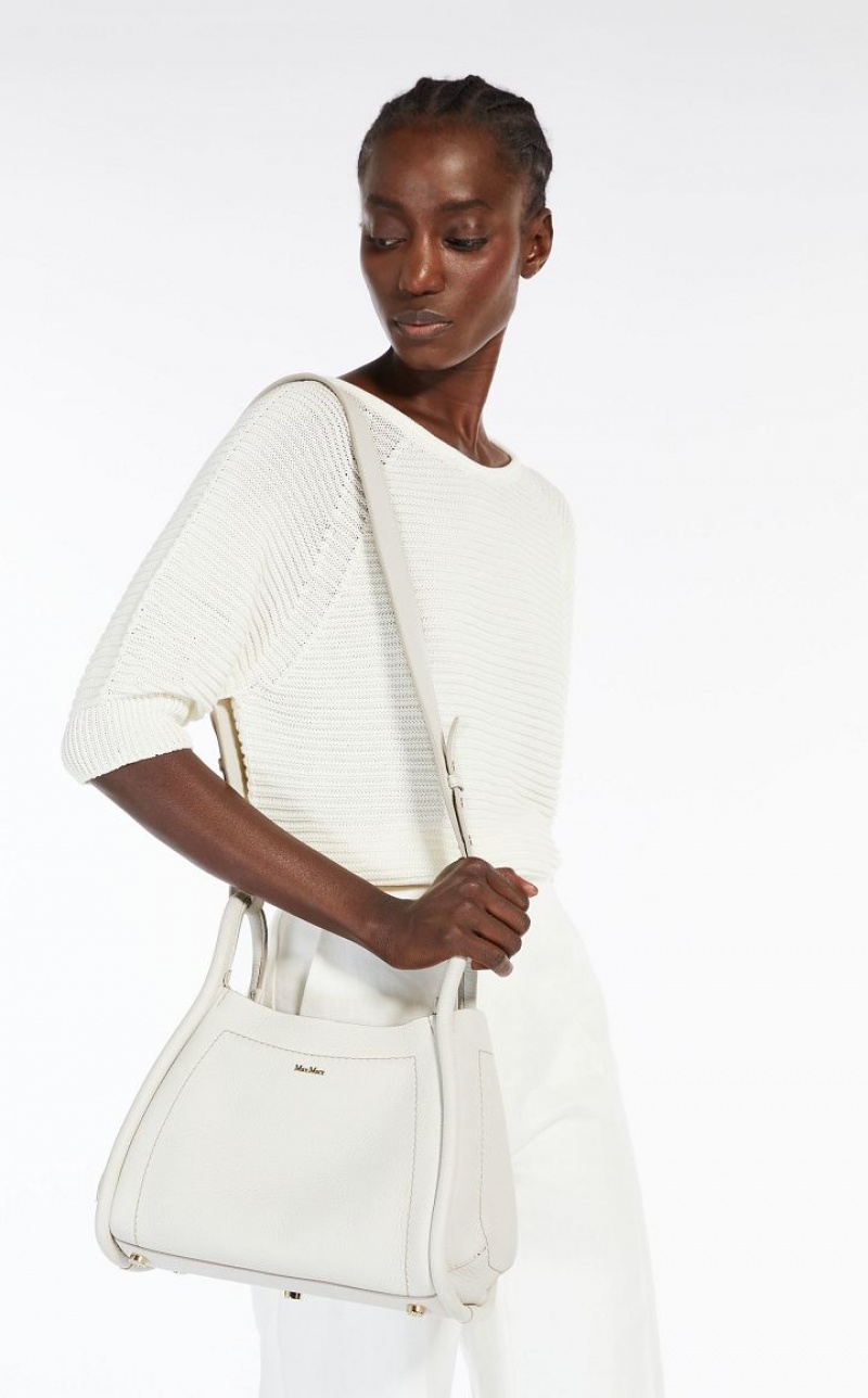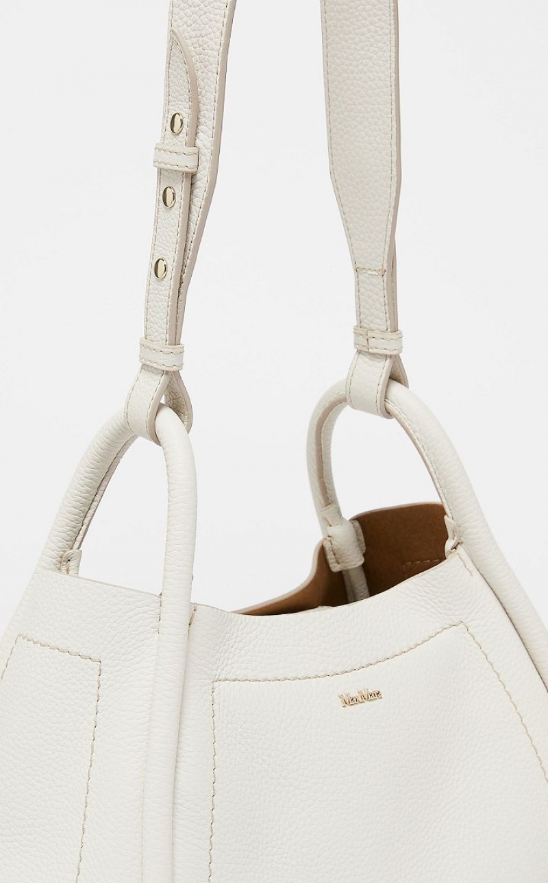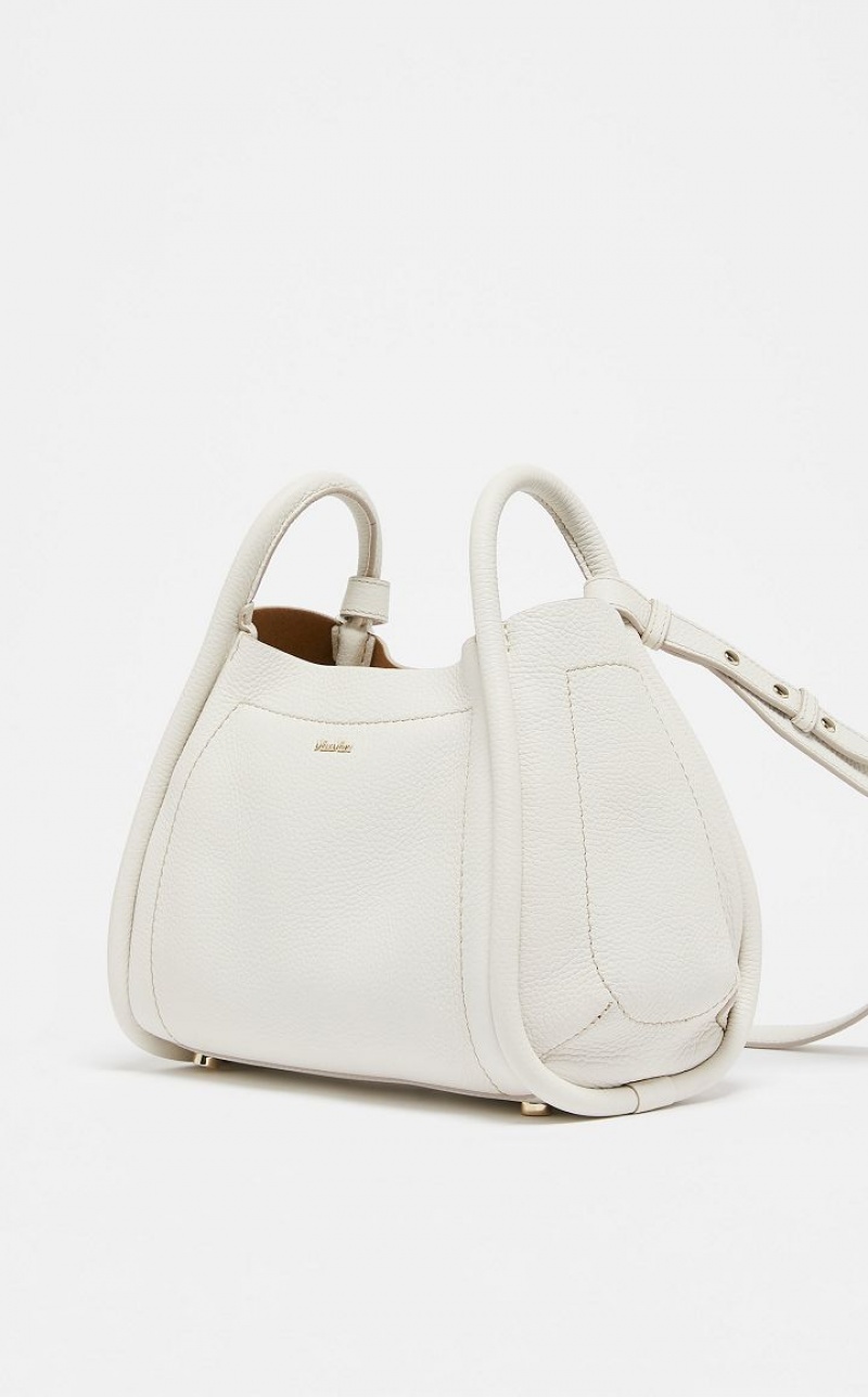 Marine bag in calfskin with a characteristic hammered texture. Proposed in a new cross body version with removable shoulder strap, it stands out thanks to its rounded shape and the iconic tubular handles enabling it to be carried by hand. The compact but spacious design is complemented by two internal pockets. Finished with Max Mara metal lettering applied to the front and metal feet. closed at the top by a flap with double magnetic clasp. Dimensions: 23 x 17 x 20 cm.