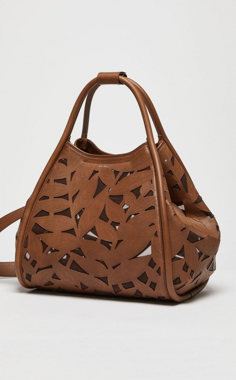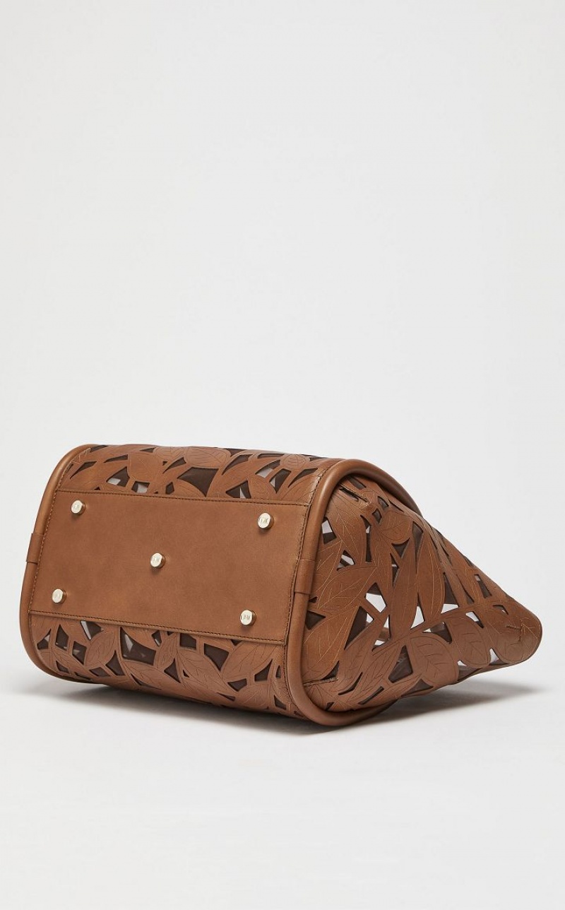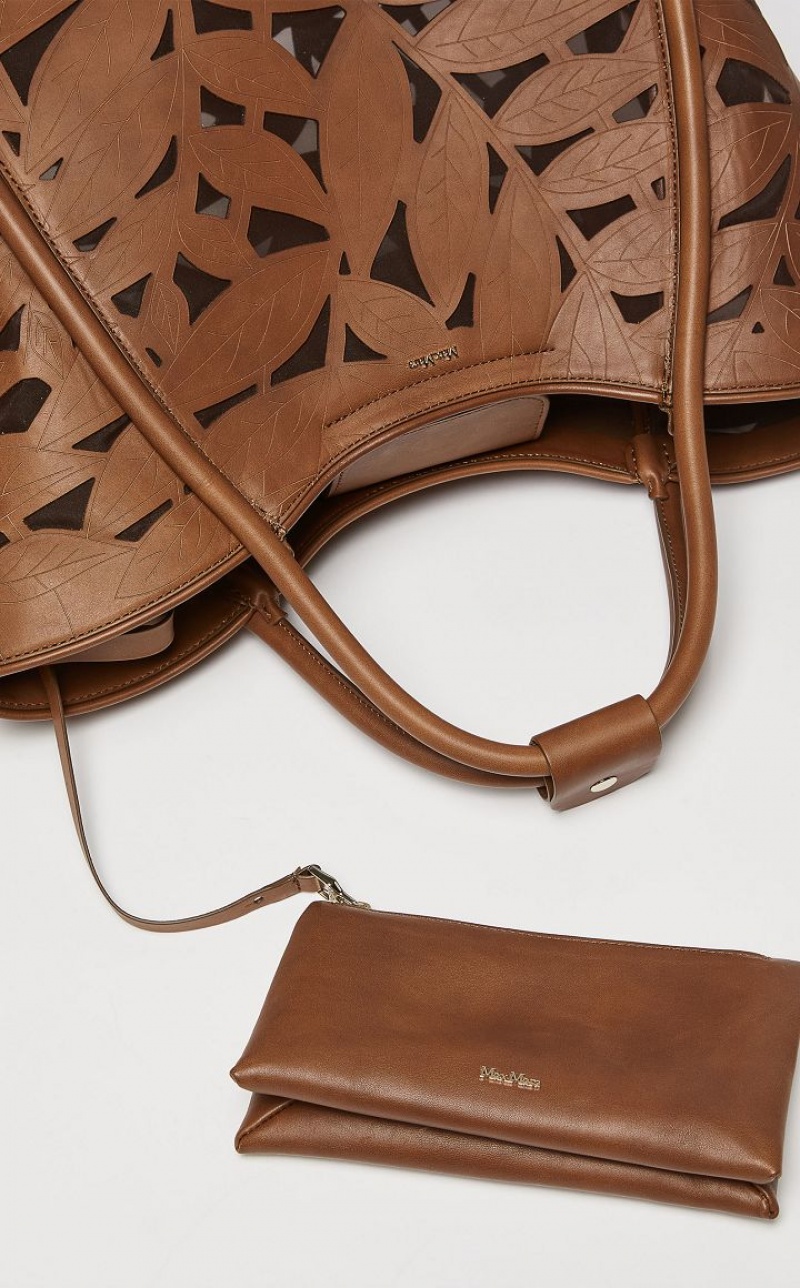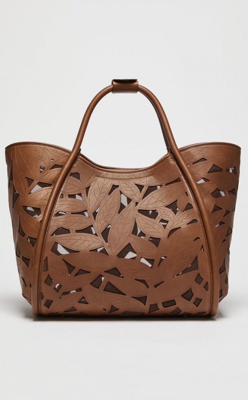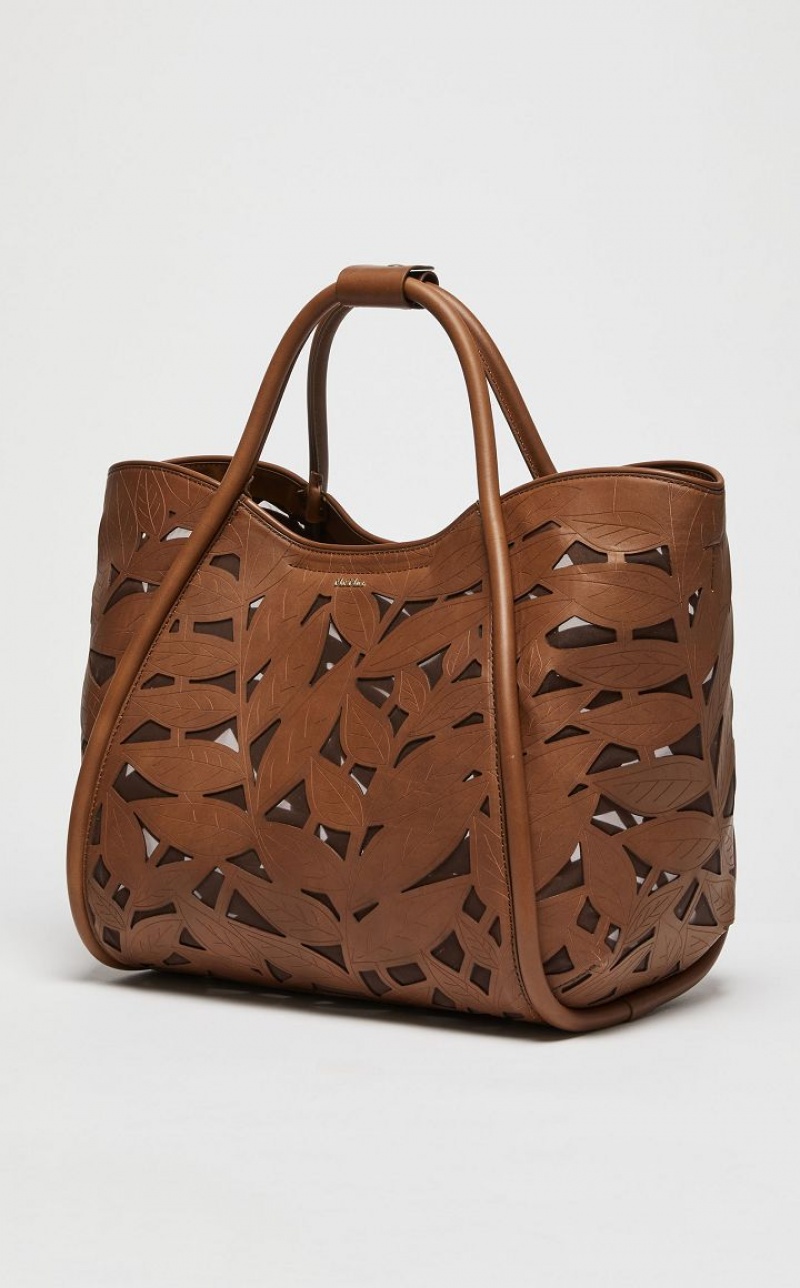 Marine tote bag in carved, laser cut leather with with foliage motif, on a very light mesh base with a see through effect. The style has a double handle, side strap to close the sides and a detachable shoulder strap with internal ring, so it can be carried by hand or on the shoulder. Unlined interior with removable zip pouch. Embellished with metal lettering, leather bottom and metal feet. Measurements: 47 x 26 x 30 cm.