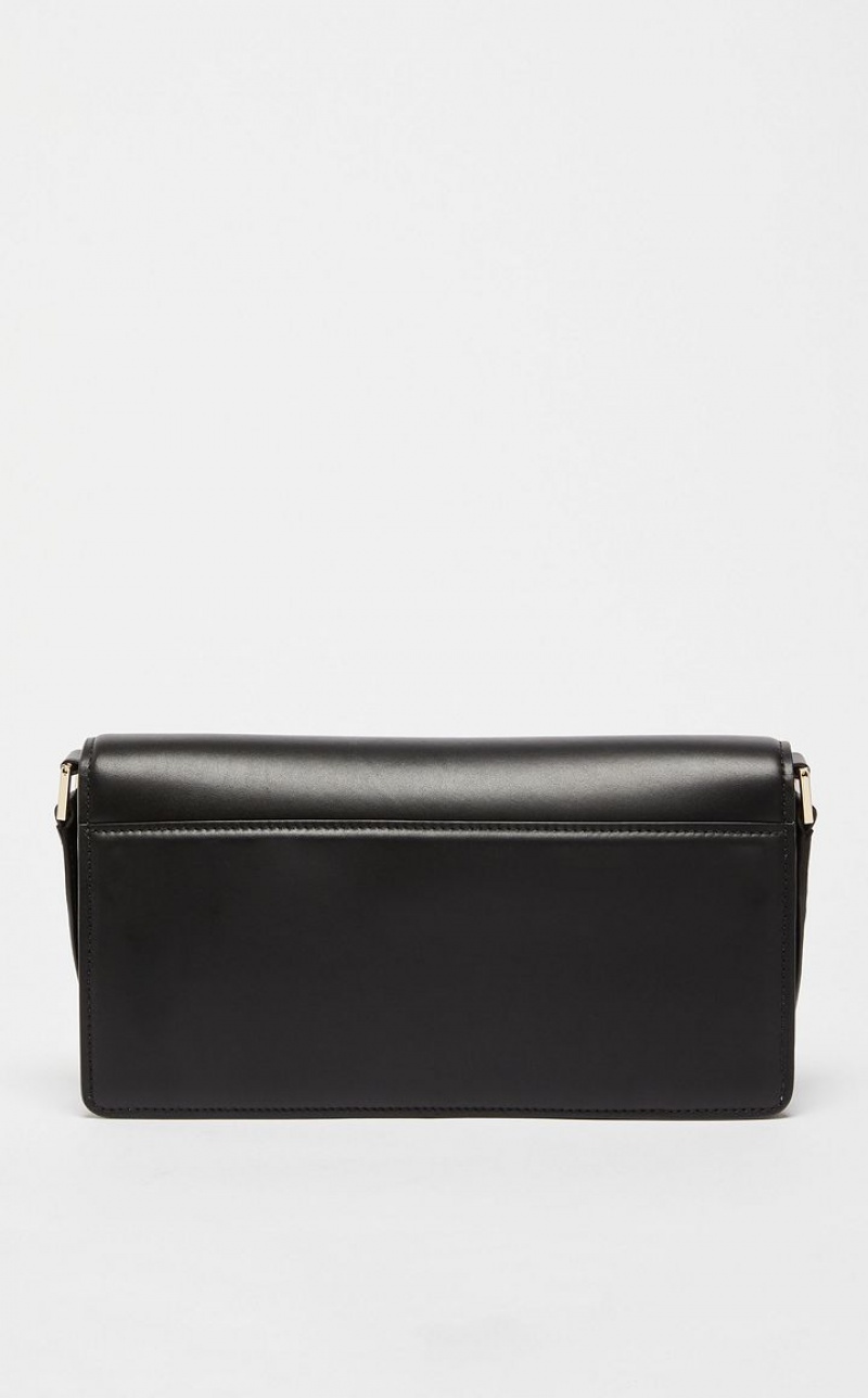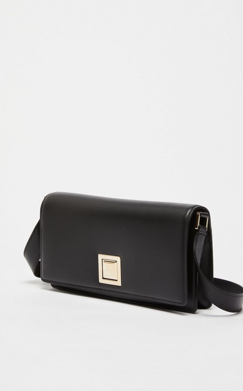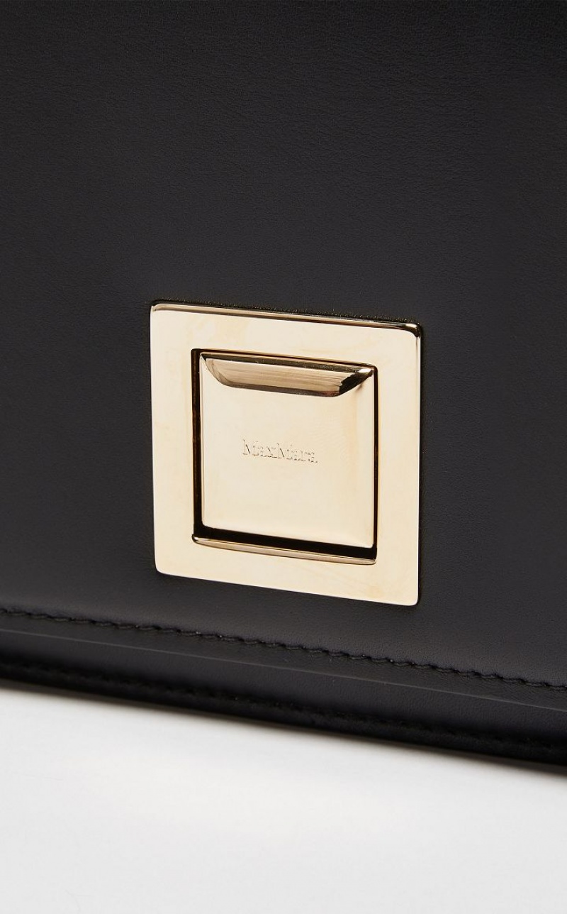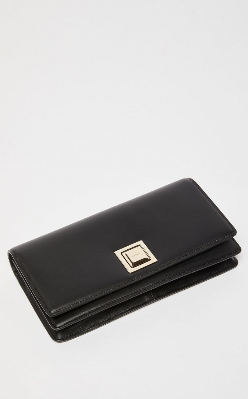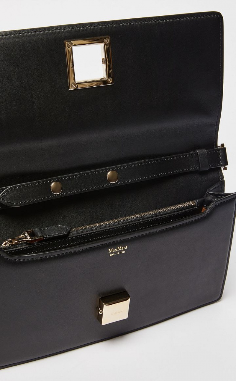 MM clutch bag in smooth matte calfskin with a characteristic rectangular shape. The square styling and geometric metal clasp are a nod to the architecture of the Max Mara headquarters. The interior is organised into two gusseted compartments with a zip pocket in the centre. The wide, seventies
