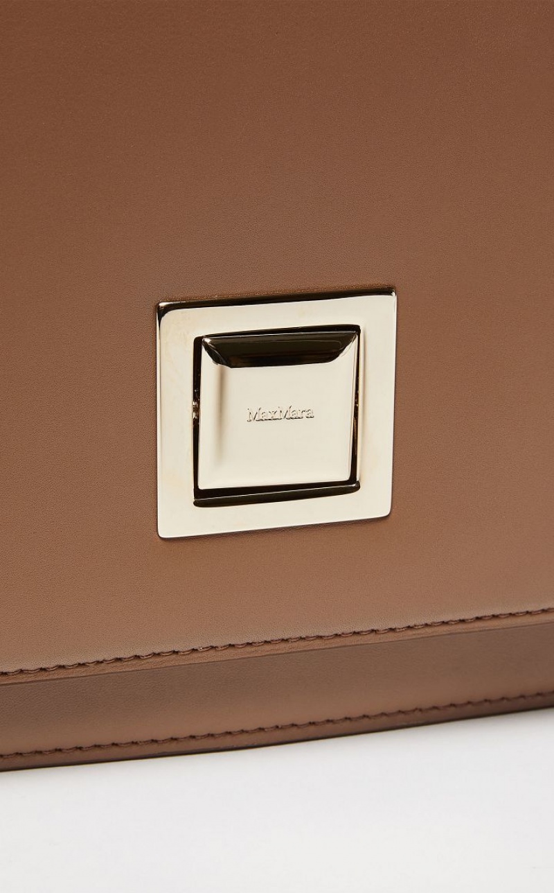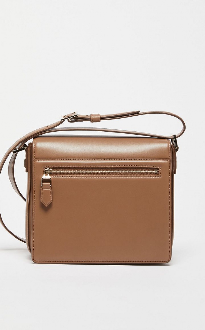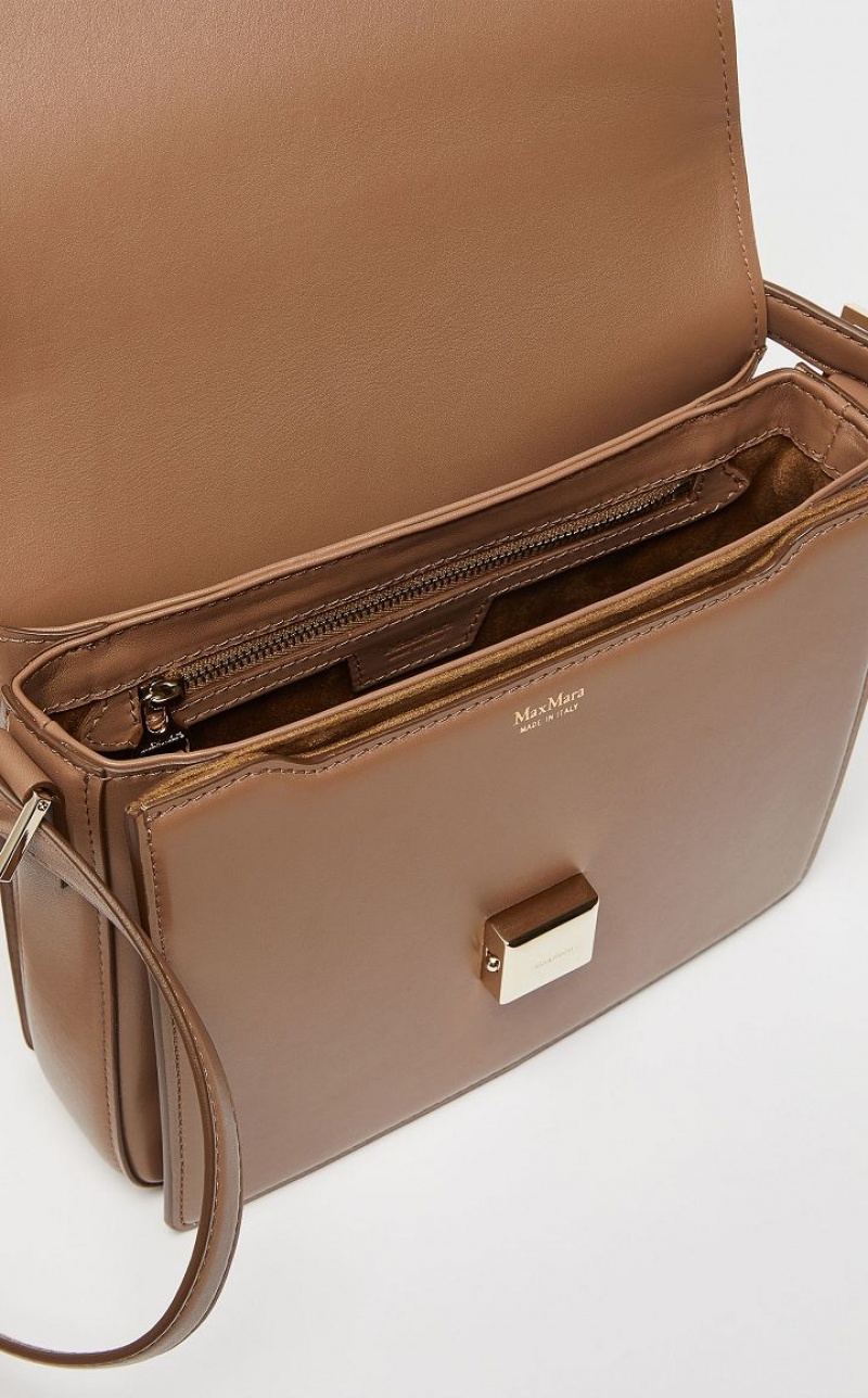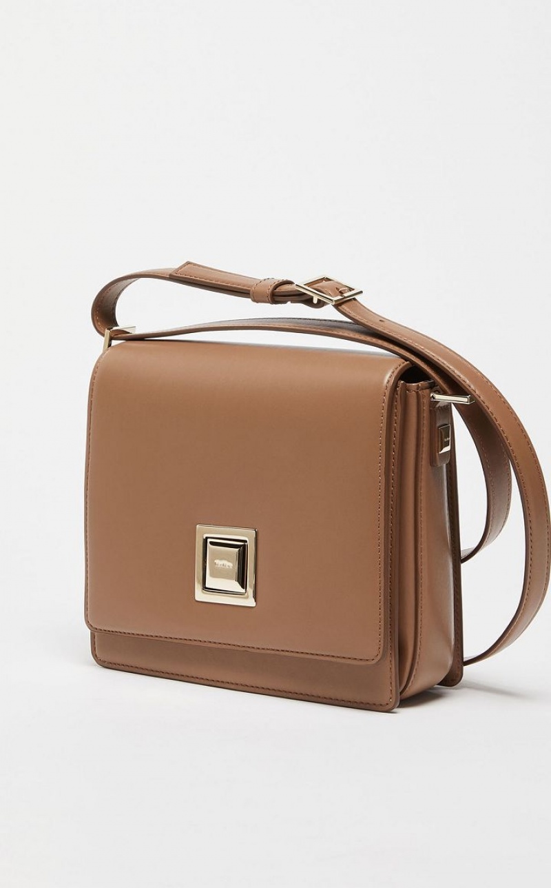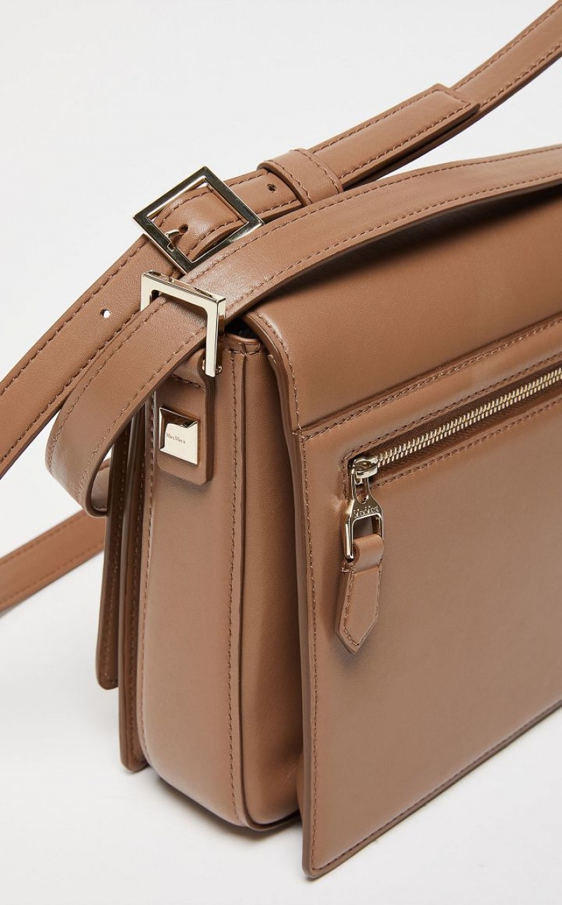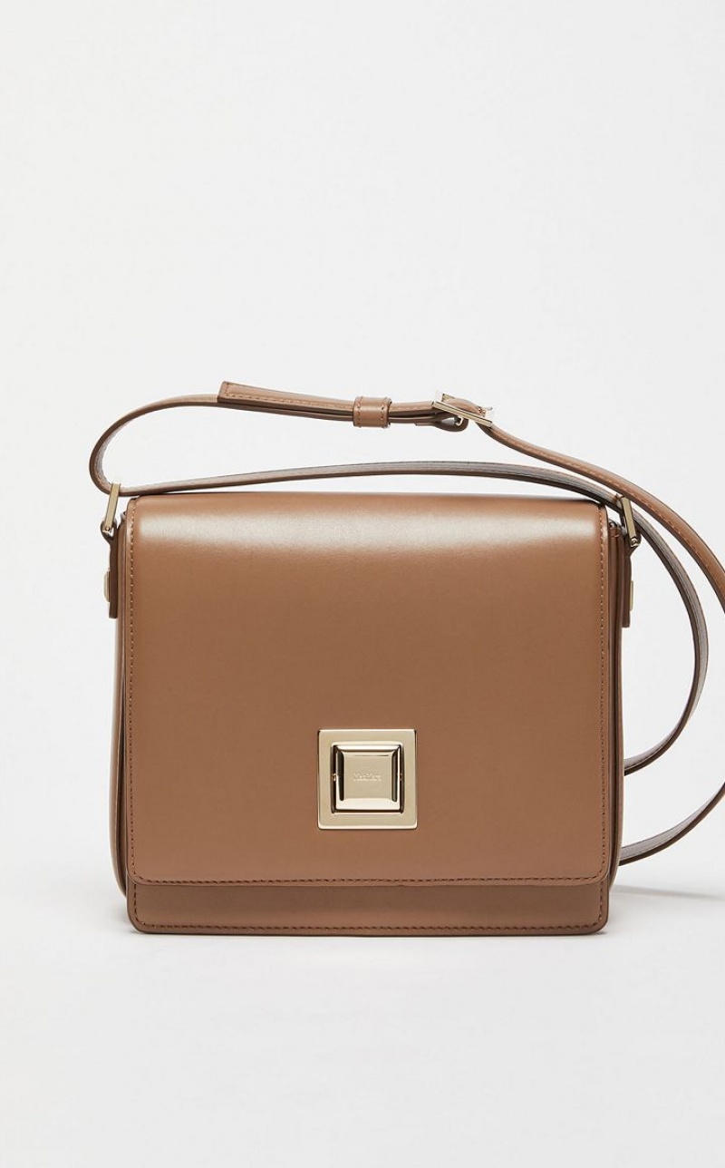 Medium sized MM Bag in smooth matte calfskin. The distinctive square shaped design, square models and geometric metal clasp are reminiscent of the Max Mara headquarters’ architecture. The suede effect interior is divided into two gusseted compartments with a zipped pocket. Complete with a pocket on the back and an adjustable shoulder strap for on the shoulder or crossbody wear. Button fastening. Size: 22 x 9 x 22 cm.