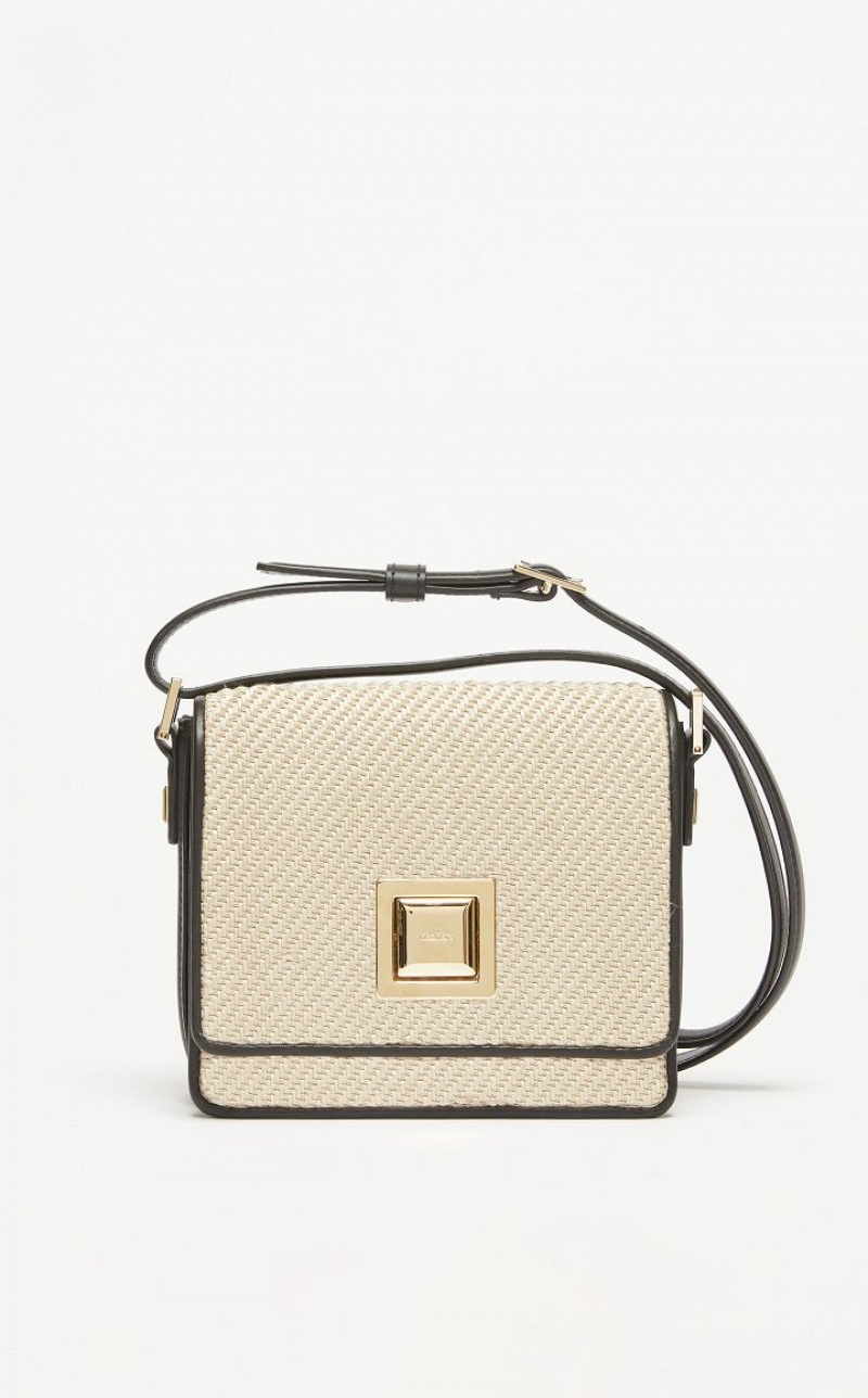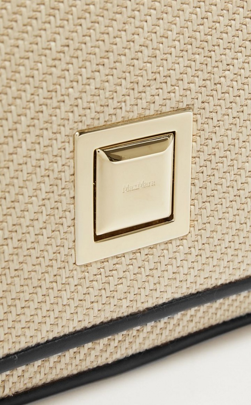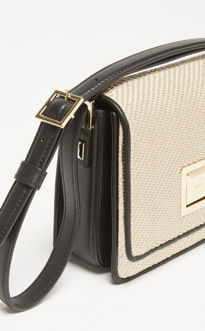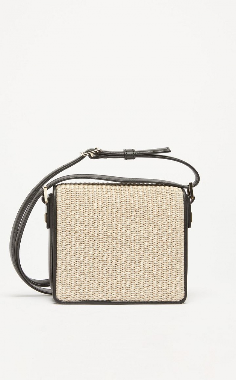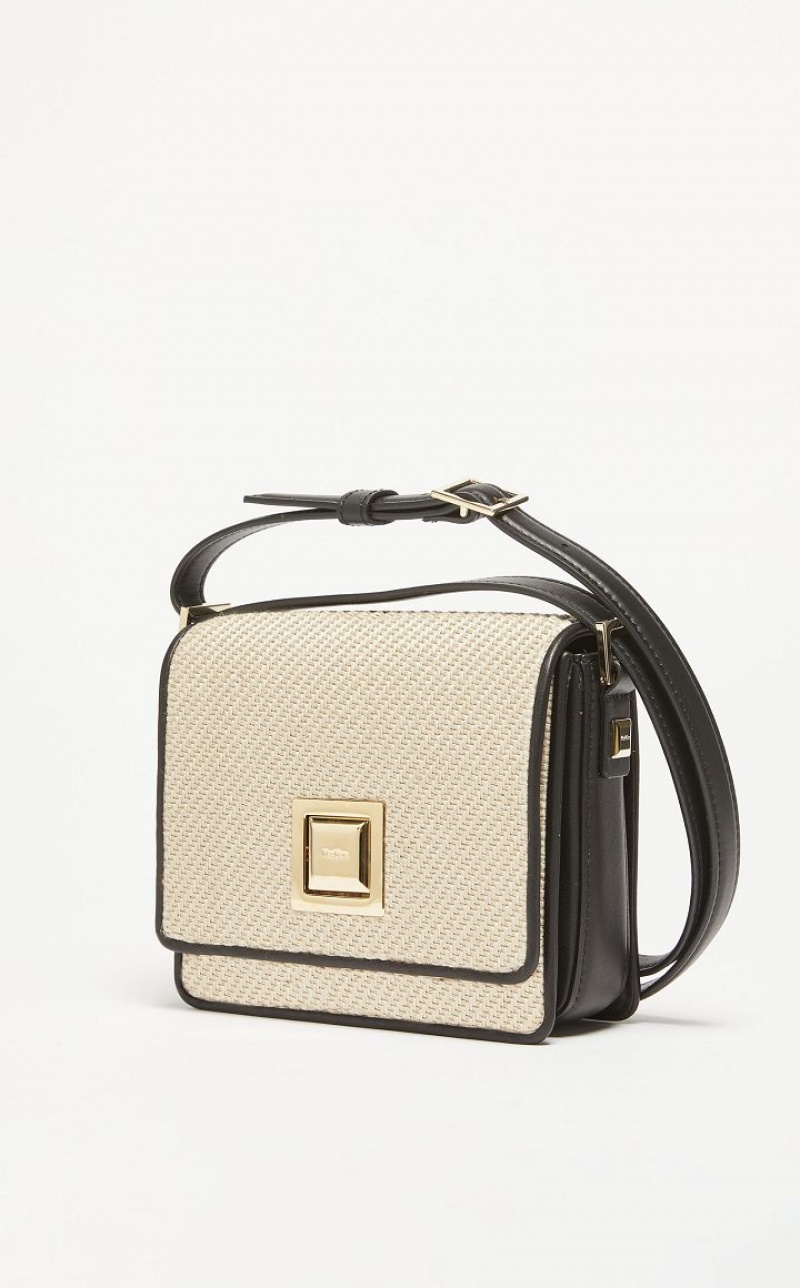 Small MM Bag in smooth leather and raffia effect fabric, with a two toned twill texture. The typical square shape, square styling and geometric metal clasp are a nod to the architecture of the Max Mara headquarters. The suede effect fabric interior is organised into two gusseted compartments with an edged pocket. Adjustable strap for wearing over the shoulder or crossbody. Snap fit button fastening. <BR/>Measurements: 18 x 7 x 17 cm.